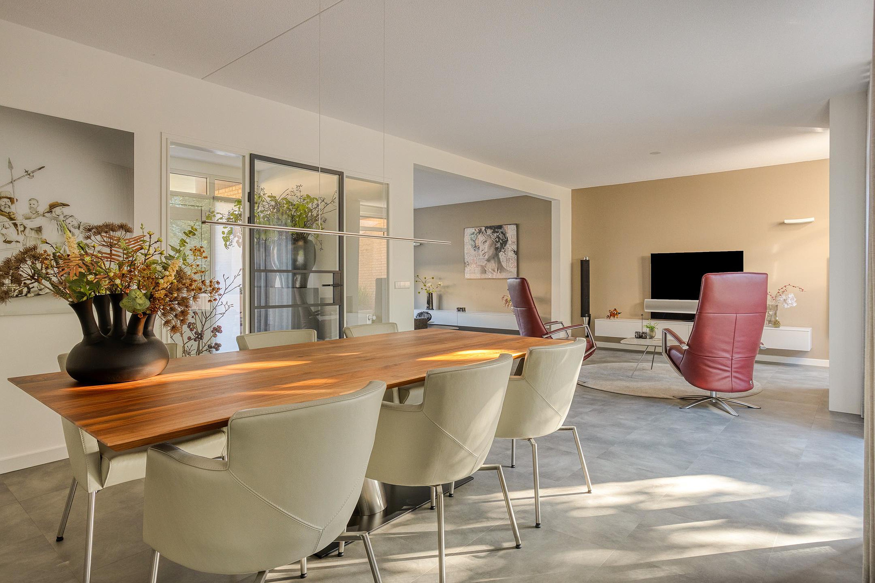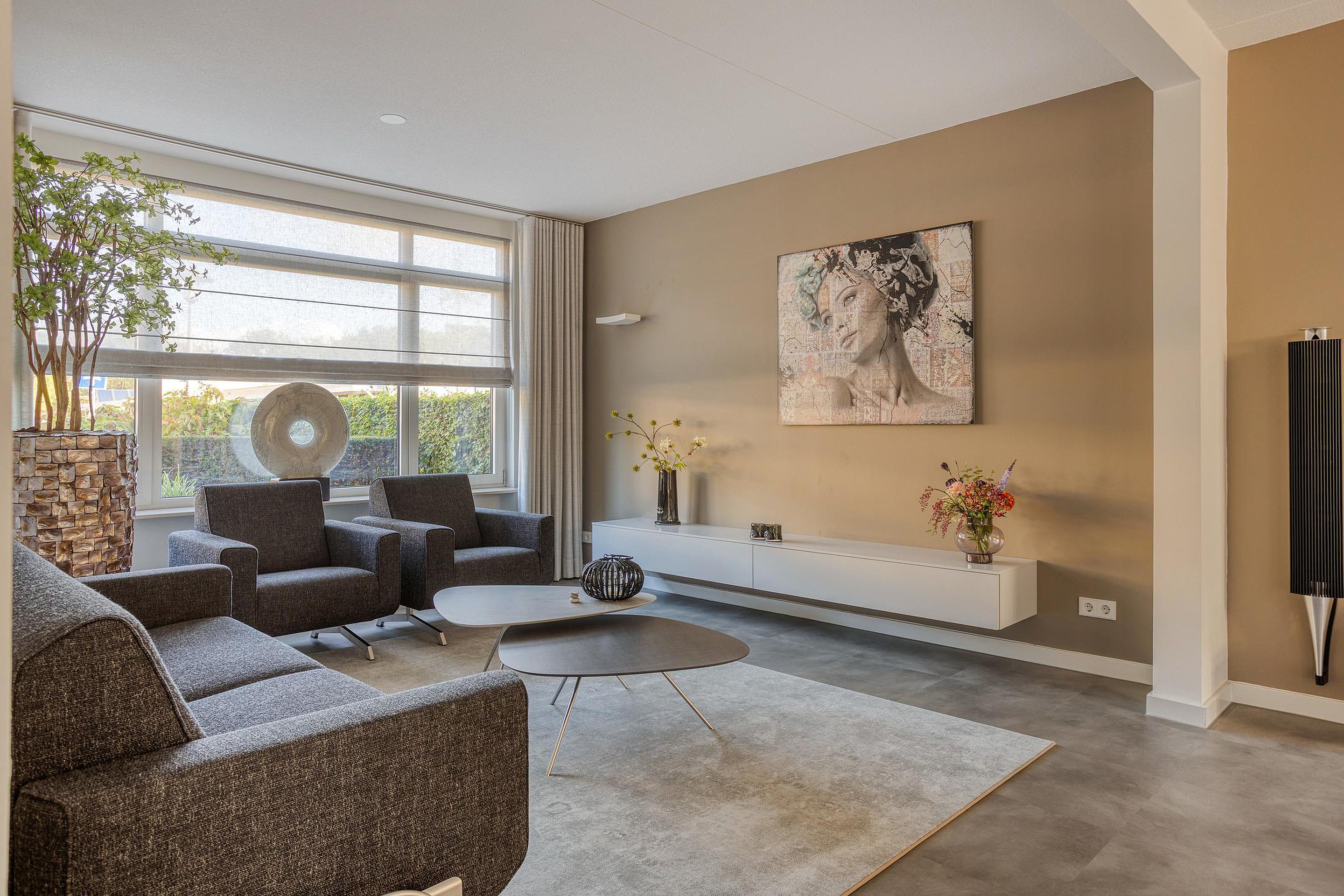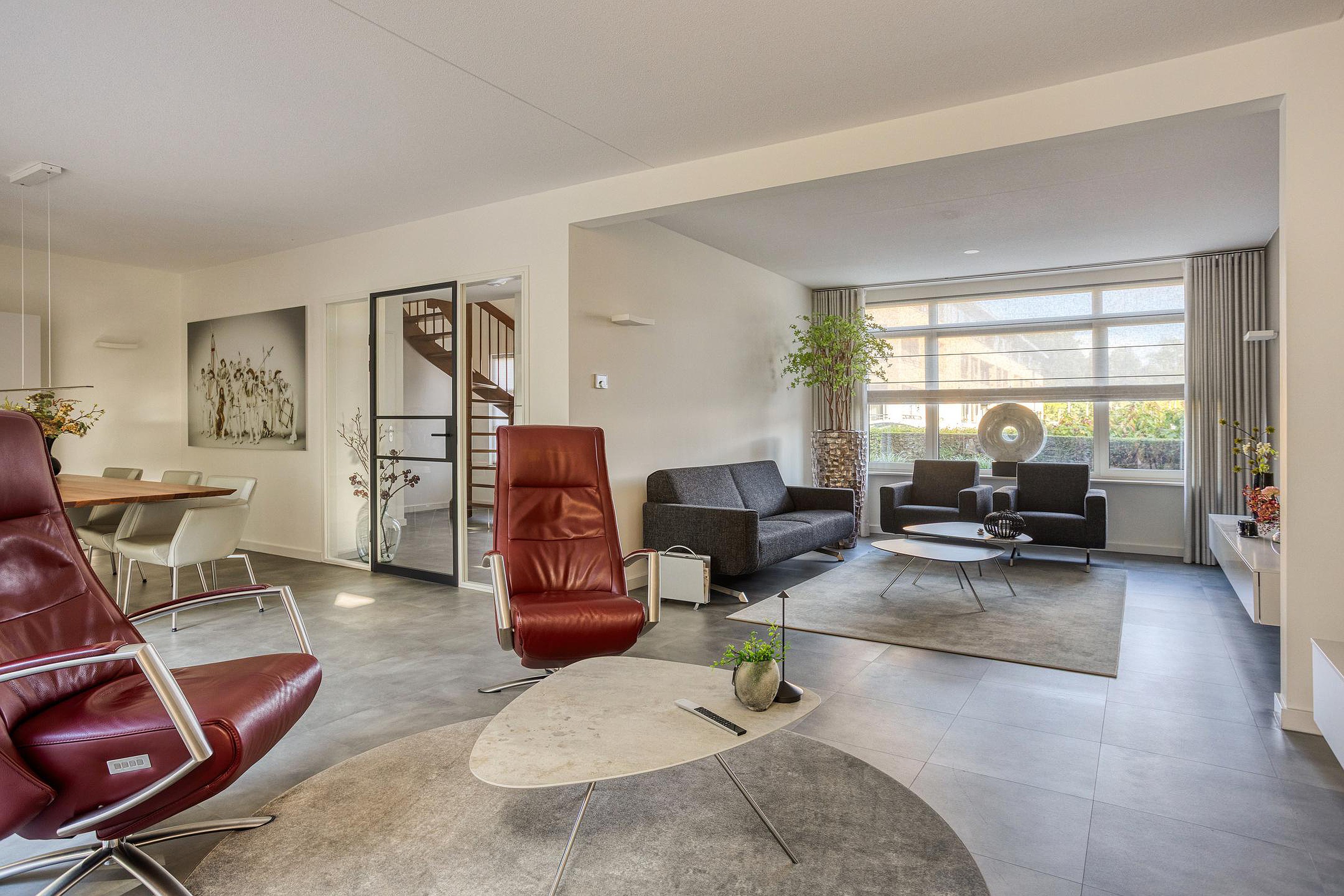De woonkamer is ruim en in een L-vorm. De vloer is afgewerkt met grote PVC-tegels die doorlopen vanuit de hal. Grote raampartijen en openslaande tuindeuren zorgen voor veel licht en een fijne verbinding met de tuin. Er is plaats voor een royale eethoek en meerdere zithoeken. De woonkamer heeft een sfeervolle gashaard (2022).