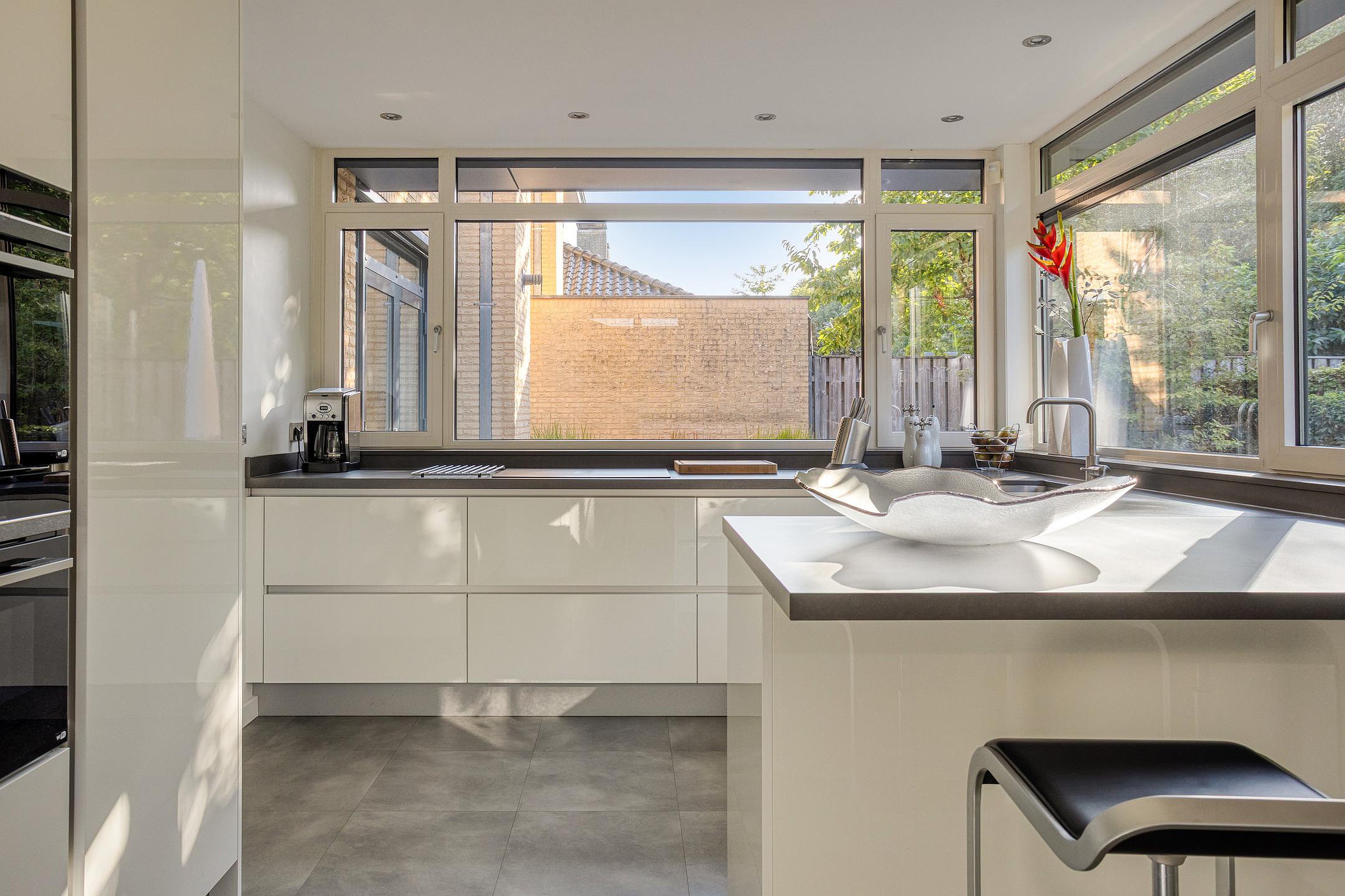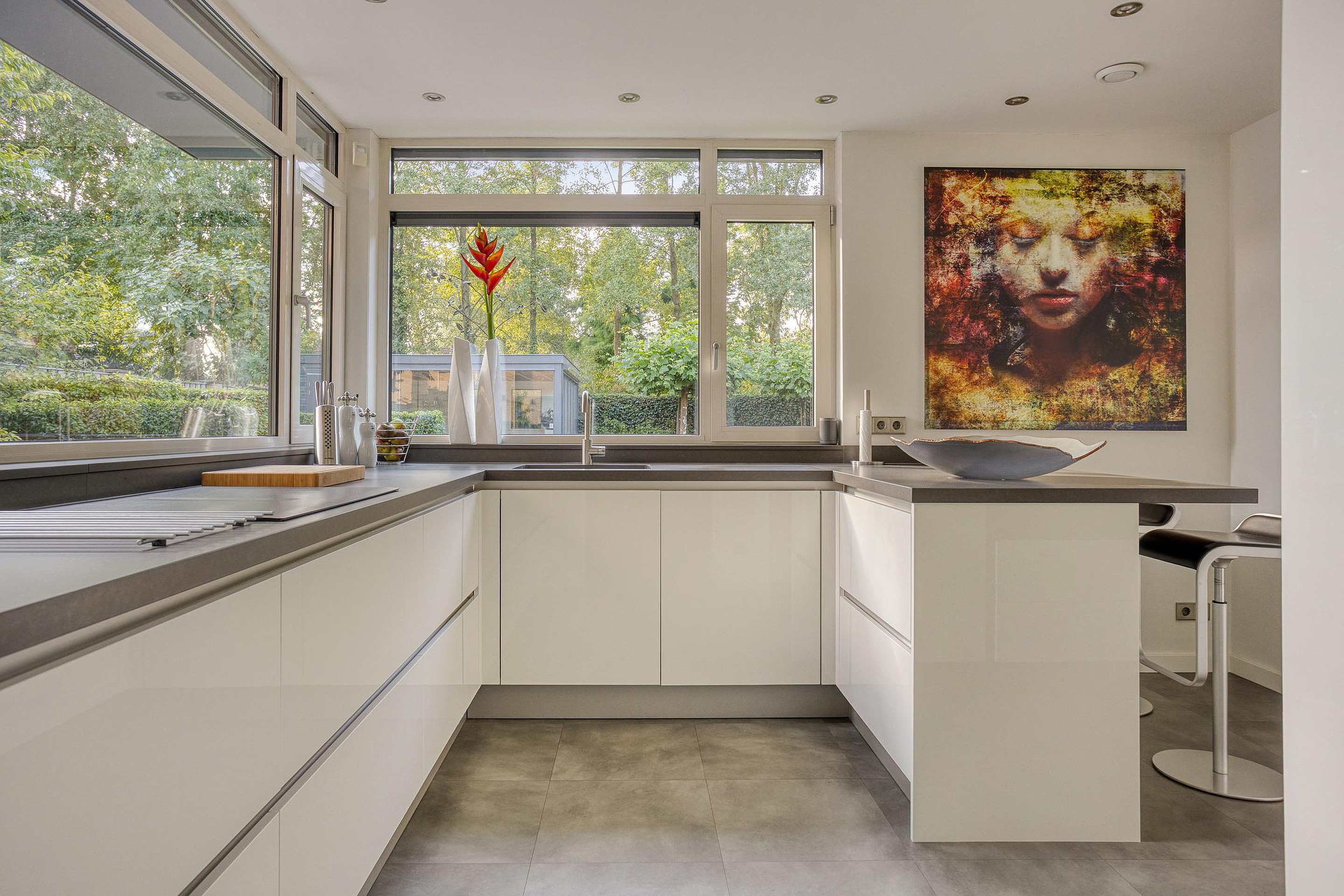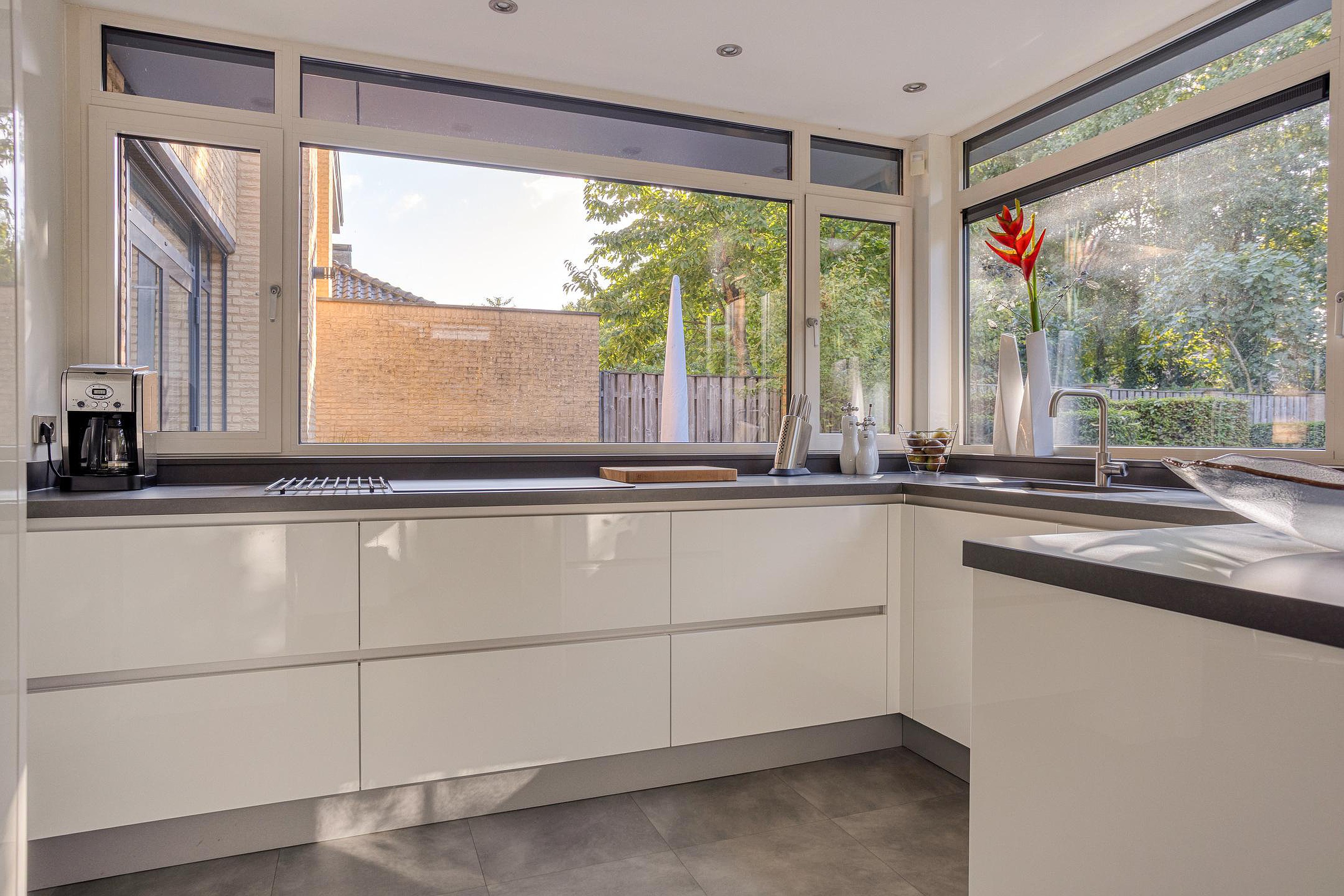 De keuken heeft een hoekopstelling met veel werk- en bergruimte. Voorzien van een inductiekookplaat met geïntegreerde afzuiging, combi-oven/magnetron, stoomoven, grote koelkast en diepvries. Er is een aansluiting voor een vaatwasser. Het hoekraam geeft mooi zicht op de tuin.