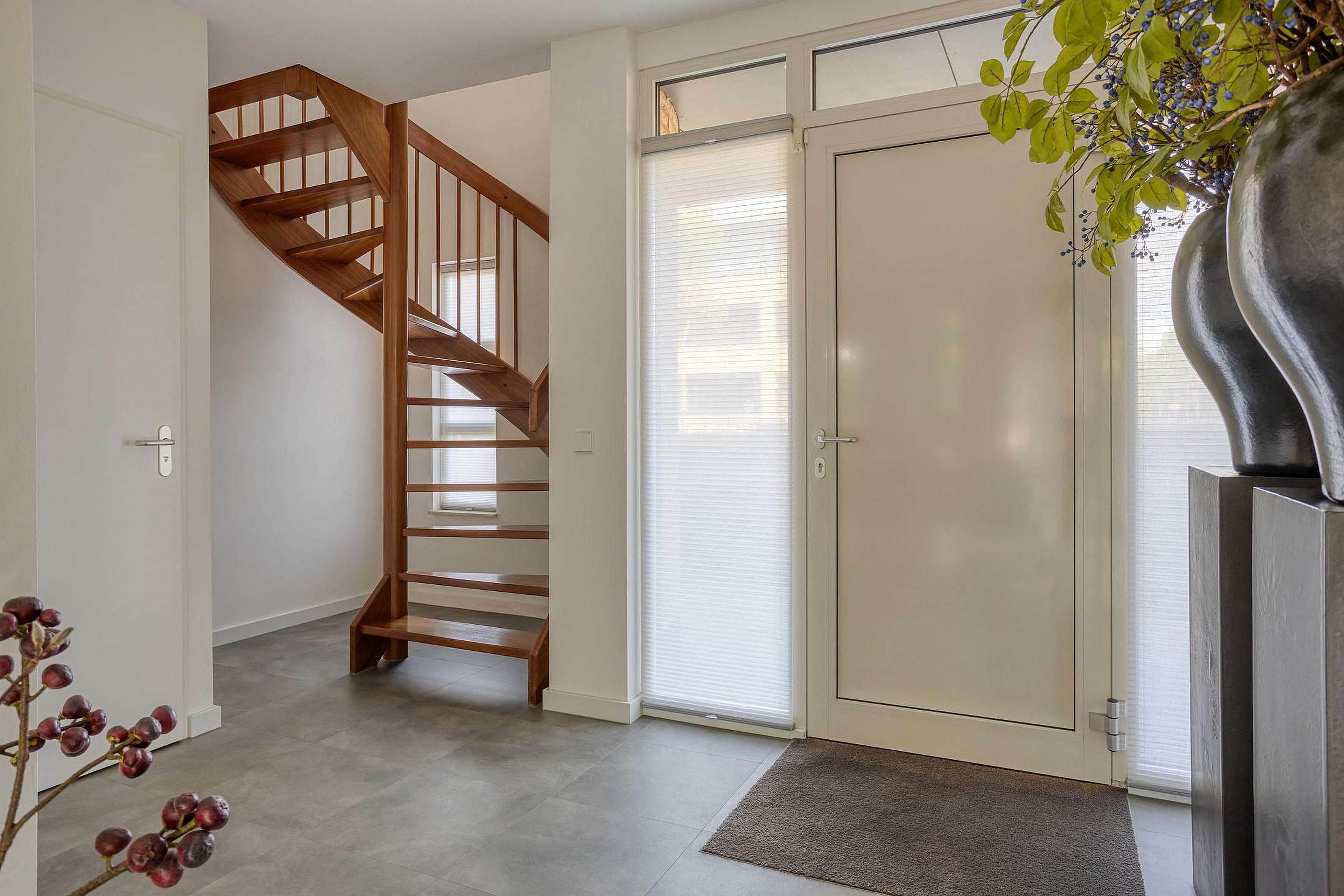 De hal heeft meerdere hoge ramen die zorgen voor lichtinval. De stevige hardhouten trap leidt naar de eerste verdieping. Via een glazen stalen deur, met aan weerszijden ramen, stap je de woonkamer in. Dit geeft direct een lichte en open indruk.