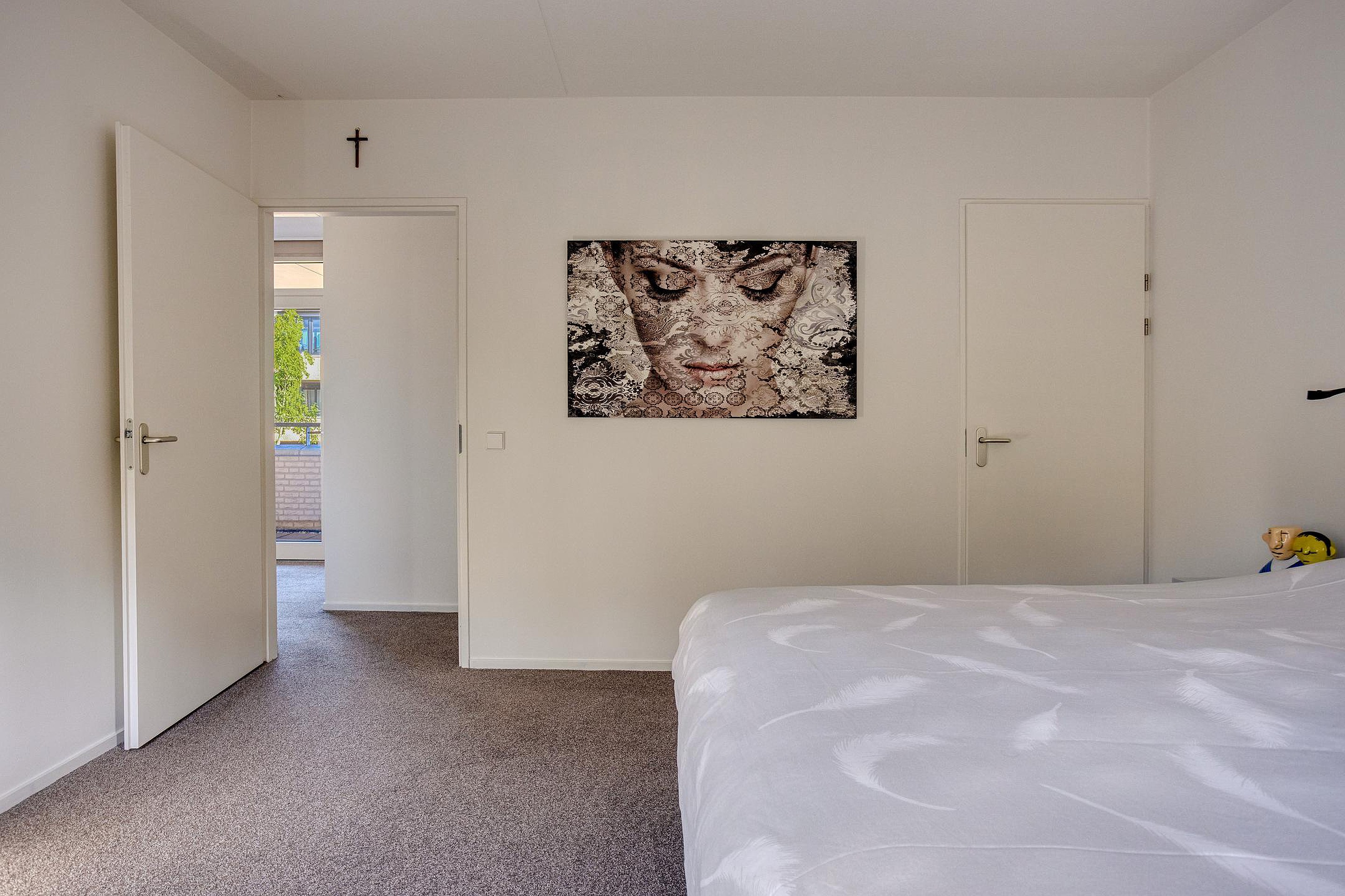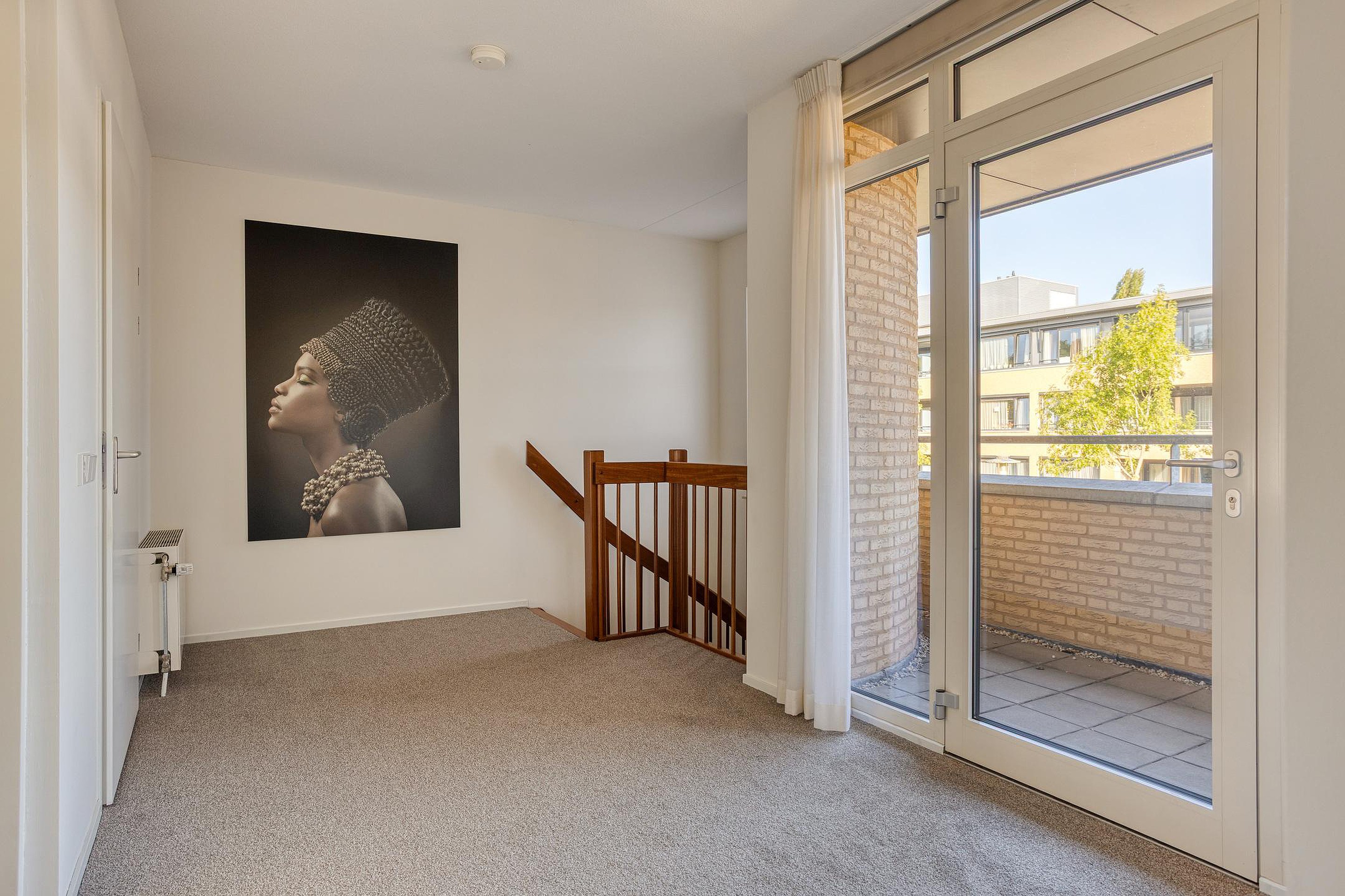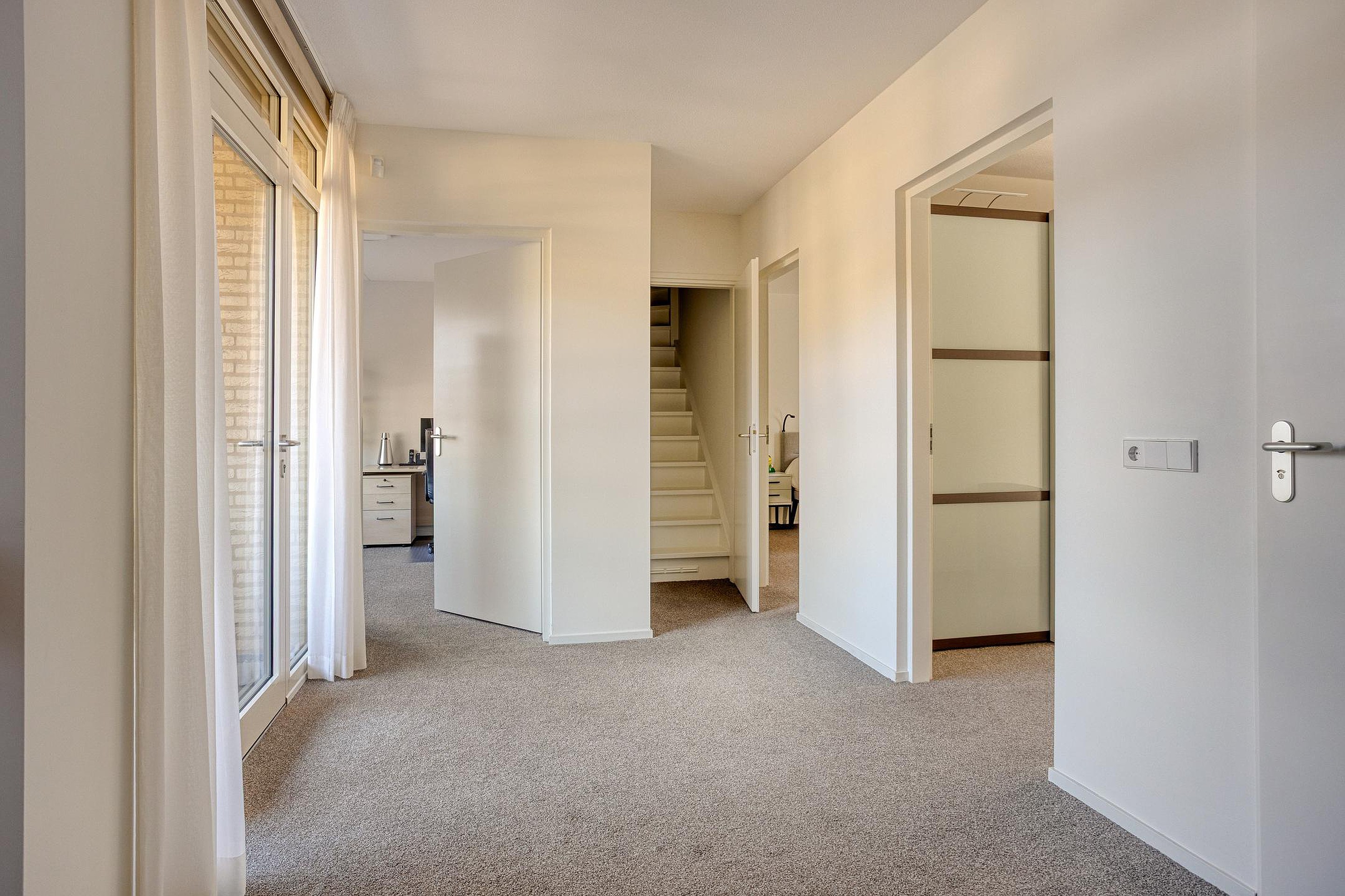 Vanaf de overloop is er toegang tot een overdekt balkon aan de voorzijde. Alle wanden zijn strak gestuukt en de verdieping is voorzien van vloerbedekking.