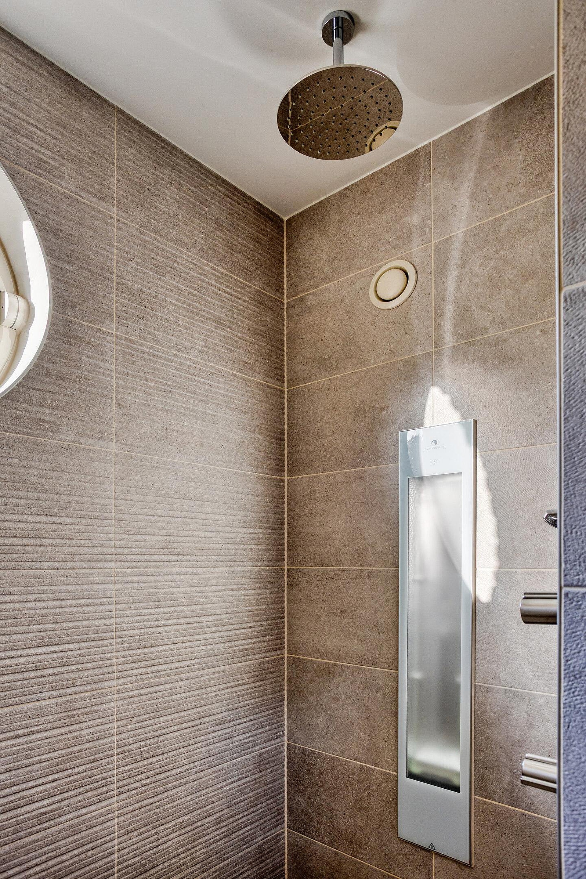 De badkamer is modern betegeld en compleet uitgerust. Er is een ruime inloopdouche met regendouche, een enkele wastafel, een radiator en een tweede toilet. In de wand zit een ingebouwde Sun shower dat zorgt voor extra comfort.