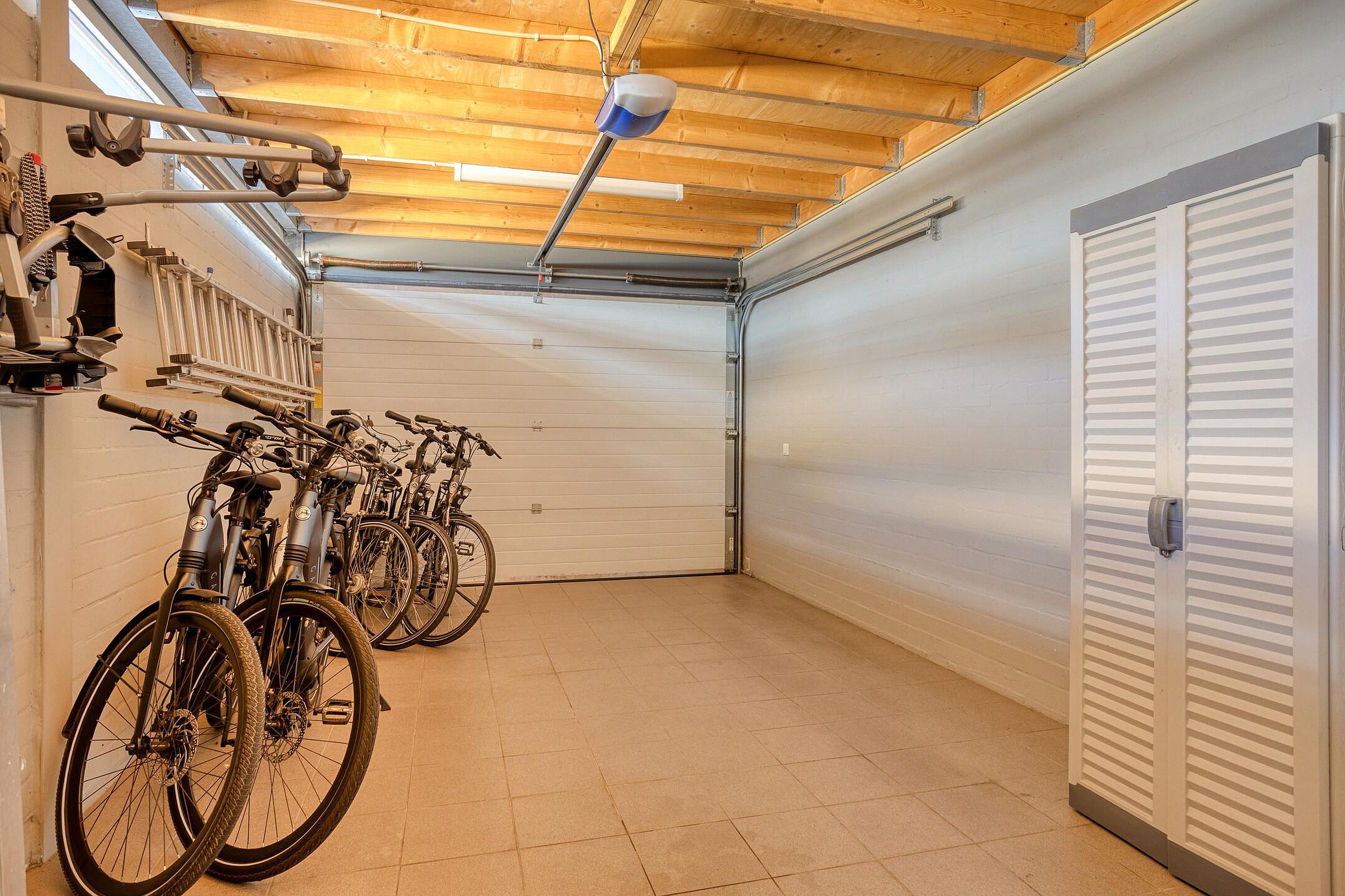 De garage is inpandig bereikbaar en ruim genoeg voor een auto. Er is een elektrische sectionaaldeur met afstandsbediening. Boven de garage én boven de bijkeuken is een ruime berging bereikbaar via een losse trap.