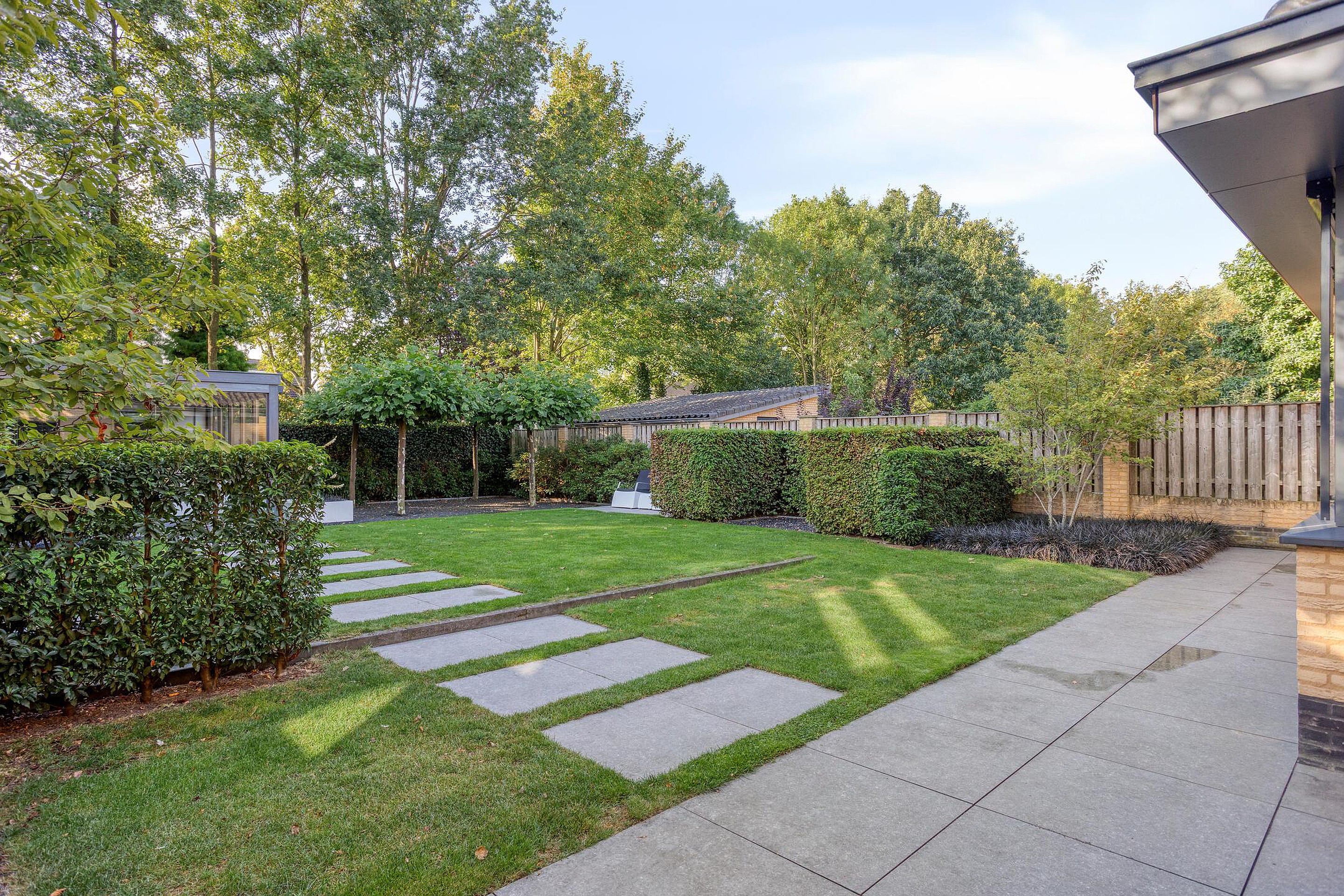 Ook de voortuin is onder architectuur aangelegd. Netjes onderhouden en passend bij de uitstraling van het huis. Via een poort en zijpad is de achtertuin bereikbaar.