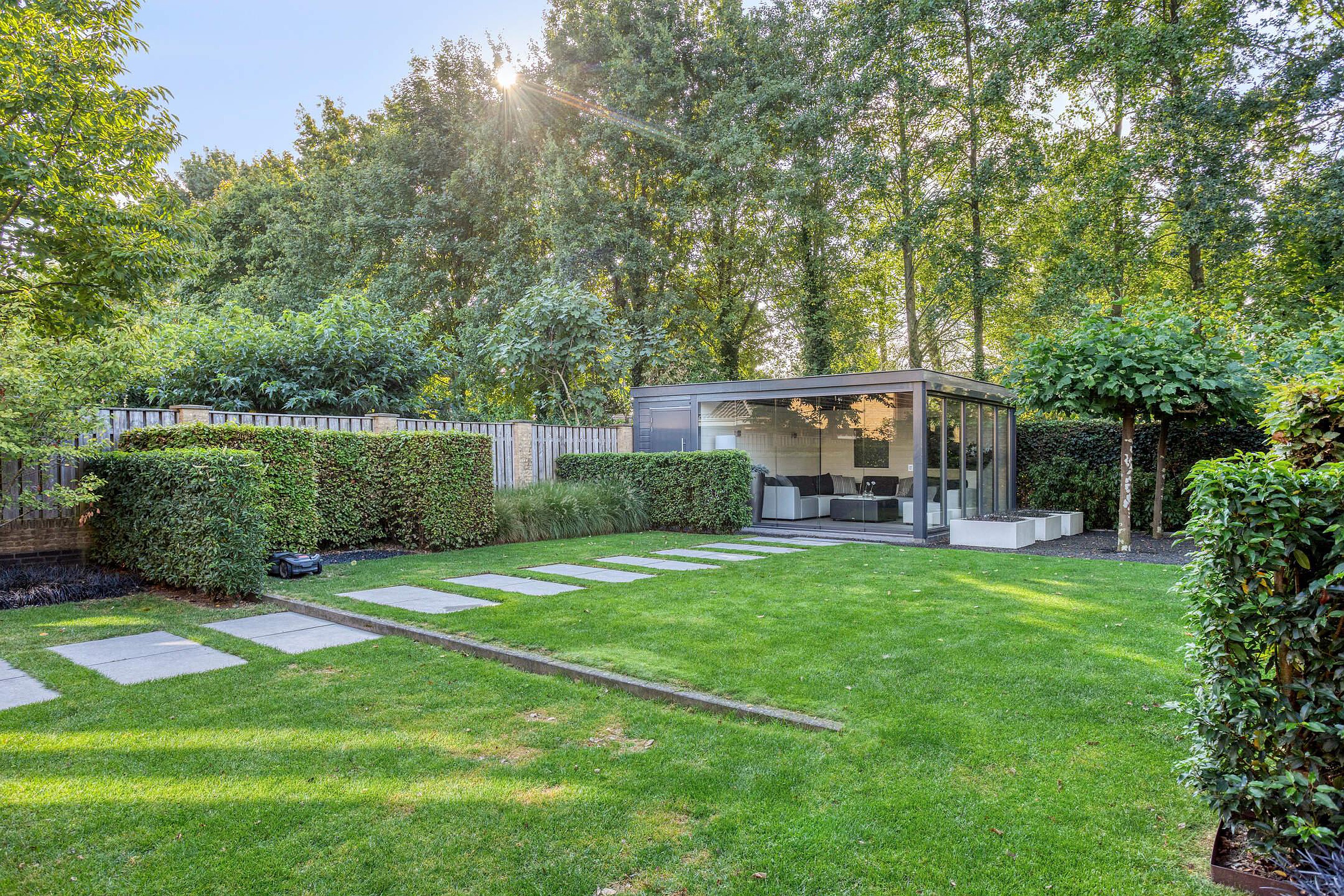 De tuin heeft een beregeningsinstallatie onder het gazon, een buitenkraan en meerdere elektrapunten. Blikvanger is de tuinkamer met glazen wanden: een fijne plek om het hele jaar door buiten te genieten. Naast de tuinkamer is een berging voor tuinmeubels.