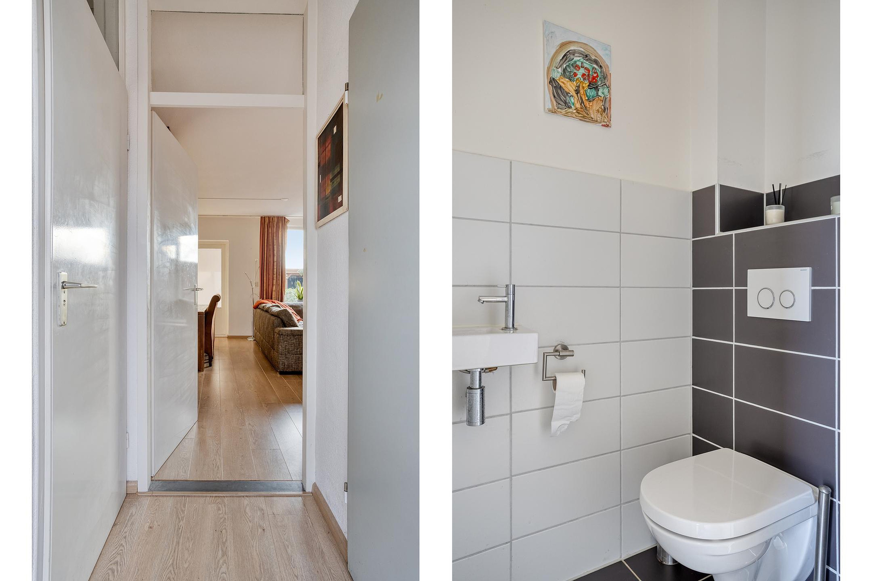 Begane grond Entree/hal met meterkast en toegang tot de toiletruimte, keuken en woonkamer. De moderne, gedeeltelijk betegelde toiletruimte is vernieuwd in 2020 en is voorzien van een wandcloset en een fonteintje.