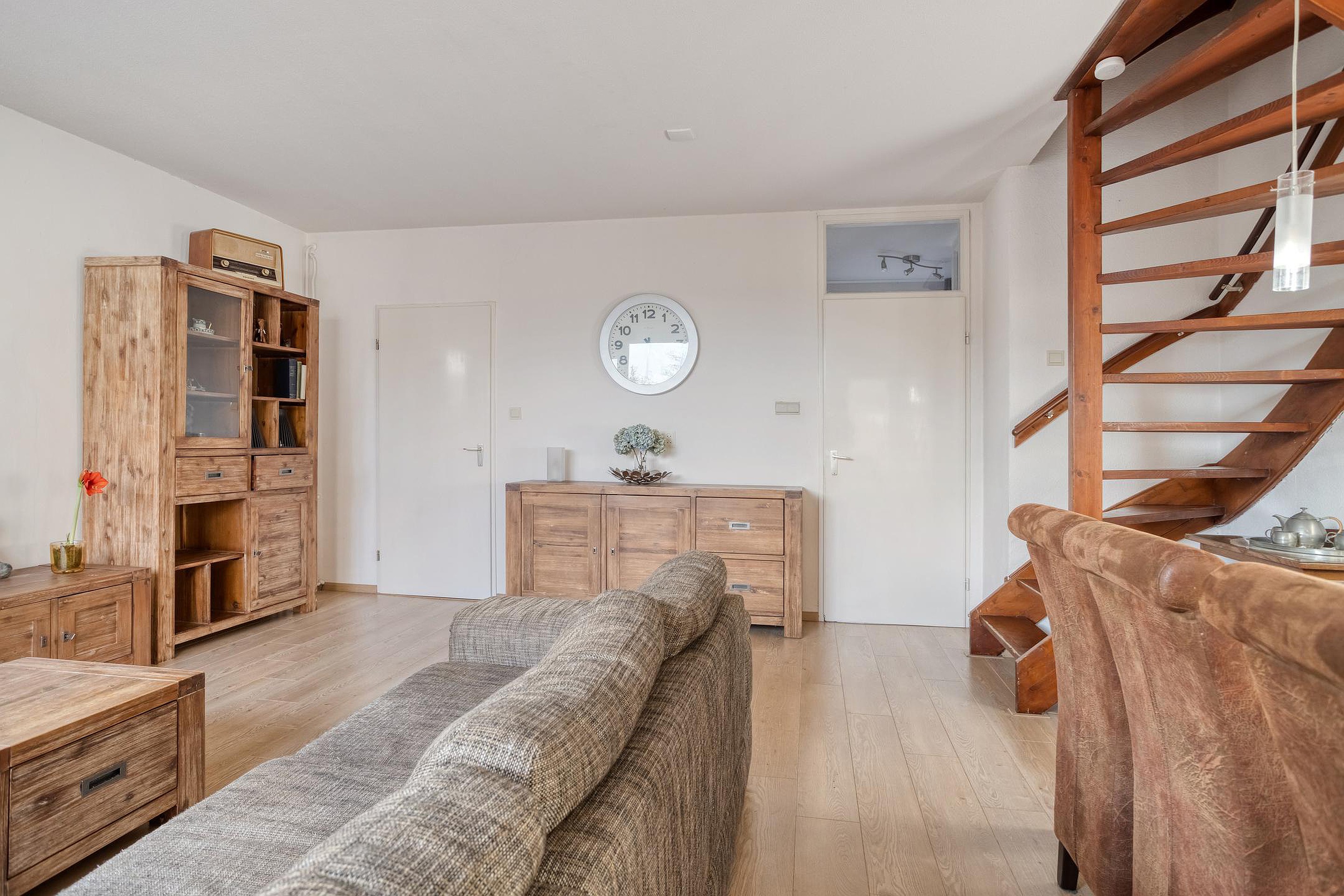 Gezellige woonkamer met laminaatvloer en open houten trap naar de eerste verdieping. Vanuit de woonkamer toegang tot de keuken en een tochtportaal.