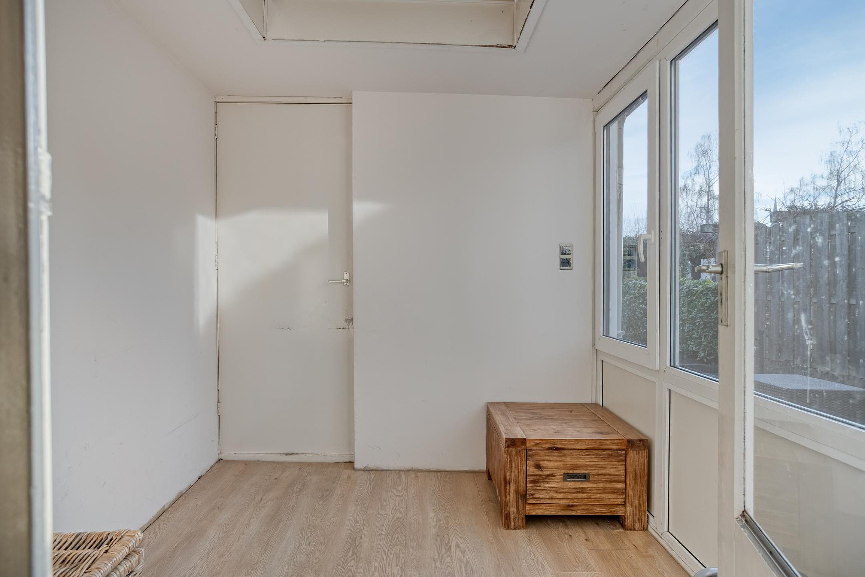 Via dubbele openslaande deuren toegang tot het tussenportaal. Het portaal is voorzien van een laminaatvloer, een lichtkoepel, een raam en loopdeur naar de berging.