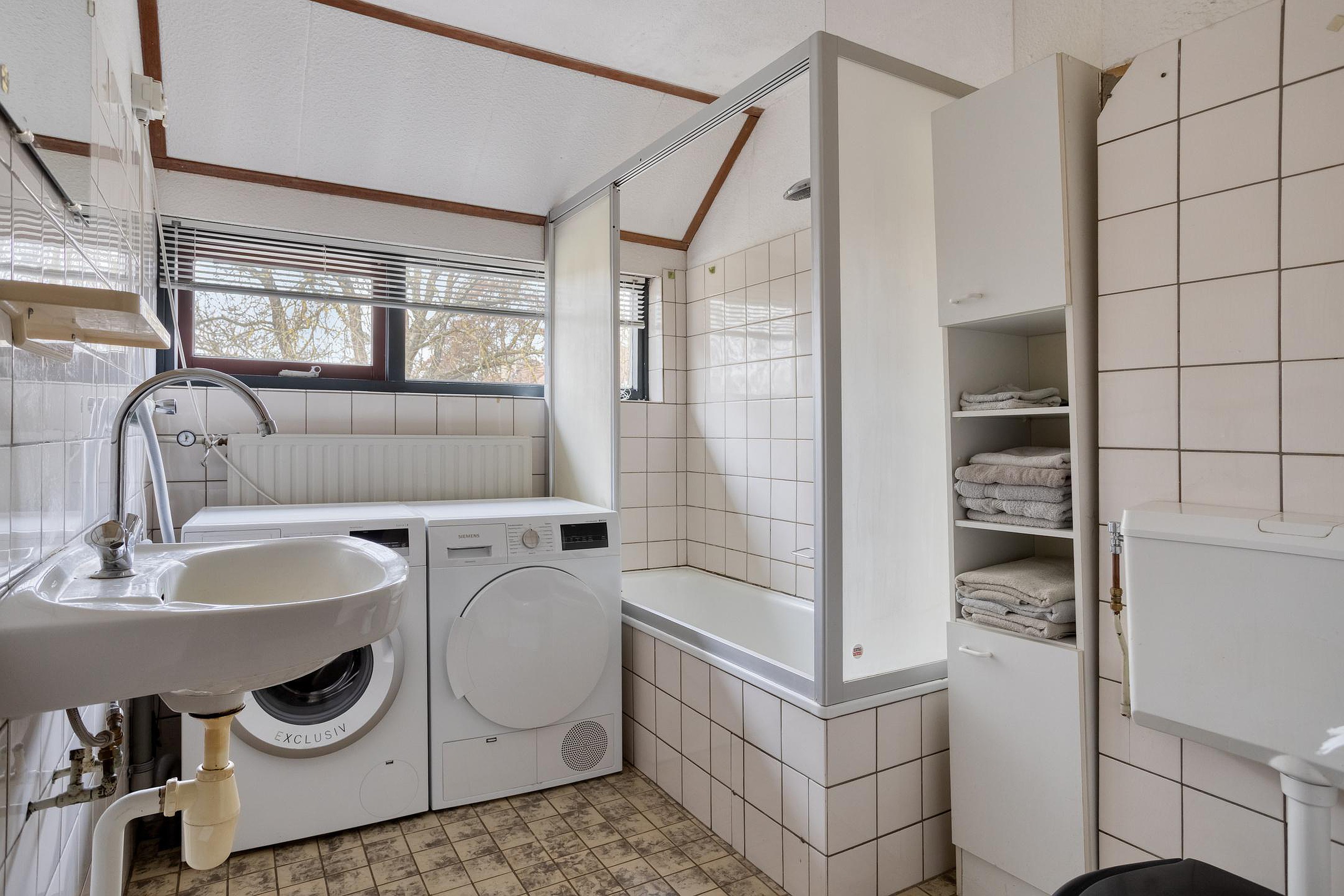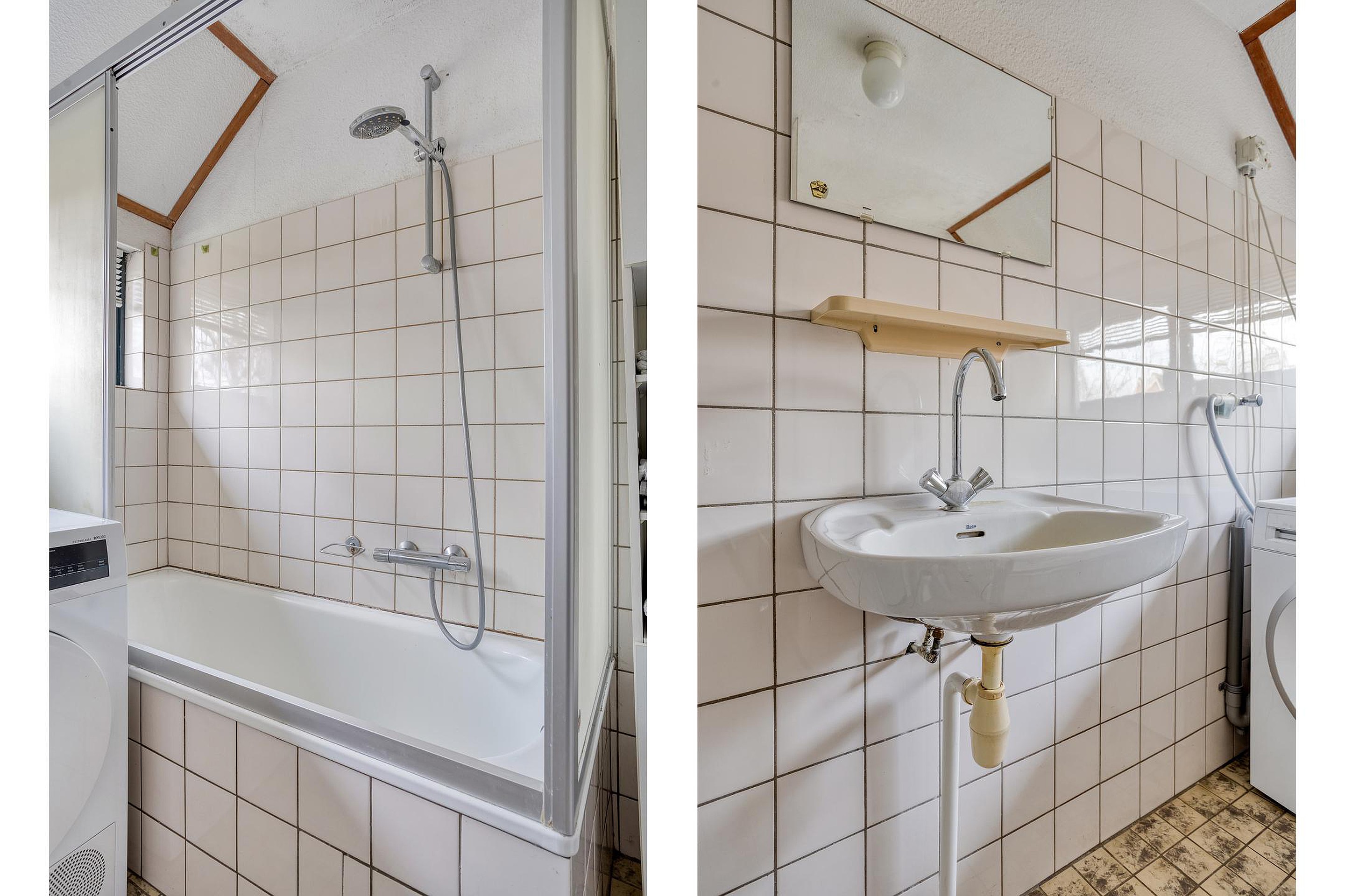 De ruime badkamer is grotendeels betegeld en voorzien van een ligbad met douchescherm, duoblok toilet, wastafel, radiator, aansluitingen ten behoeve van de wasapparatuur en een raam voor natuurlijke ventilatie en daglichttoetreding. De badkamer dient gemoderniseerd te worden.