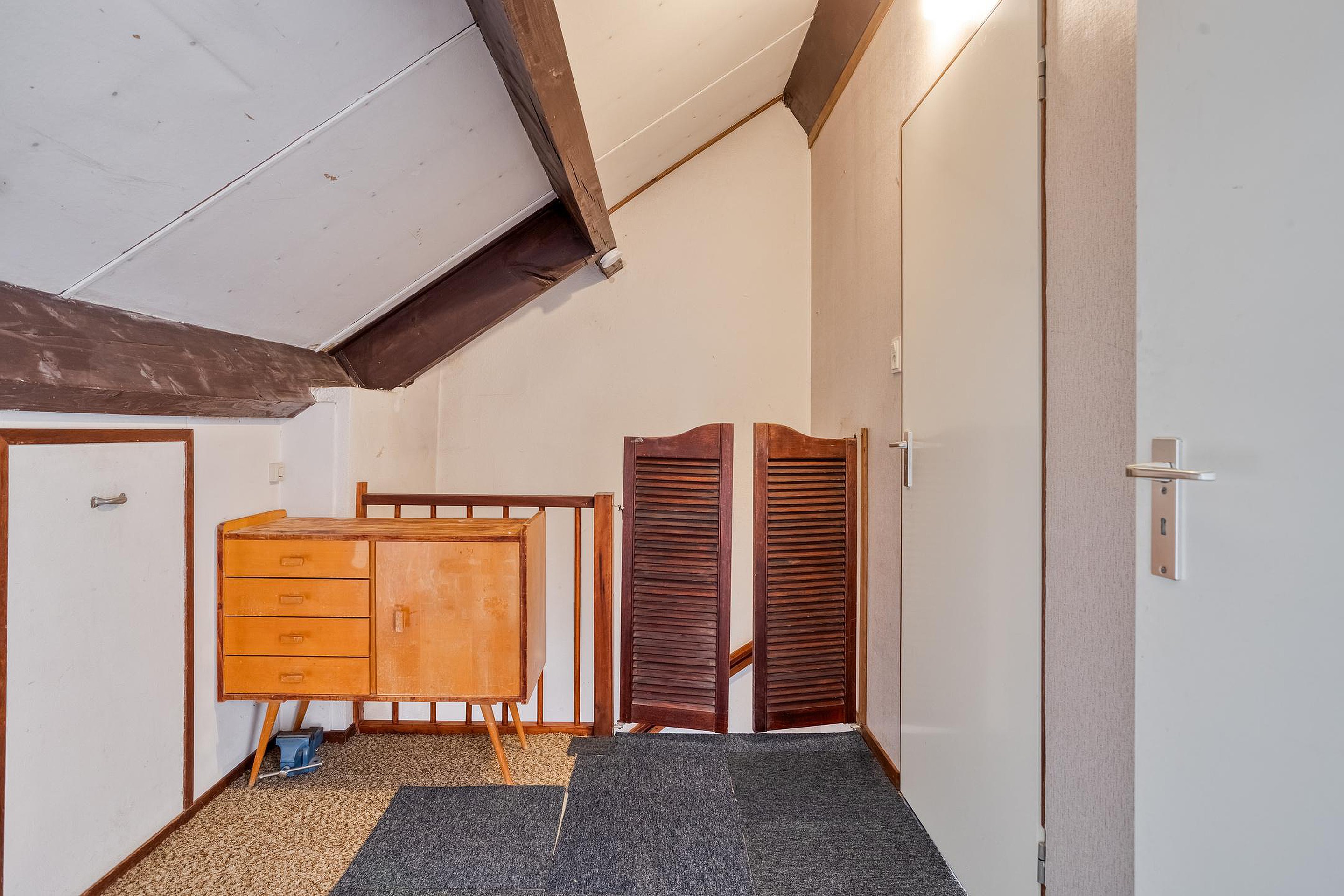 Tweede verdieping Overloop met bergruimte achter de knieschotten en toegang tot twee slaapkamers.