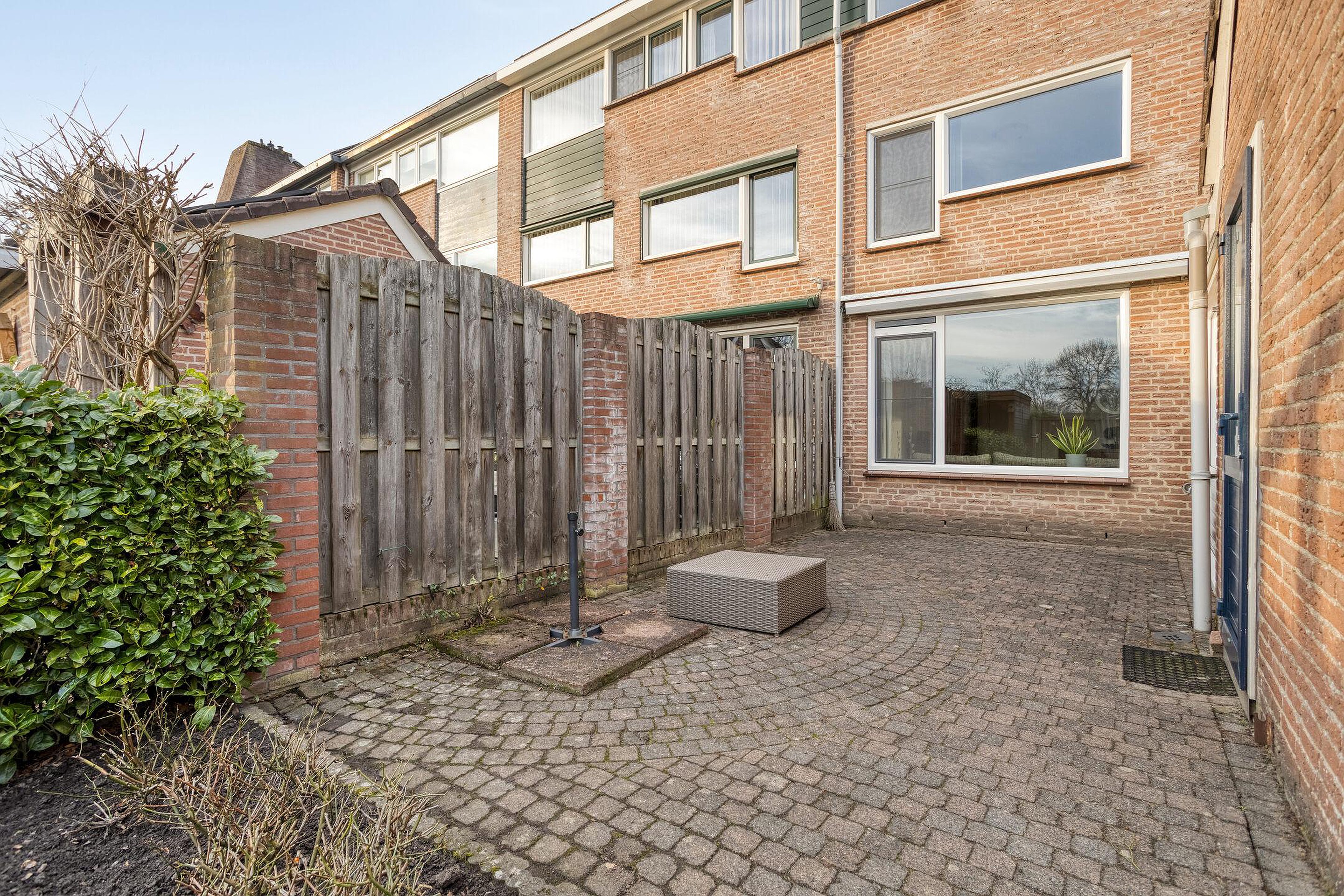 Tuin De zonnige, onderhoudsvriendelijke en privacy biedende achtertuin (ca. 14,50 x 6 m.) is voorzien van sierbestrating, diverse borders met meerjarige beplanting en een groot terras, grenzend aan de achtergevel met een hand bedienbaar zonnescherm. Aan de achterzijde van de tuin een poort naar de achtergelegen brandgang met aansluitend een speelveld en fiets-/wandelpaden.