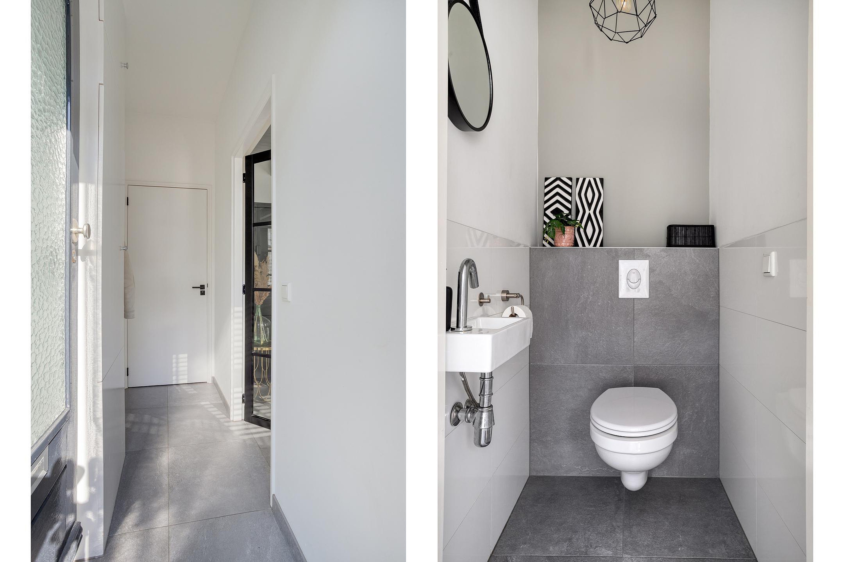 Hal met meterkast, toiletruimte en via een zwarte houten deur met glas toegang tot de woonkamer.