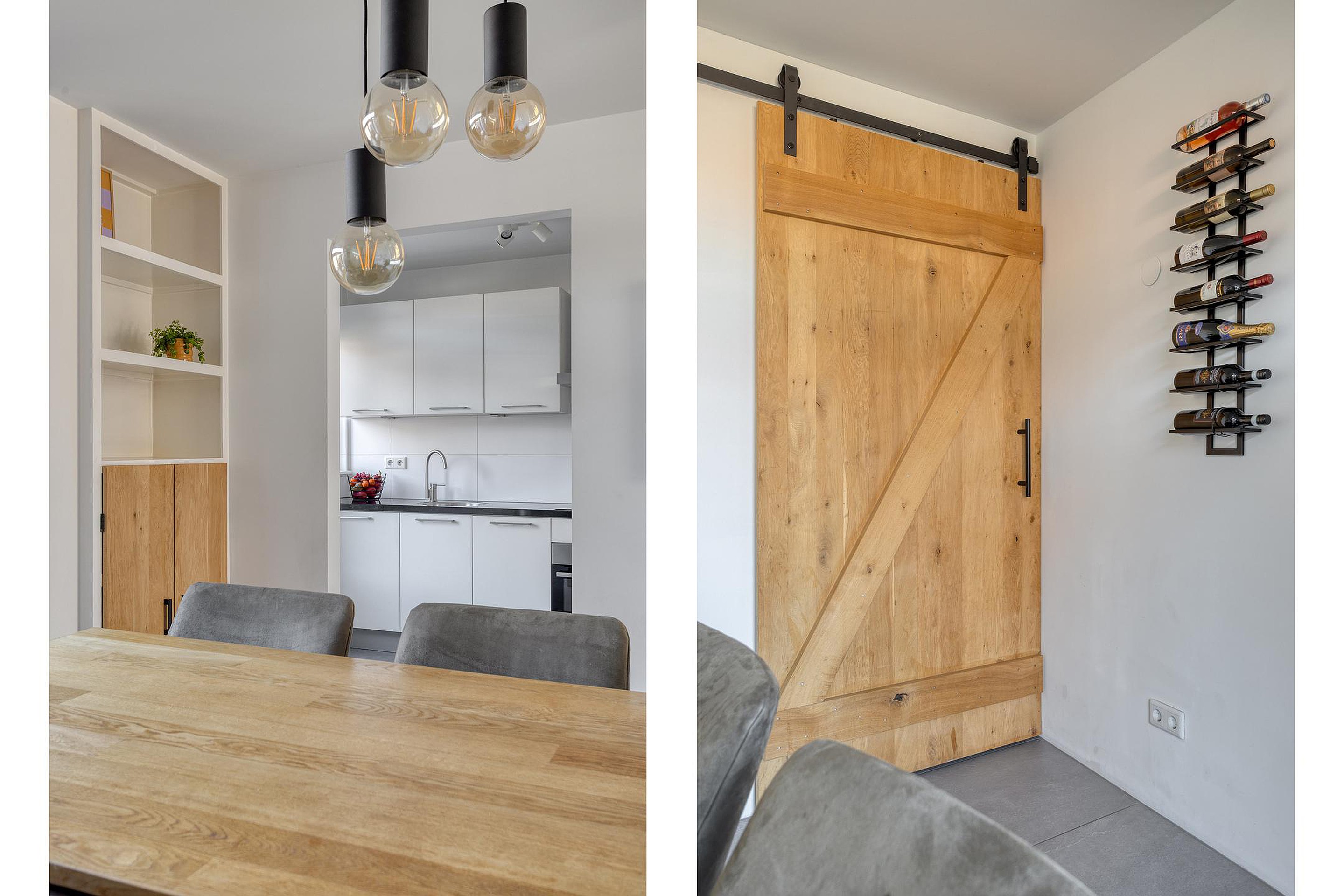 De eetkamer is praktisch ingedeeld en voorzien van een vaste kast en een ruime trapkast met houten schuifdeur, waarin de Intergas cv-ketel is geplaatst. Via openslaande tuindeuren is er direct toegang tot de achtertuin. De eetkamer staat in open verbinding met de keuken.