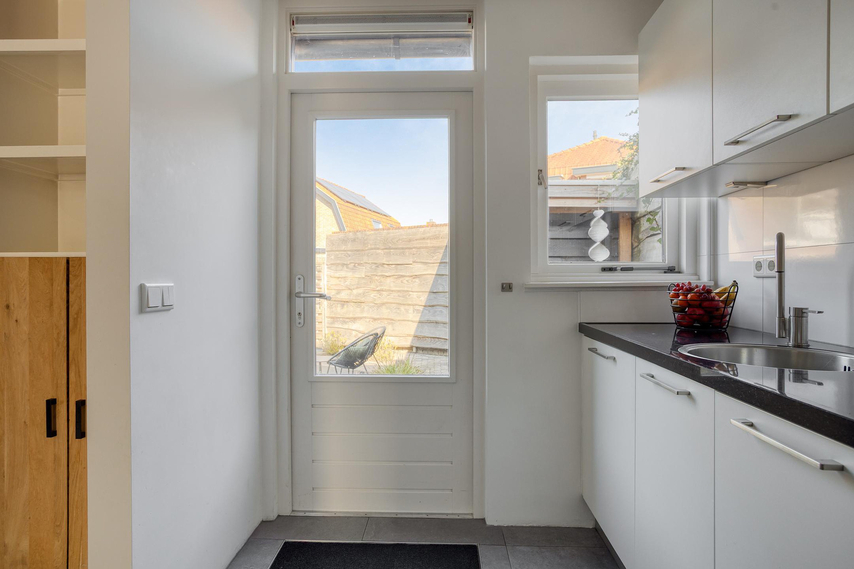 De semi-open keuken heeft een lichte inrichting en is uitgevoerd met een L-vormig hardstenen aanrechtblad. De keuken is voorzien van een 4-pits keramische kookplaat, combi-oven, rvs-afzuigkap, rvs-spoelbak met mengkraan en diverse onder- en bovenkasten met lades. Vanuit de keuken is er een loopdeur naar de achtertuin.