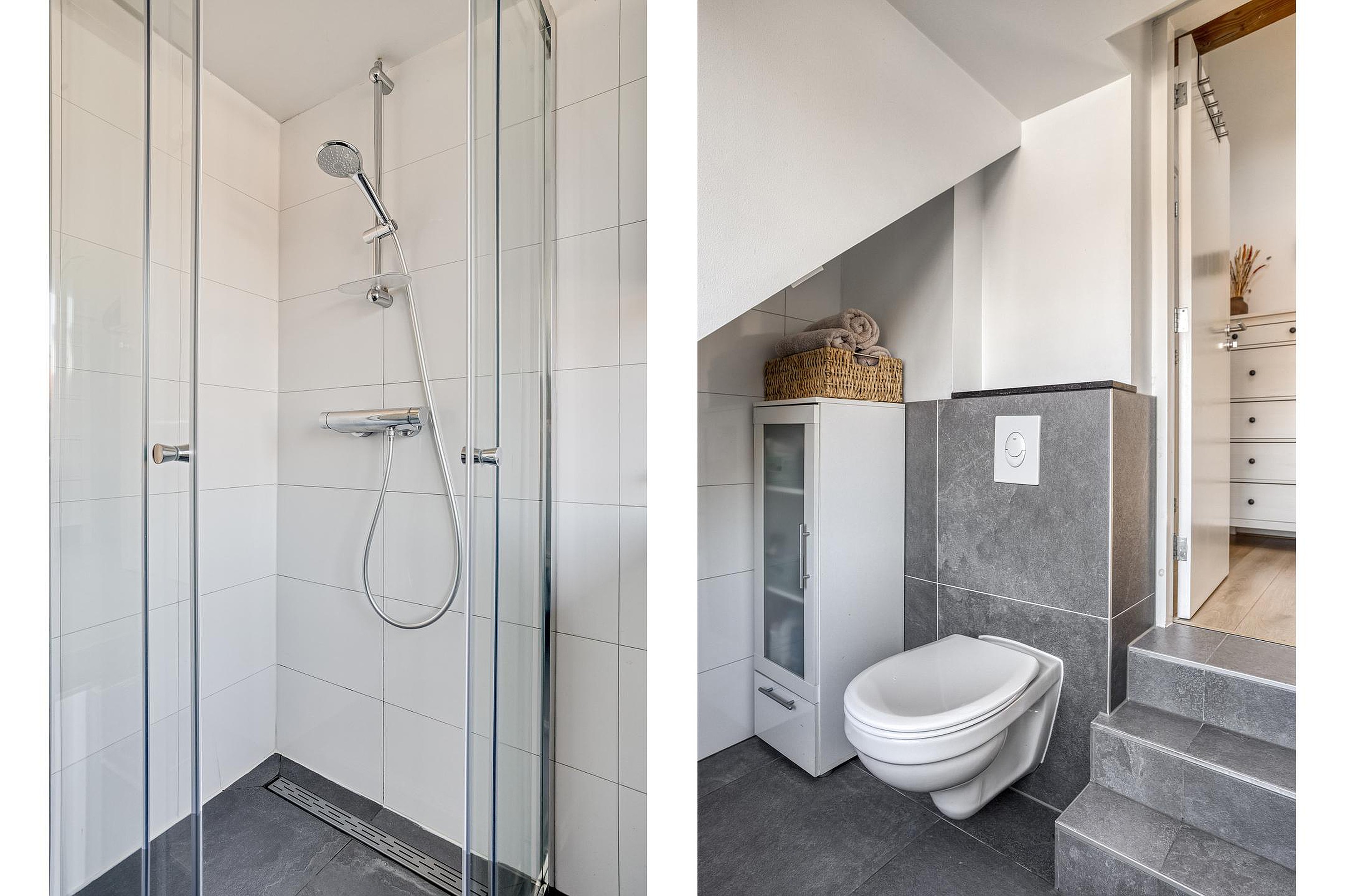 De lager gelegen badkamer is bereikbaar via drie treden en is gedeeltelijk betegeld. De ruimte is ingericht met een wandcloset, inloopdouche, wastafelmeubel, spiegelkast, radiator en een dakkapel die zorgt voor natuurlijke lichtinval en ventilatie.