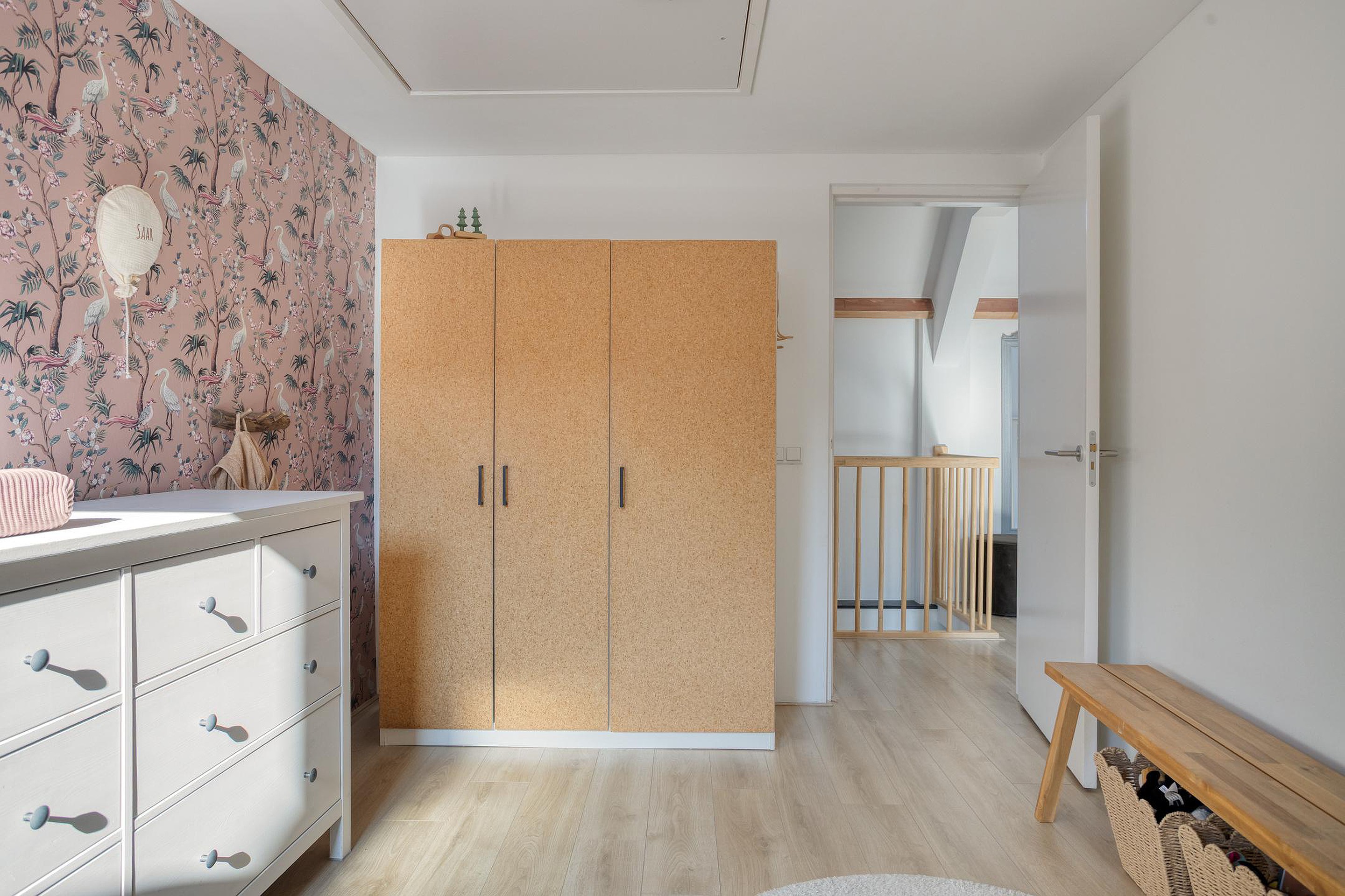 De overloop geeft toegang tot drie slaapkamers, de badkamer en een extra kast met aansluitingen voor de wasmachine en droger. De verdieping is afgewerkt met een laminaatvloer.