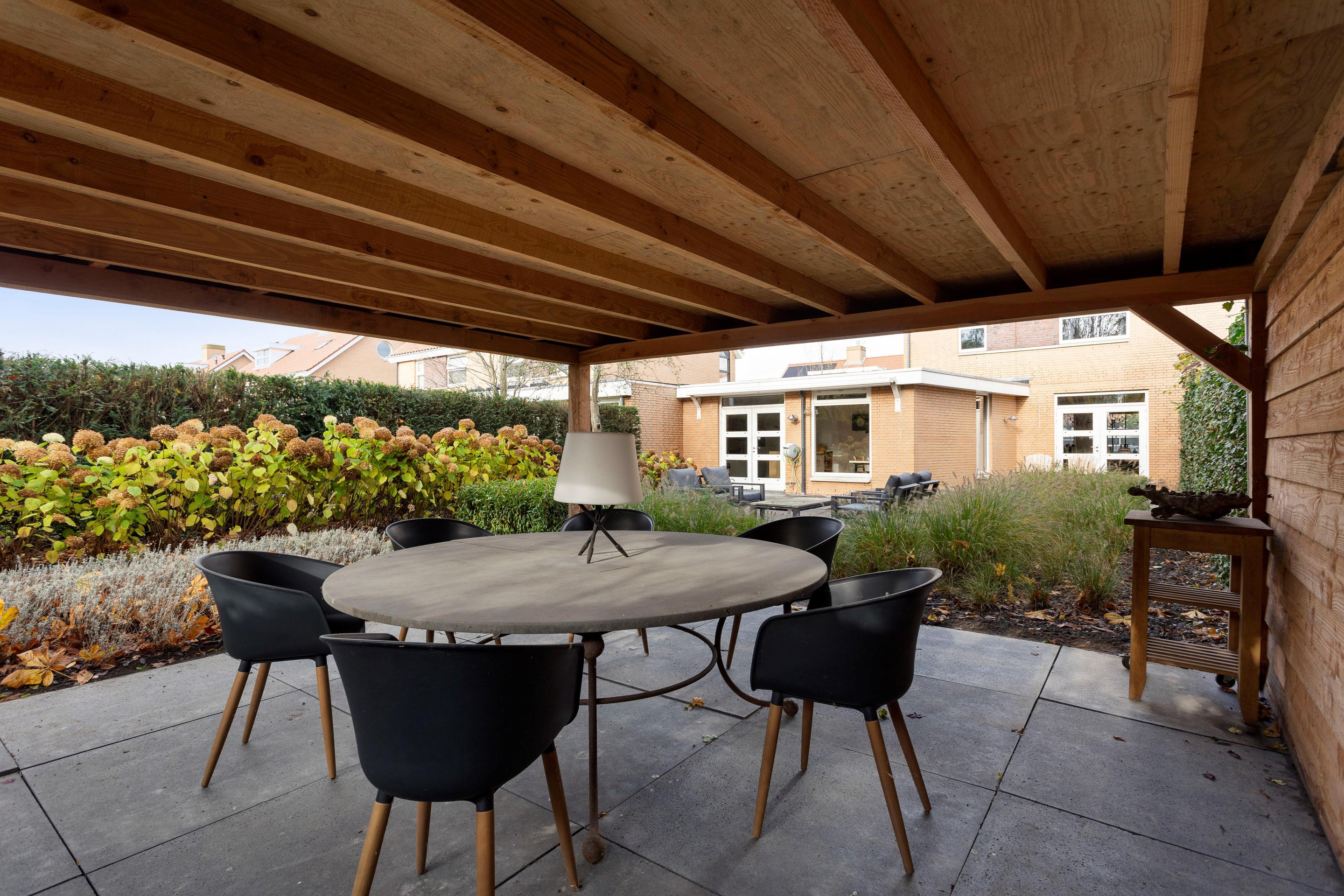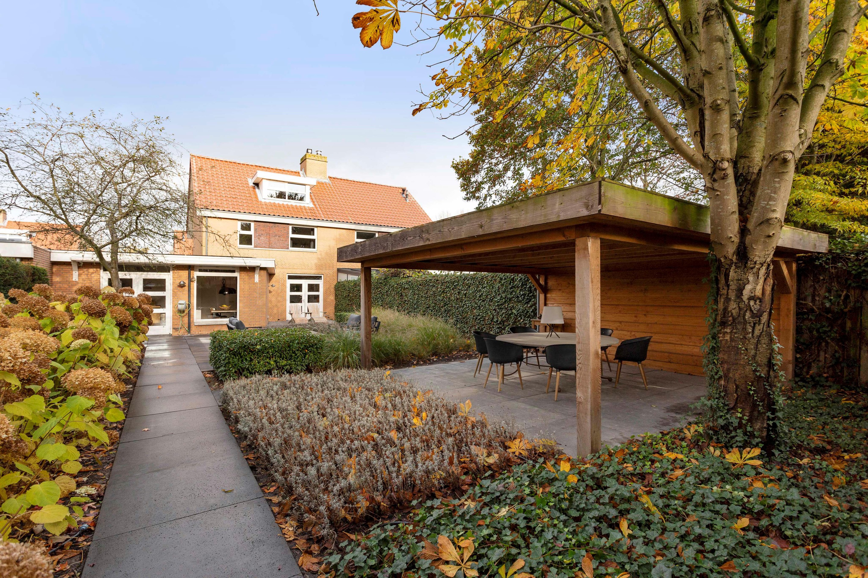 De zonnige achtertuin van ruim 18 meter diep en 11 meter breed ligt op het zuiden en biedt volop privacy. Meerdere terrassen en een fraaie overkapping van ca. 52 m2 maken dit de ideale plek om buiten te leven. Binnen vind je een sfeervolle woonkamer, een royale open woonkeuken met kookeiland, vijf slaapkamers en veel bergruimte. Op de oprit is plek voor twee auto’s.