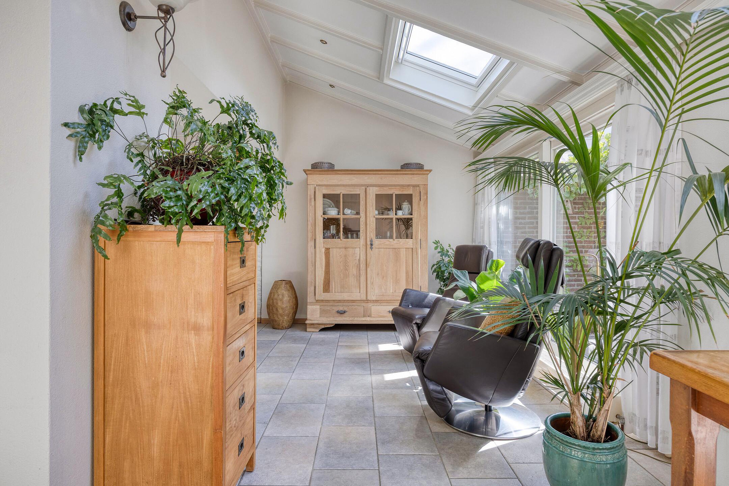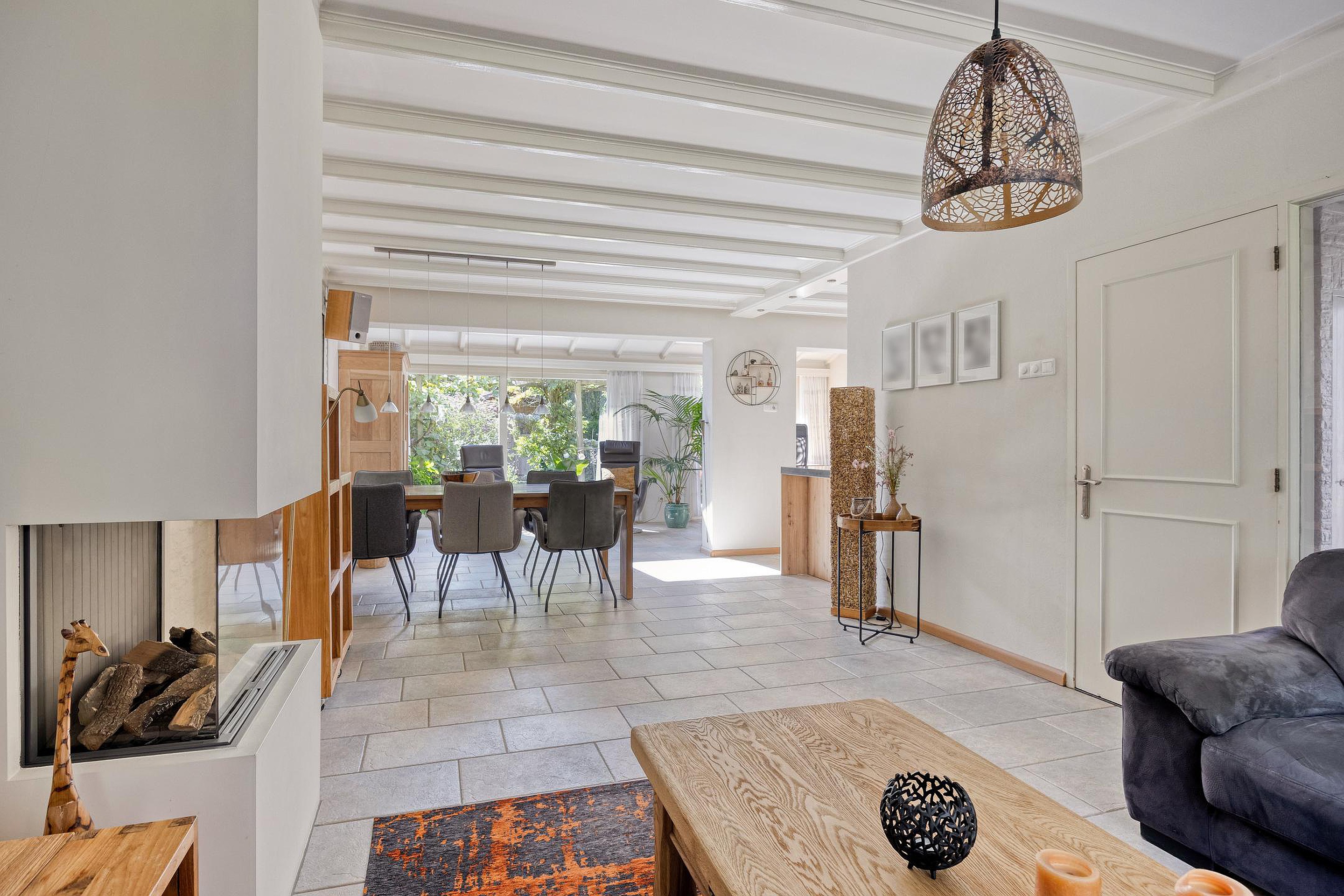De woonkamer is royaal en voelt warm aan door de tegelvloer, voorzien van vloerverwarming, het balkenplafond en de gashaard in de zithoek. Grote ramen laten zorgen voor veel daglicht en een fijne woonbeleving.