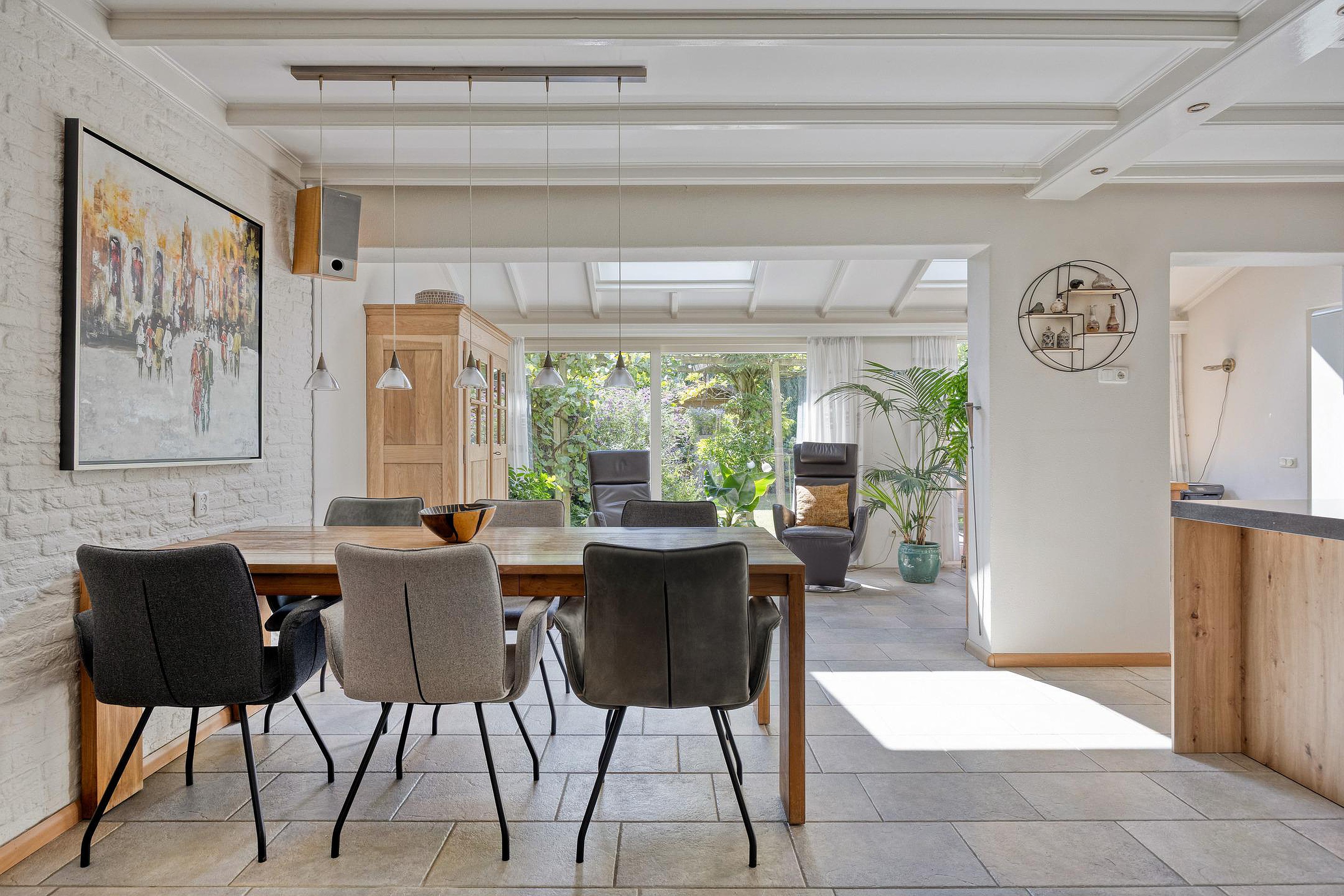 Vanuit de eethoek loop je via de schuifpui zo de tuin in.