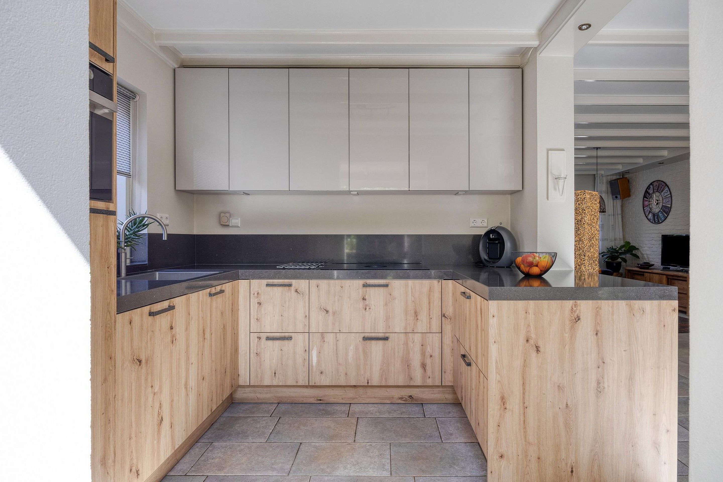 De keuken is nog maar vijf jaar oud en heeft een warme houtlook met een strak composiet werkblad. Hier vind je alles wat je nodig hebt: een inductiekookplaat met geïntegreerde afzuiging (Bora), combimagnetron, heteluchtoven, koelkast, vaatwasser en Quooker. Er is een inbouwboiler voor direct warm water. Het werkblad is ruim, de kastruimte royaal, en het grote raam geeft fijn uitzicht tijdens het koken.