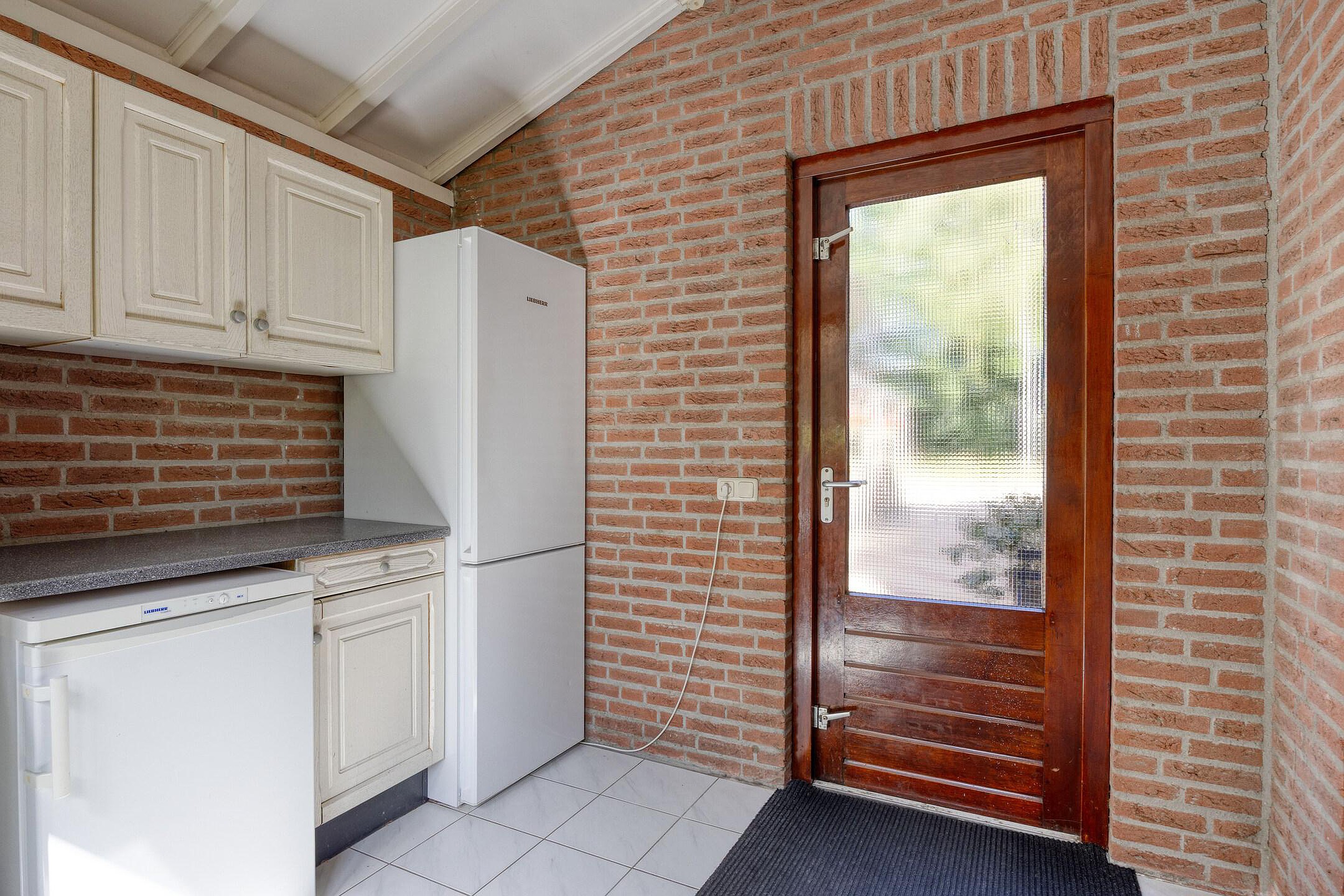 Aangrenzend aan de woonkamer ligt de bijkeuken. Met een deur naar de oprit en een deur naar de achtertuin. Er zijn aansluitingen voor wasmachine en droger, en ruimte voor een extra koelkast.