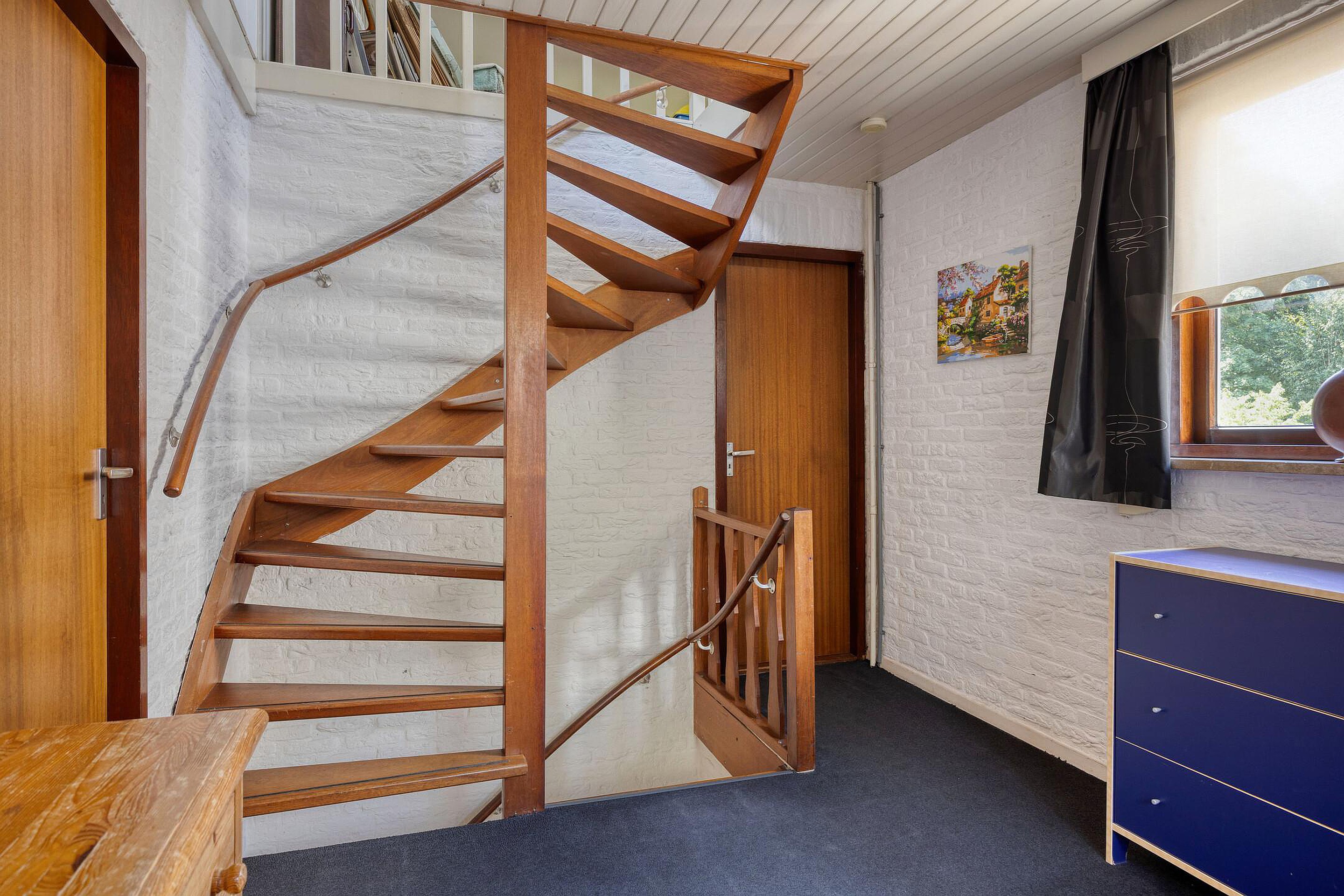 Je stapt binnen in een brede, lichte hal. De houten trap trekt meteen de aandacht. Links de meterkast met veel bergruimte, recht vooruit het toilet: