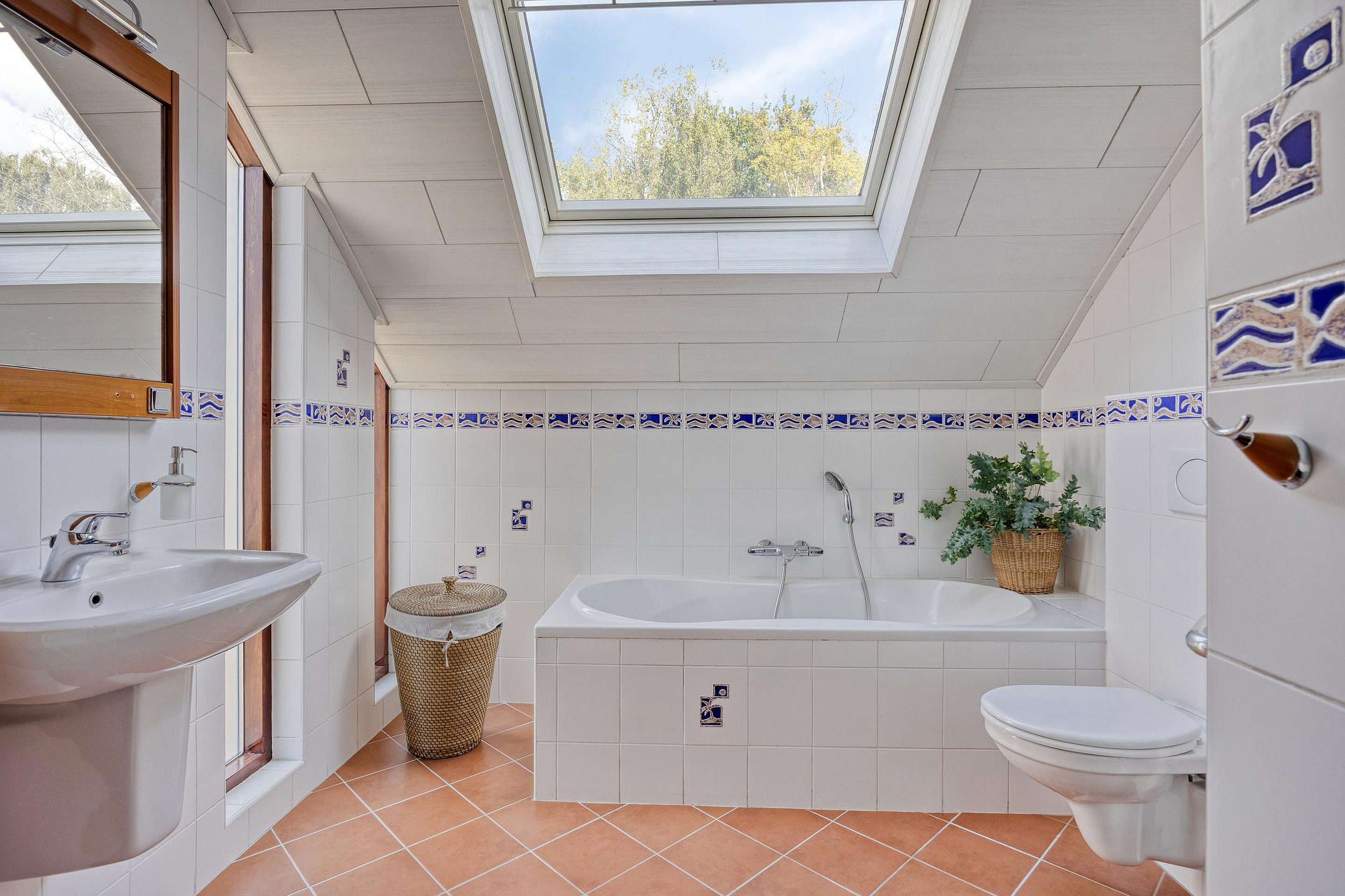 BADKAMER: volledig betegeld, groot Velux dakraam, douche, ligbad, wastafelmeubel, hangtoilet en handdoekradiator. Elektrische vloerverwarming aanwezig (nu afgekoppeld, maar eenvoudig weer aan te sluiten).