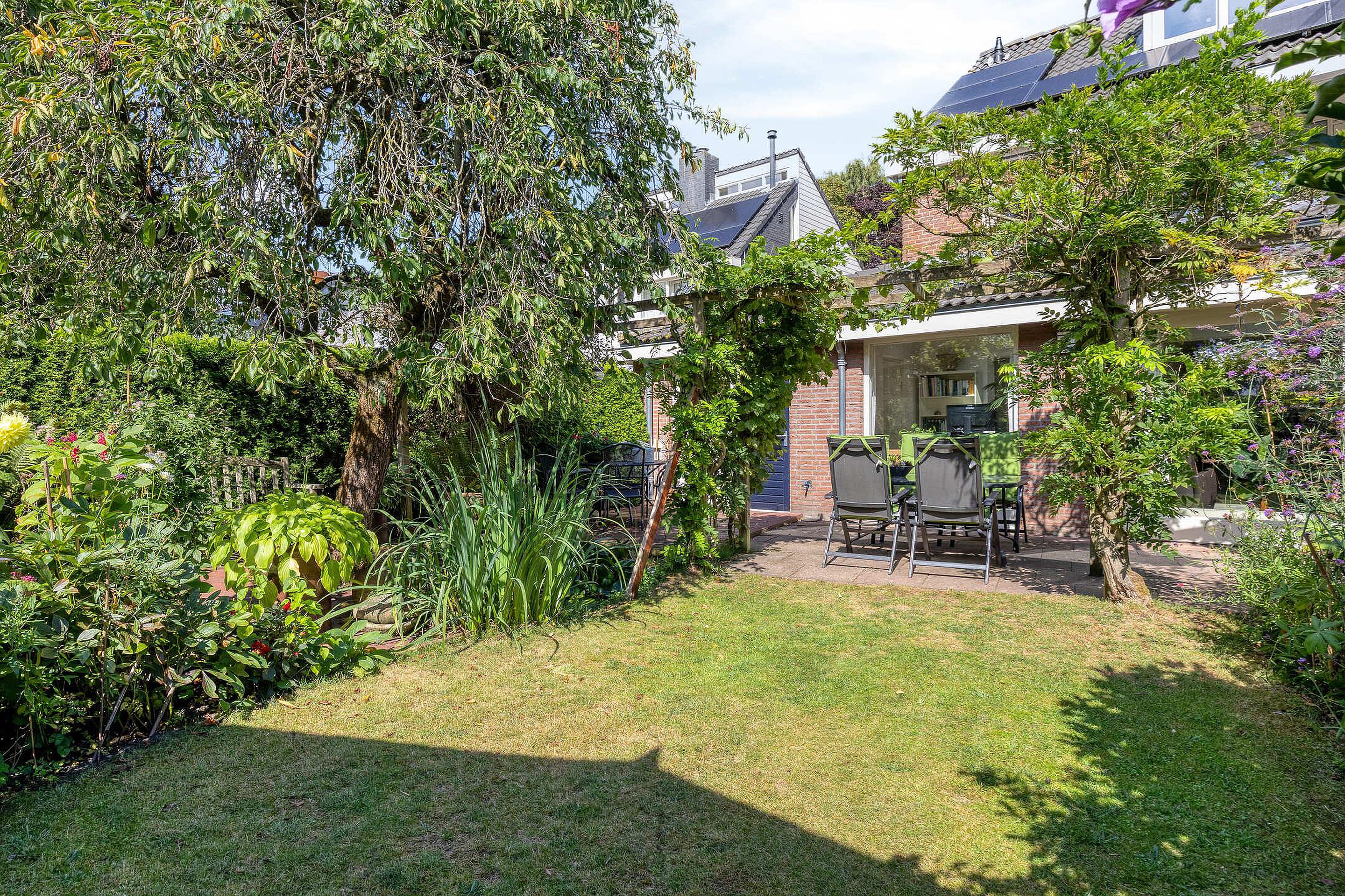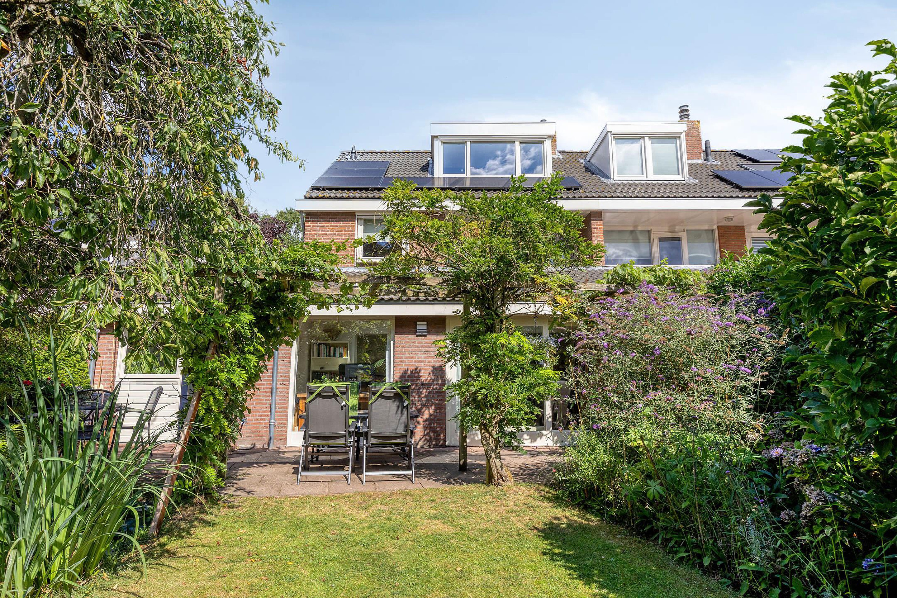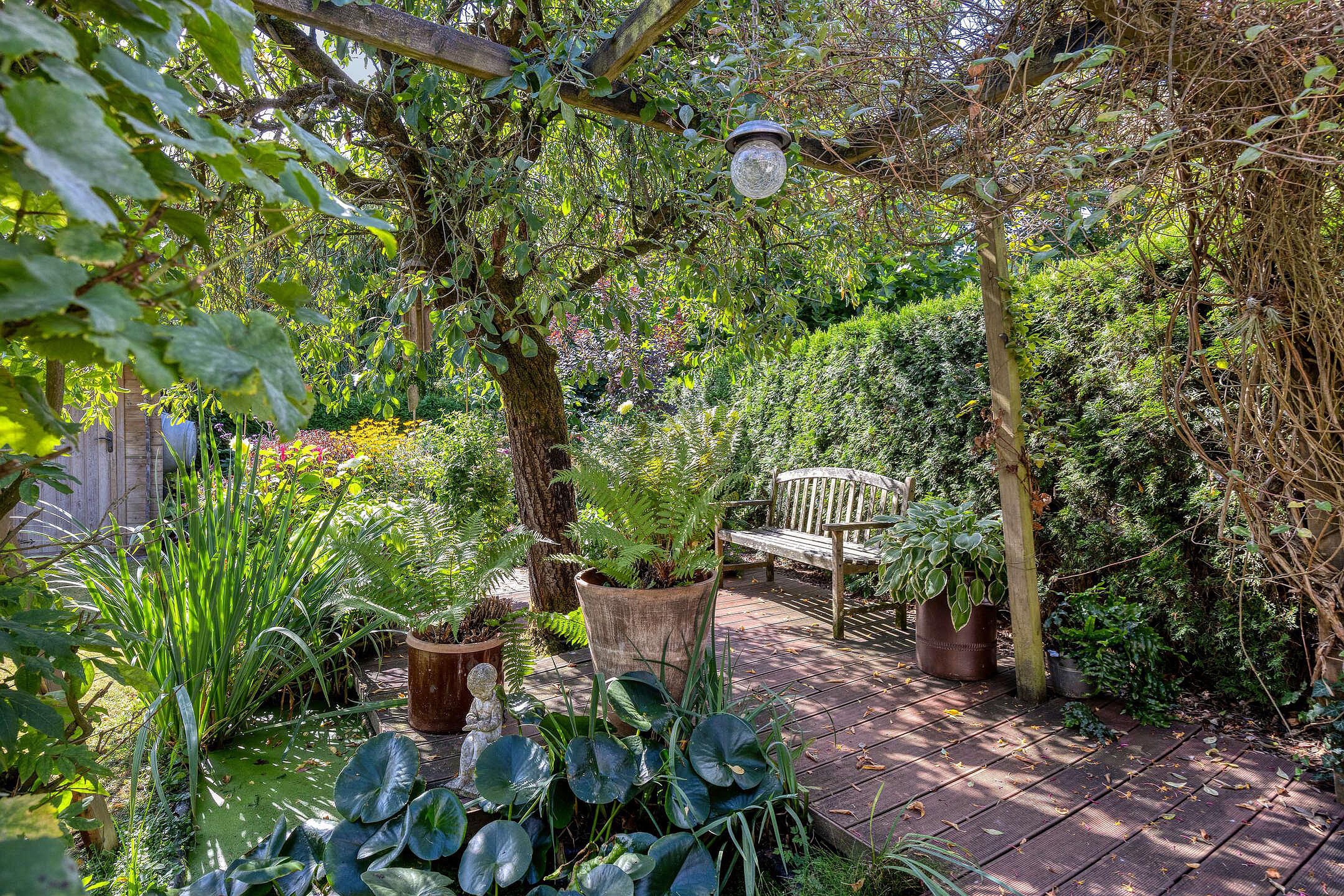 De achtertuin is een bloemrijk paradijs. Meerdere zitplekken in zon en schaduw, altijd beschut en privé.