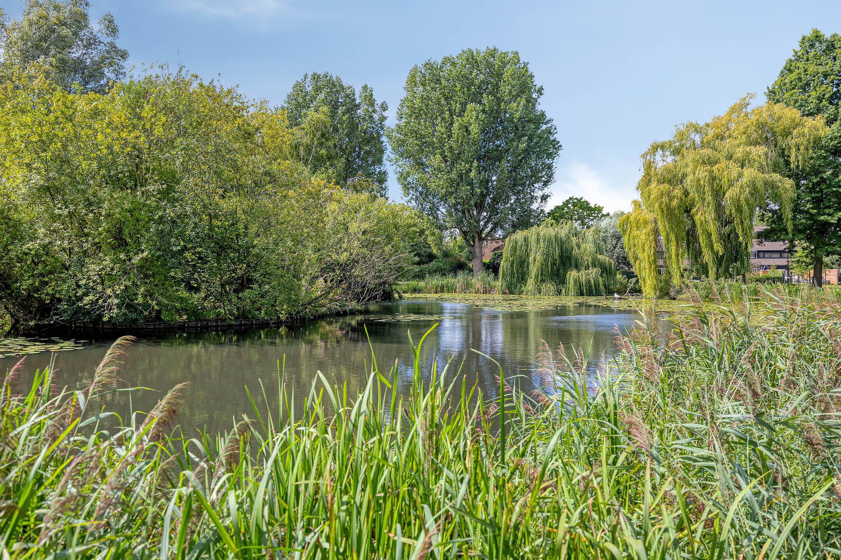 SLAAPKAMER 2 (achterzijde): met laminaatvloer, deels behang, deels sierpleister, en een balkondeur naar een beschut balkon. Hier geniet je in alle rust van het uitzicht over groen, vijver en natuur – in de zomer omsloten door bladeren, in de winter open tot aan het water.