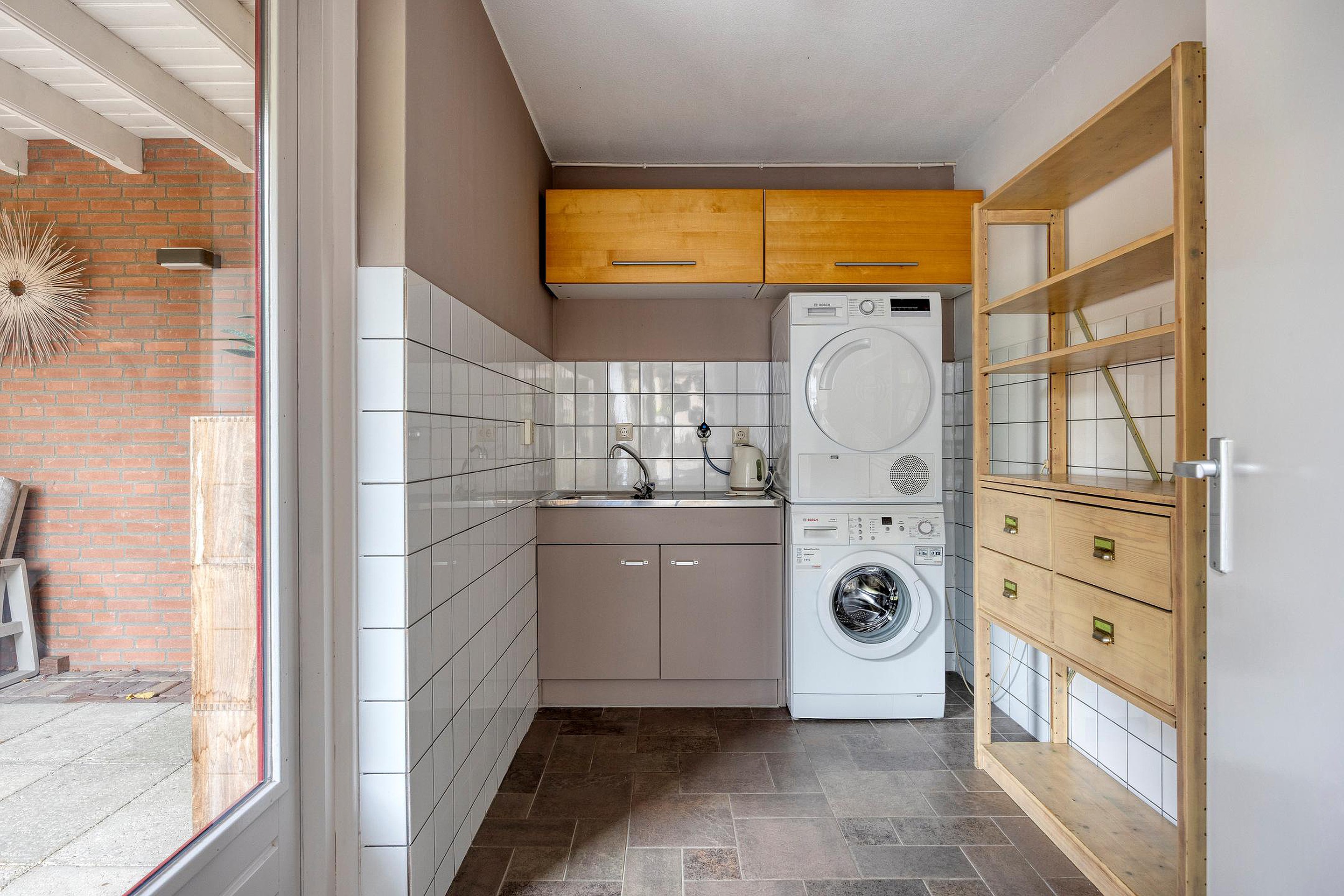 Aansluitend aan de keuken ligt de bijkeuken met een klein aanrechtje en aansluitingen voor wasmachine en droger. Vanuit hier bereik je zowel de inpandige garage als de achtertuin.
