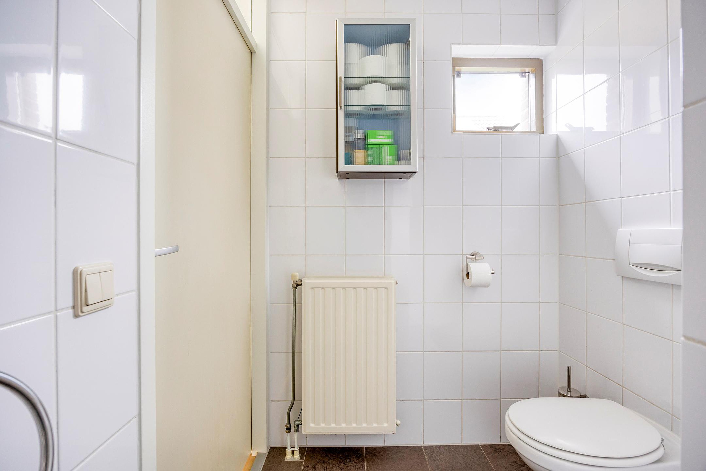Je komt binnen in een ruime hal met een keramische tegelvloer die doorloopt in de woonkamer en keuken. De hal is licht en overzichtelijk. Hier bevinden zich de meterkast en een toilet met wastafeltje en klepraampje. Via een deur met matglas stap je de woonkamer in.