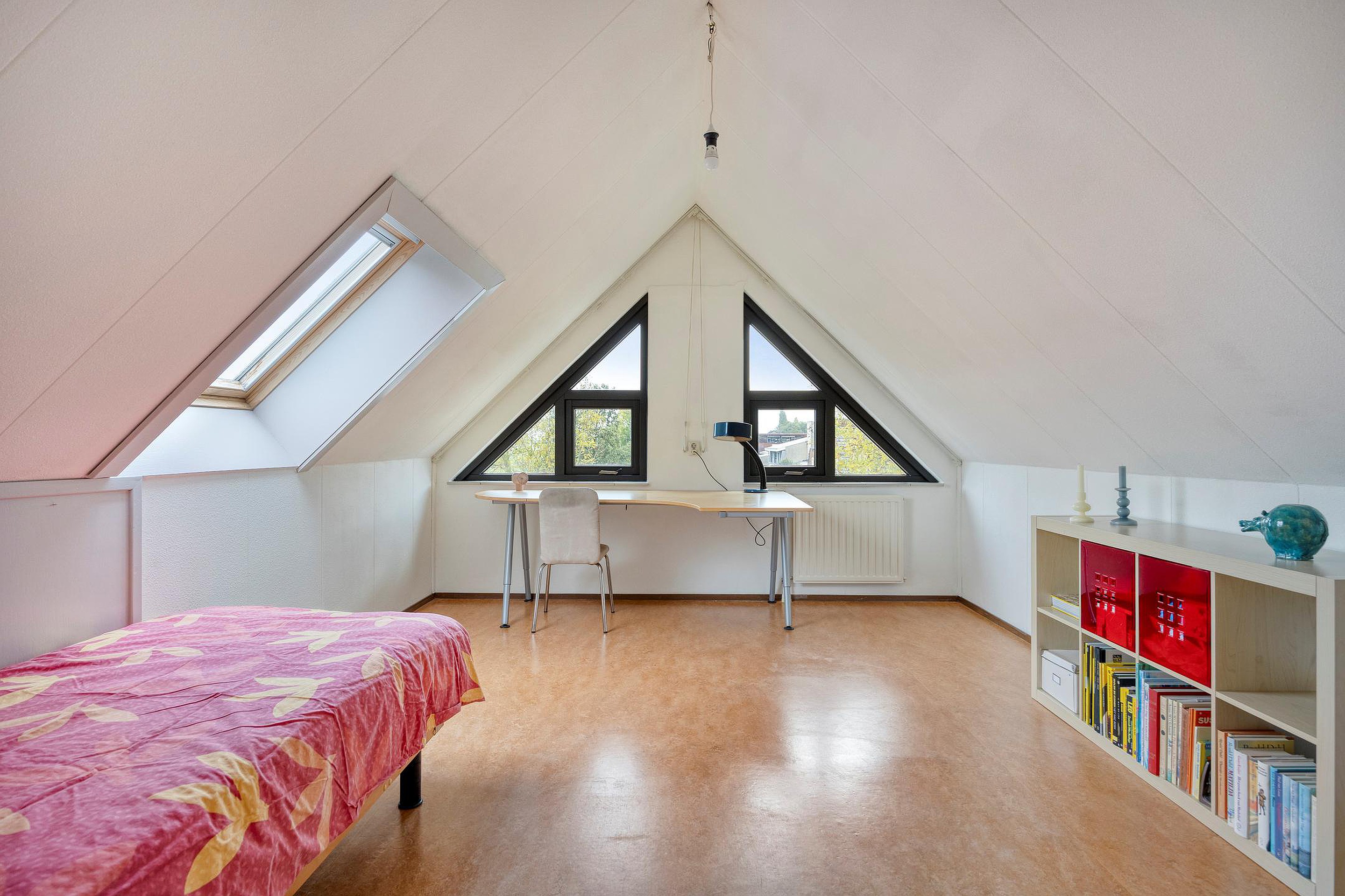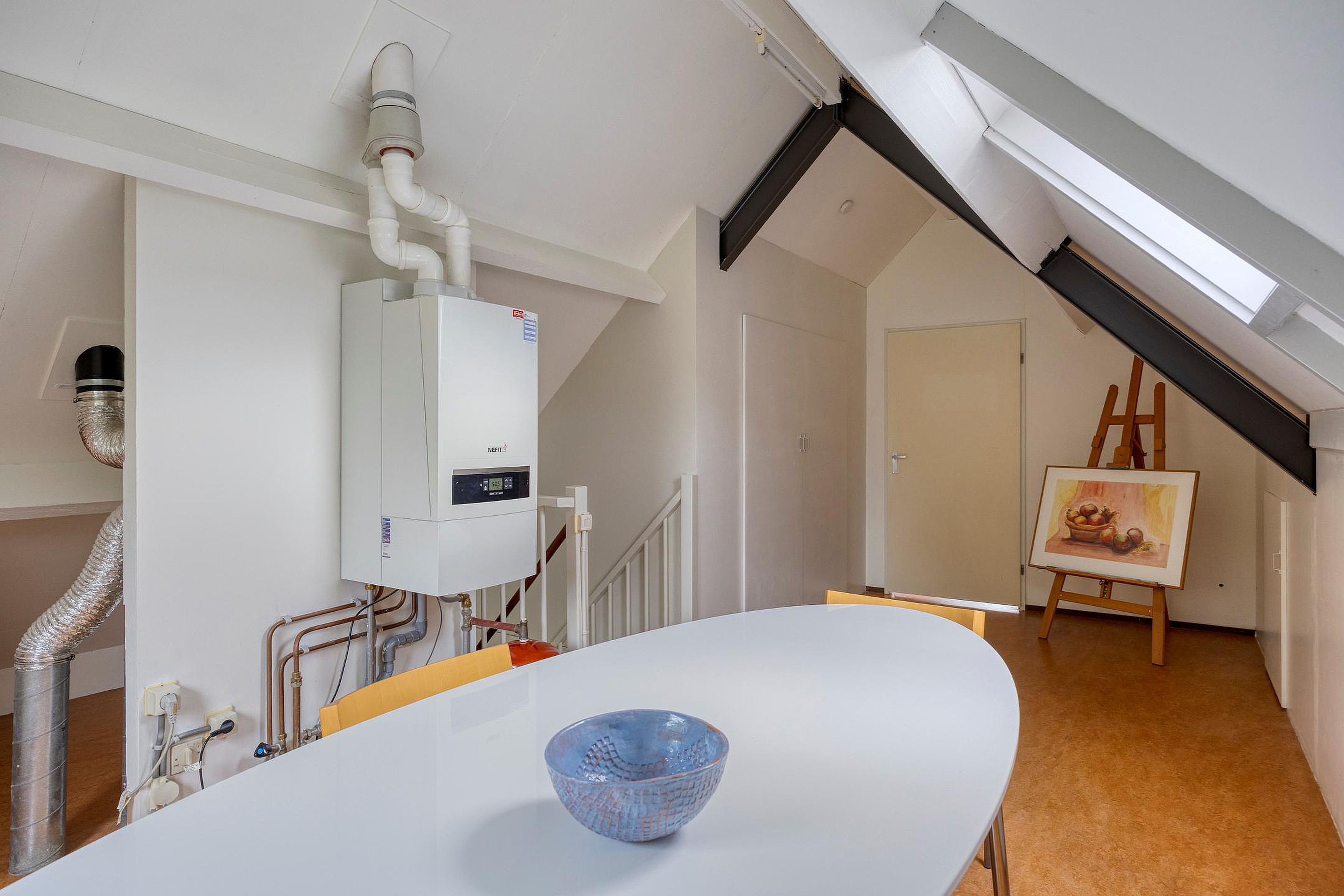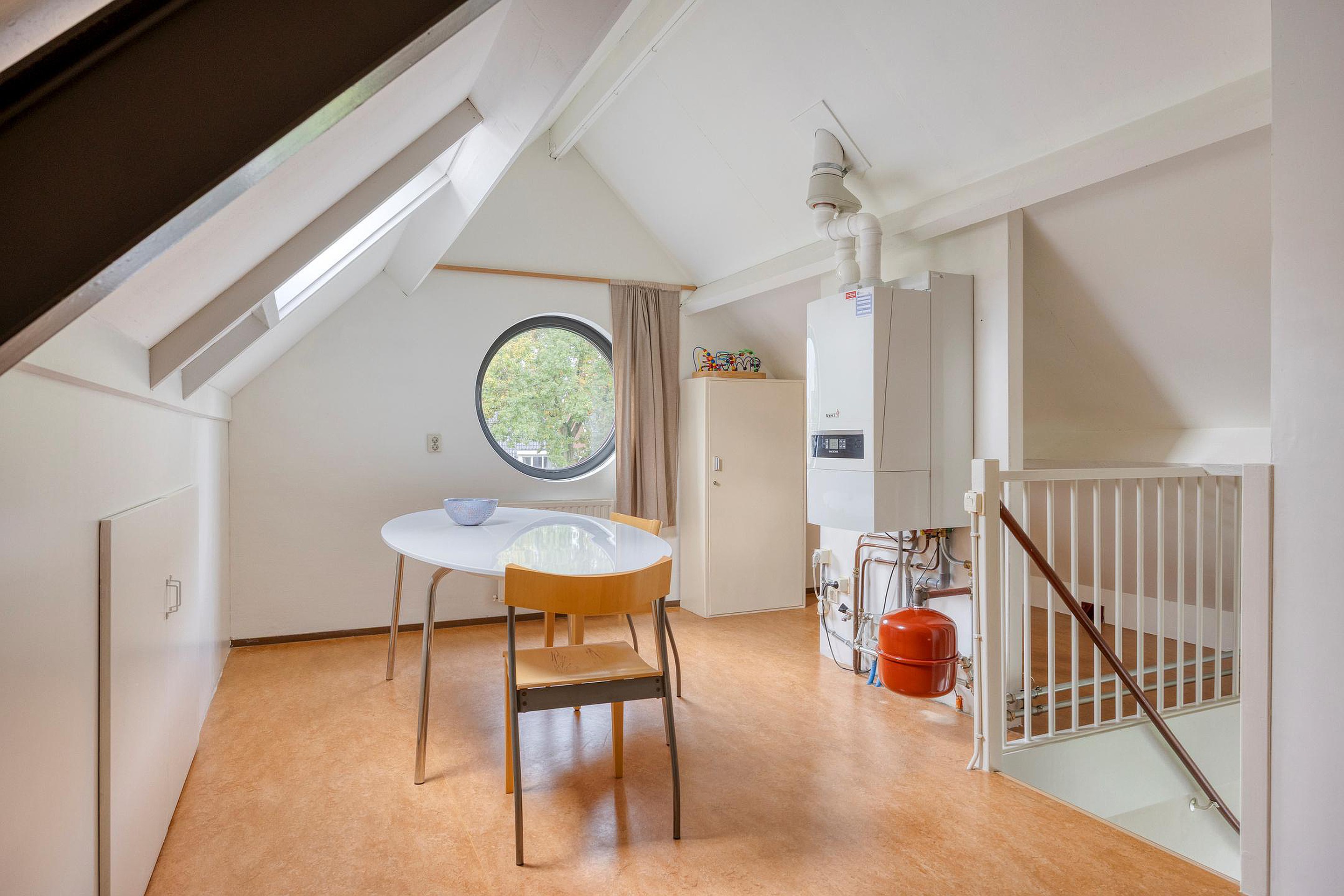 De vaste trap brengt je naar de royale zolder. Aan de voorzijde is een volwaardige slaapkamer met bergruimte achter de knieschotten, een raampartij en een dakraam. Aan de achterzijde is nog een grote ruimte met de Nefit-ketel (2016), extra bergruimte en de mogelijkheid voor een vijfde slaapkamer. Door het ronde raam en het dakraam kijk je mooi uit over de tuin. De vloer is afgewerkt met marmoleum.