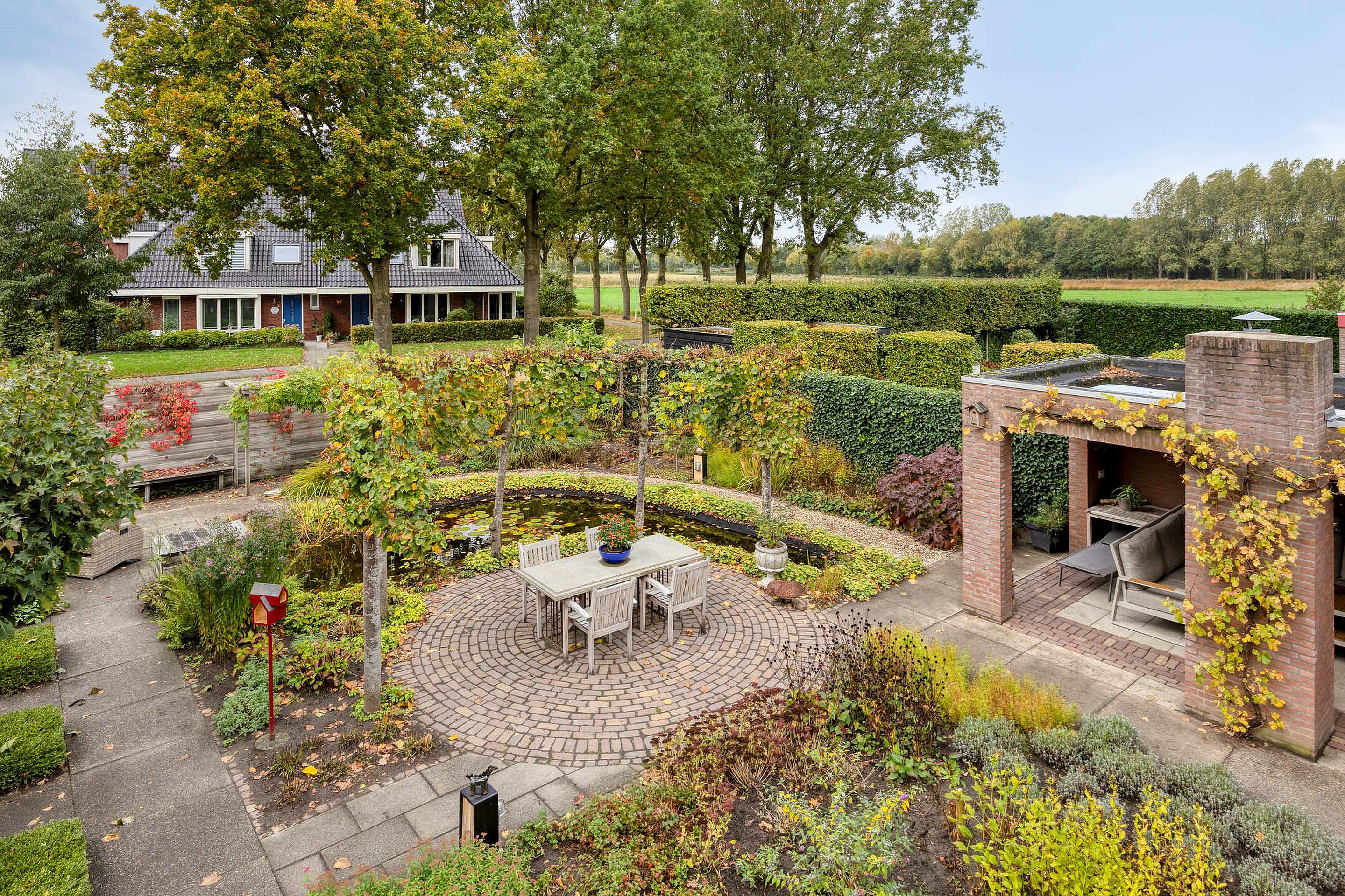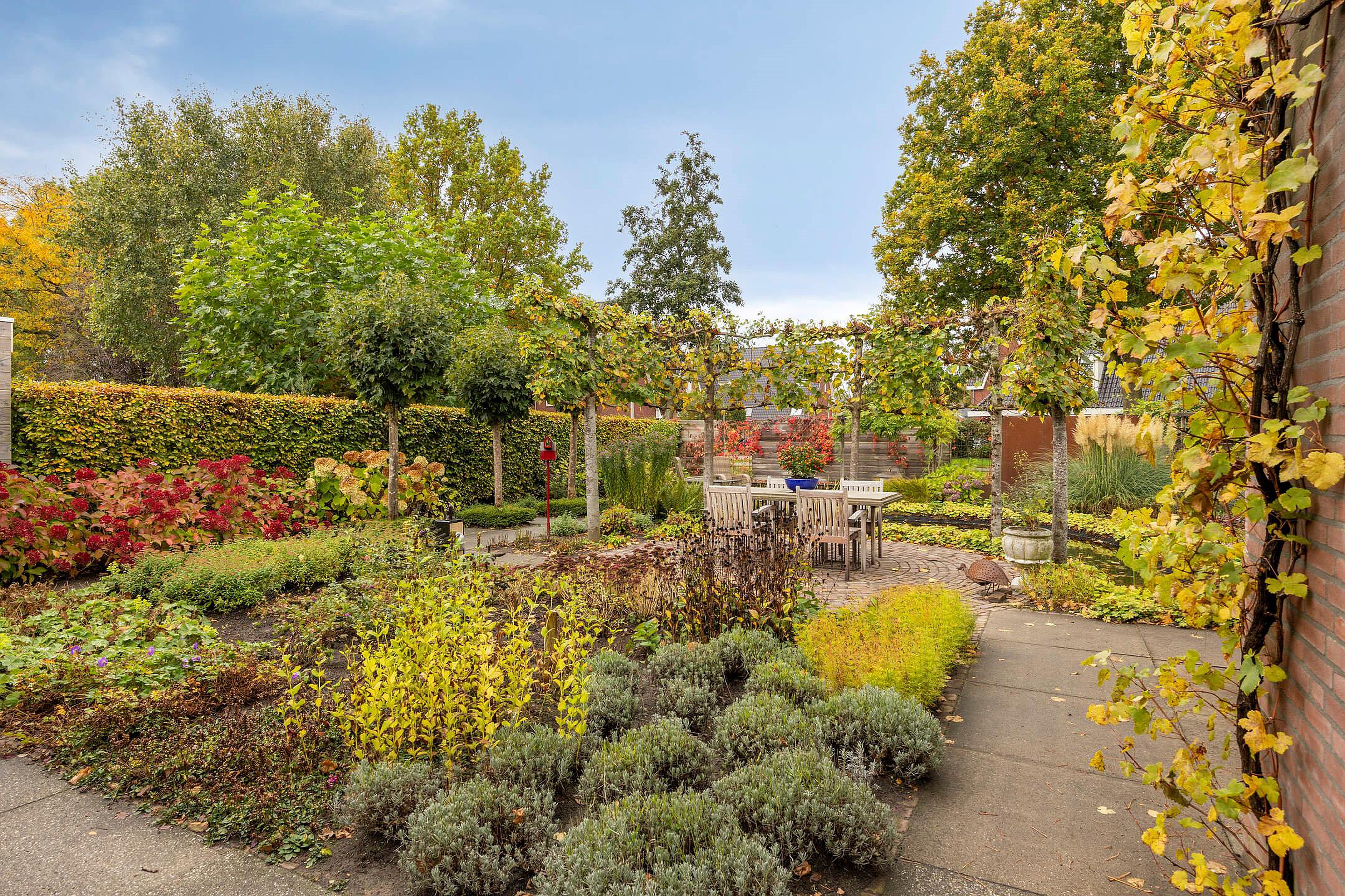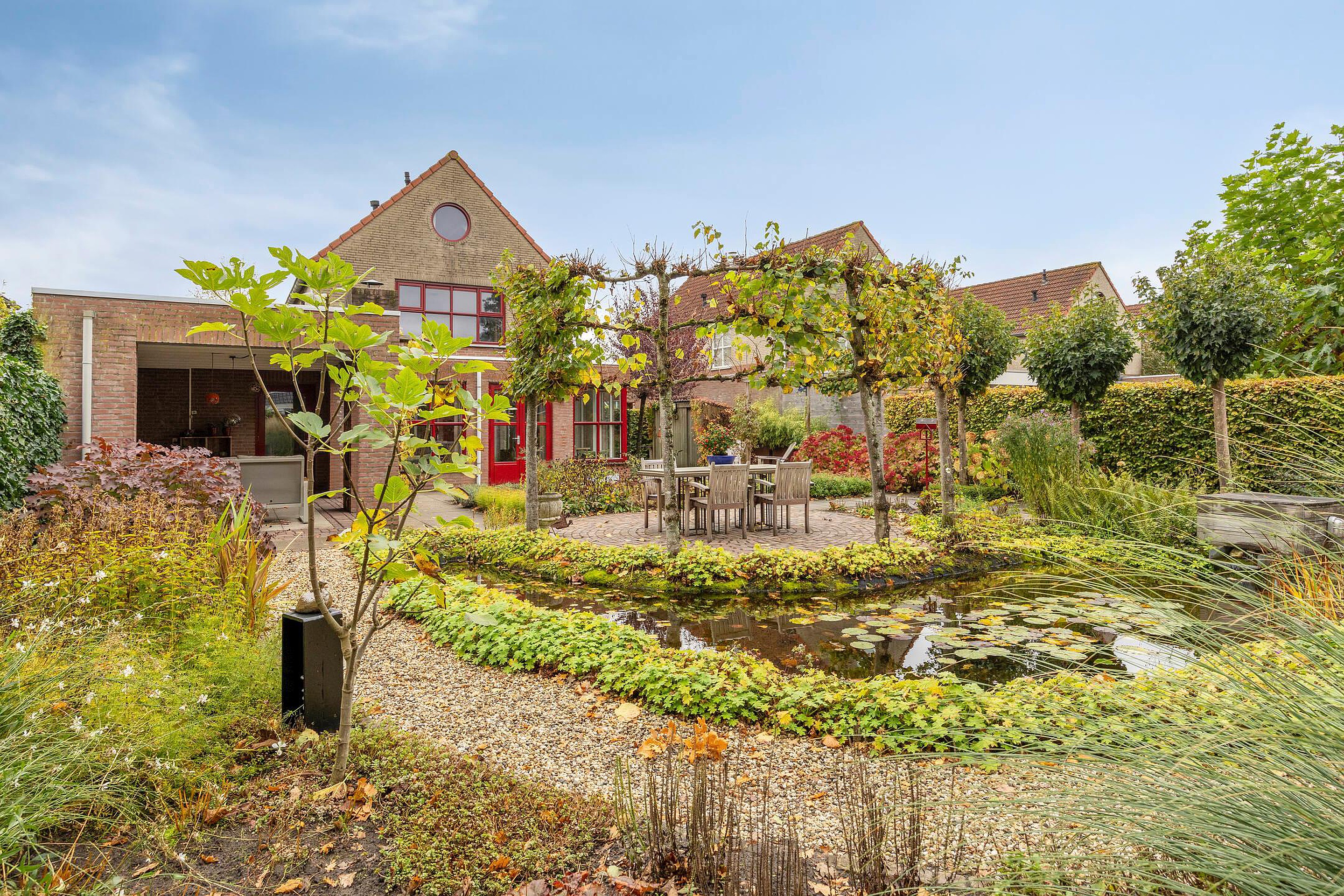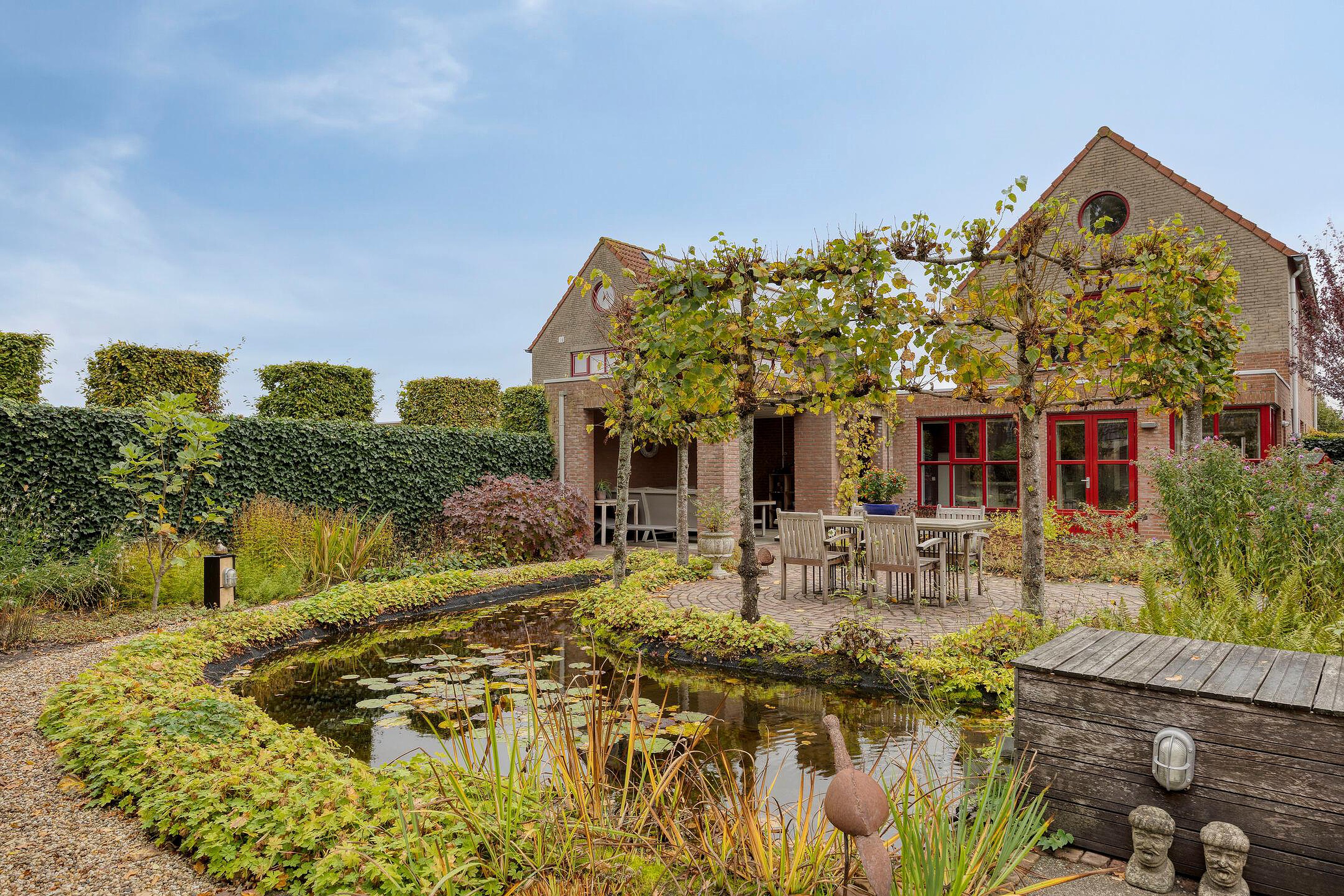 De achtertuin ligt op het westen en is met zorg en oog voor vorm aangelegd door een tuinarchitect. Er zijn verschillende terrassen, een vijver en een overkapping met open haard. Hier kun je het hele jaar door buiten genieten. Door de ligging rondom het huis heb je altijd een plekje in de zon of schaduw.