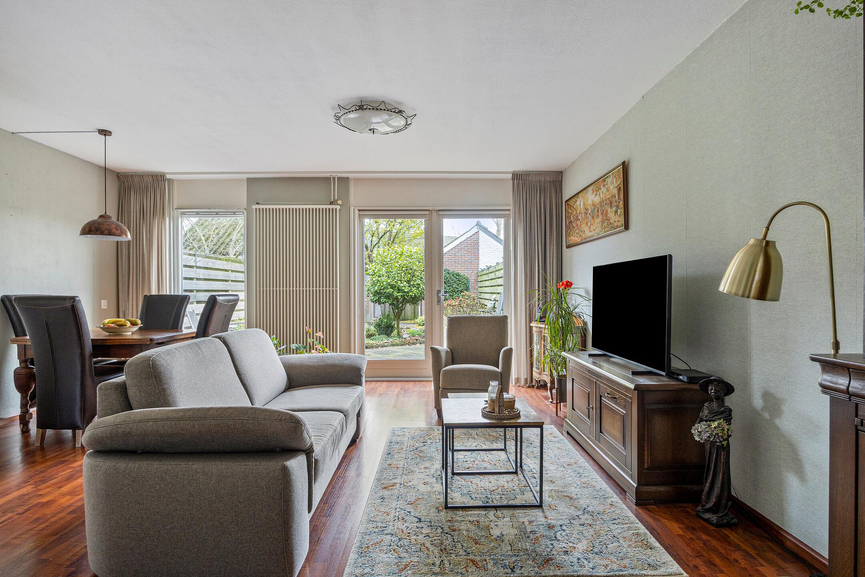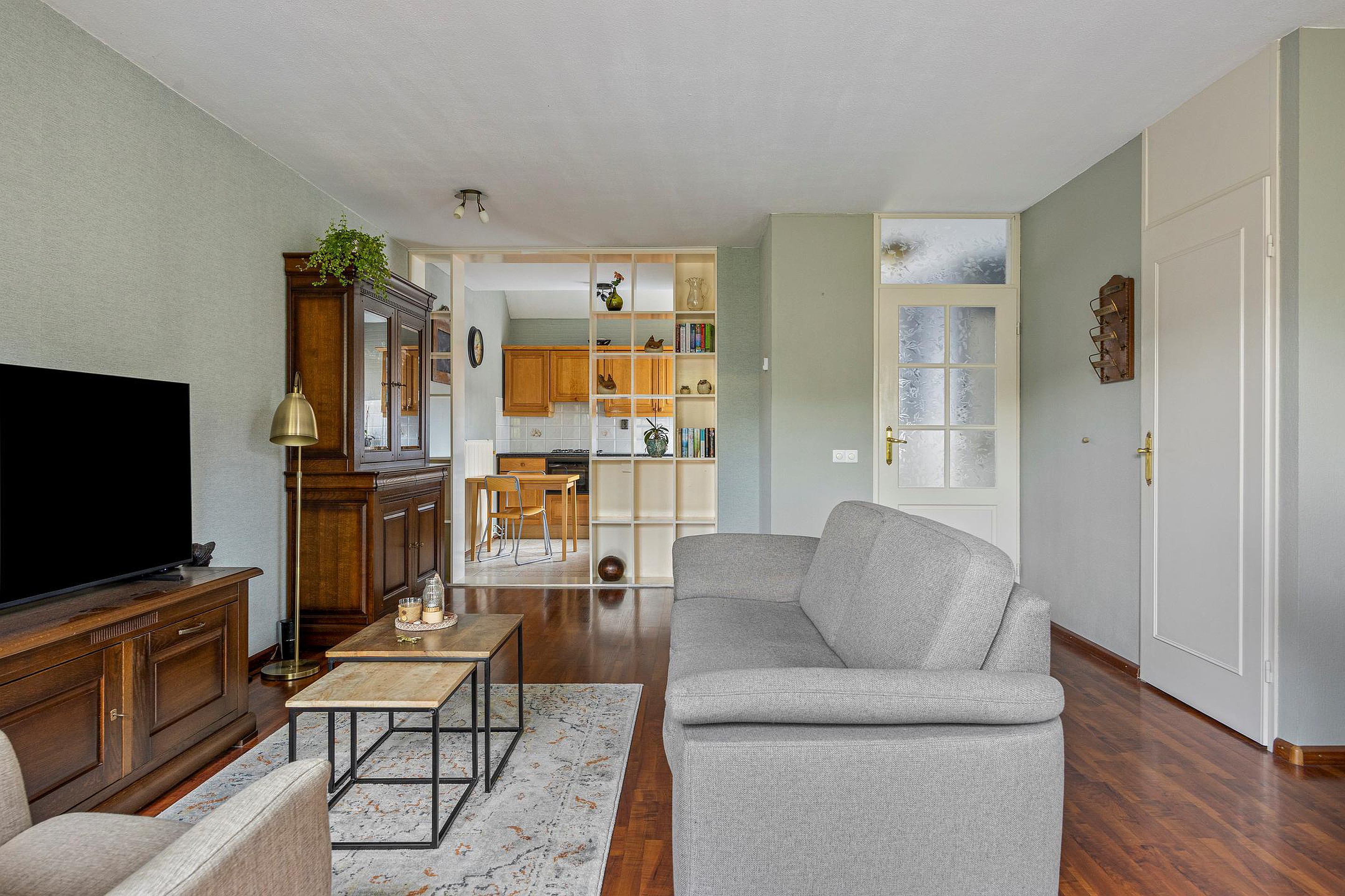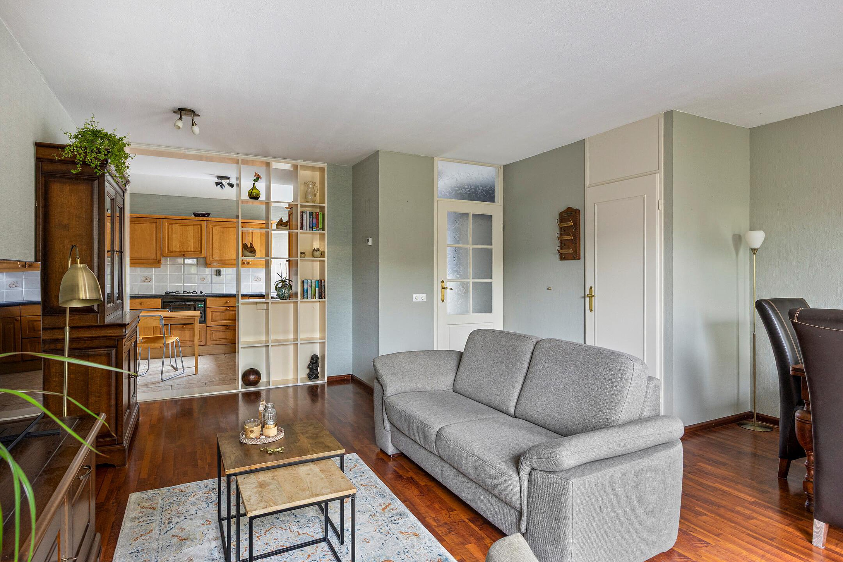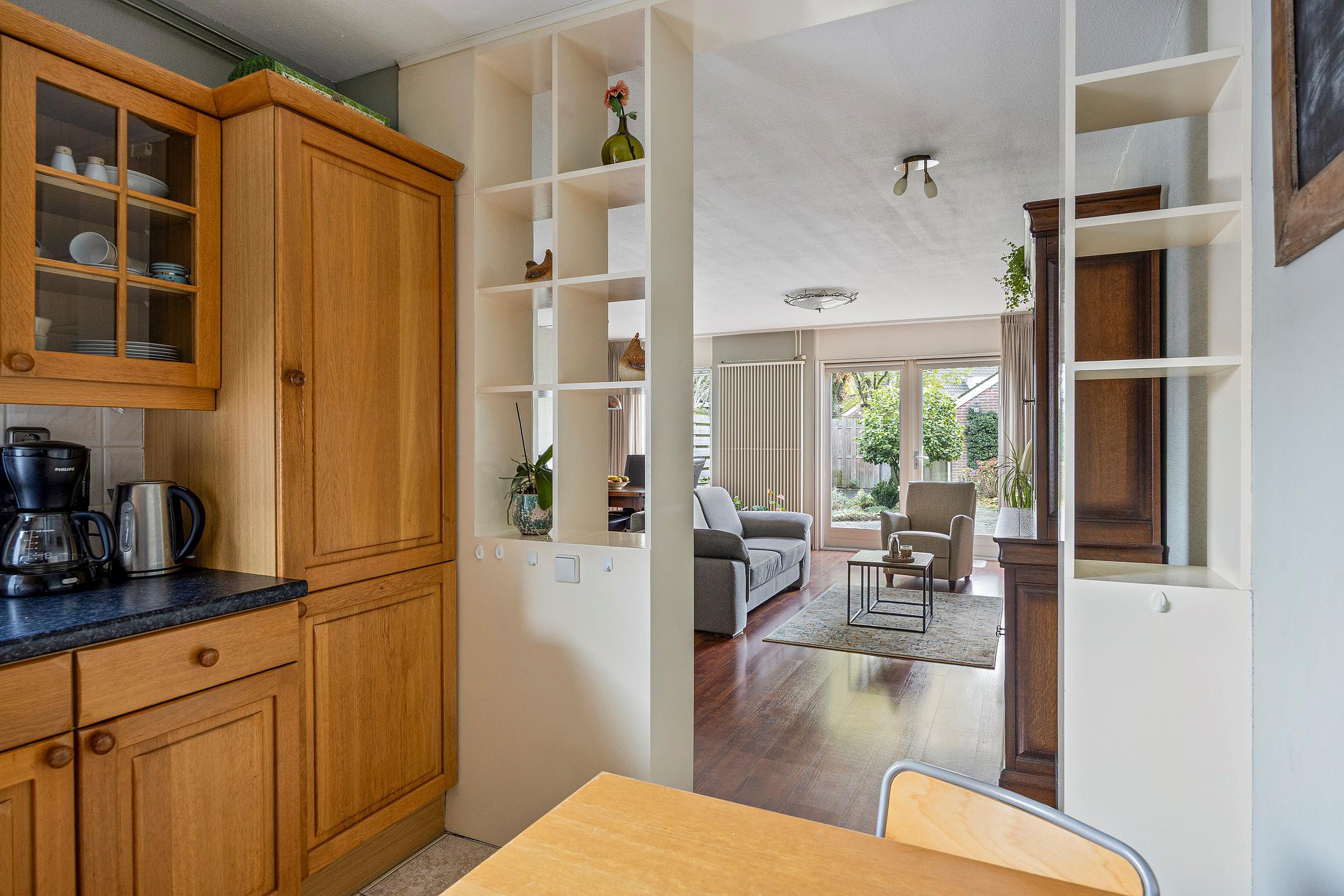Via de deur kom je in de woonkamer. De ruimte heeft een knusse sfeer door de donkere laminaatvloer. De proviandkast aan de zijkant biedt extra opslag. Het zicht op de diepe en beschutte tuin geeft rust. Aan de andere zijde ligt de open keuken.