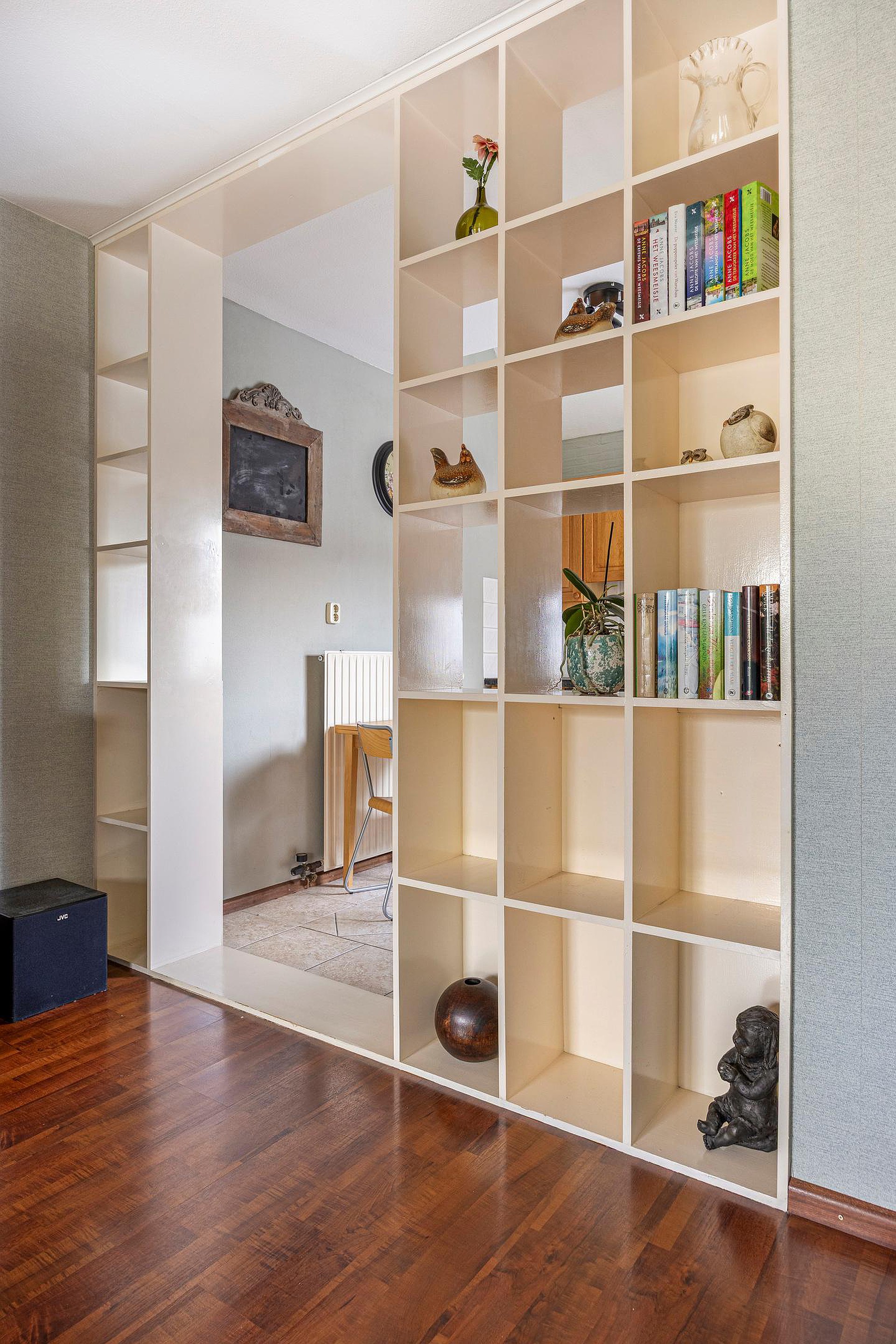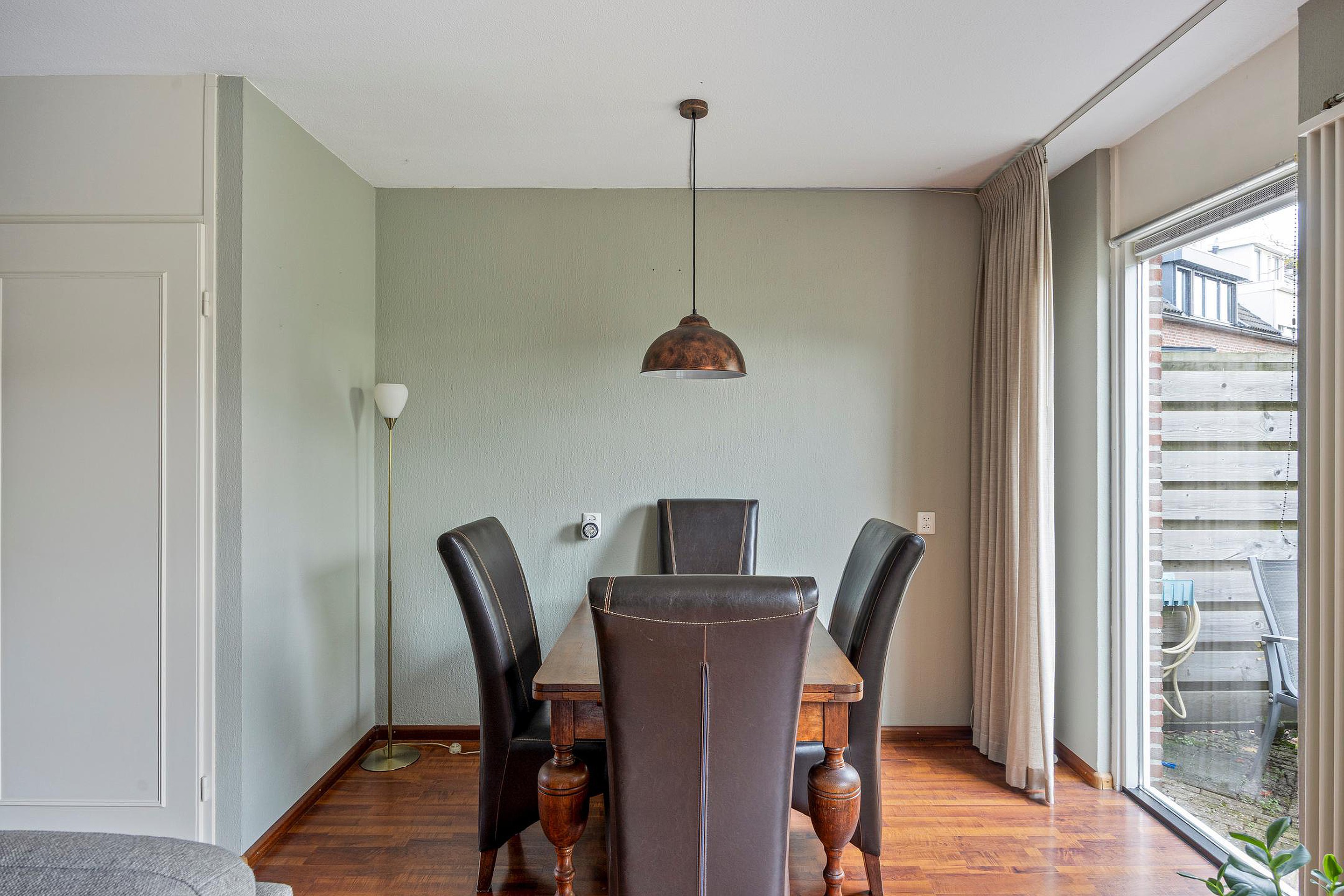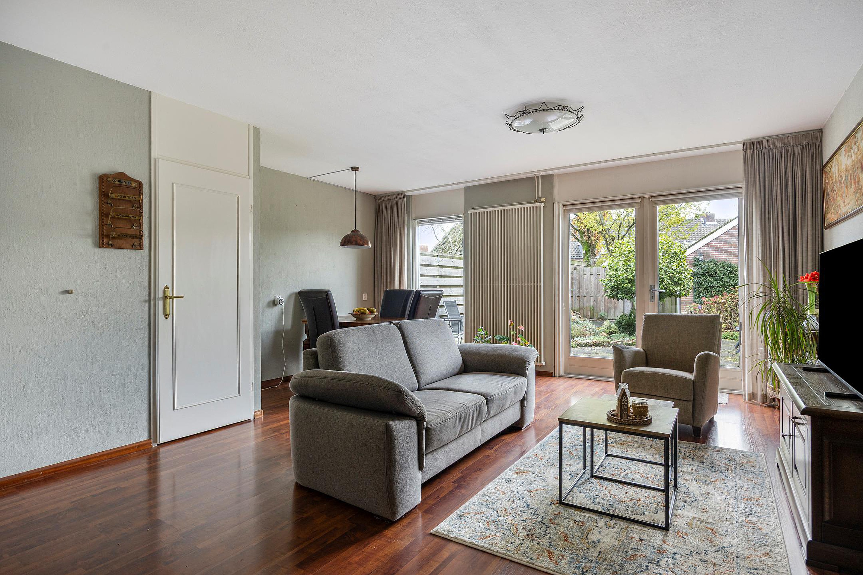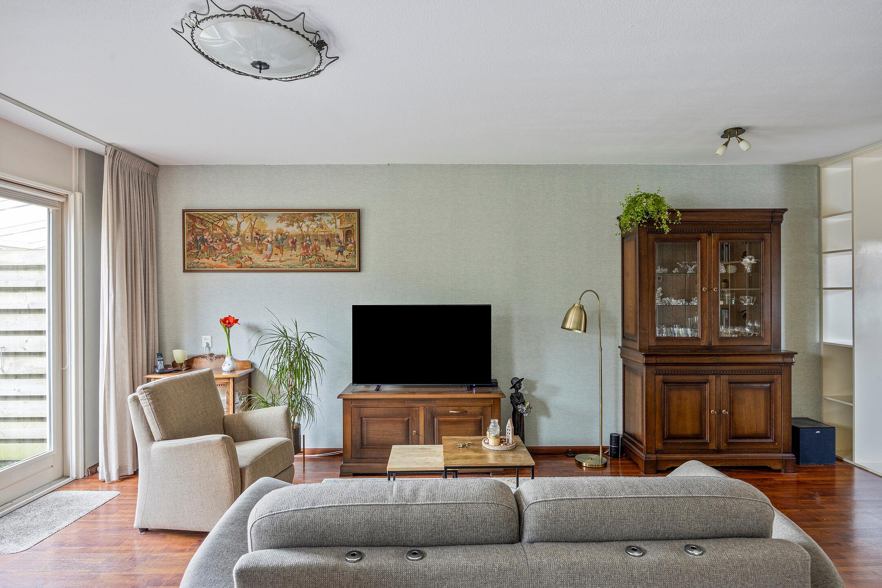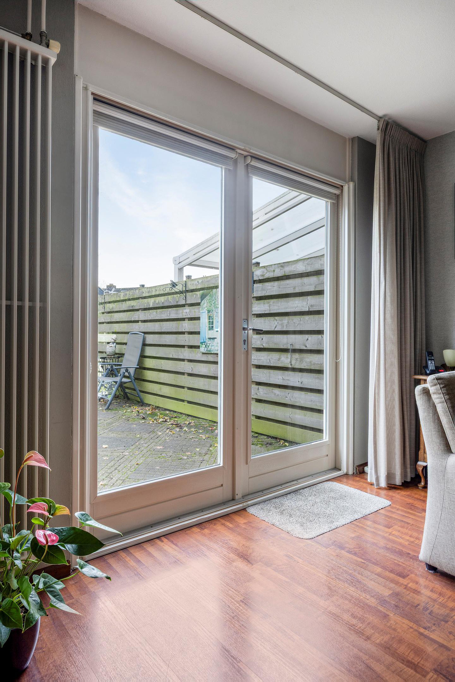 Via de deur kom je in de woonkamer. De ruimte heeft een knusse sfeer door de donkere laminaatvloer. De proviandkast aan de zijkant biedt extra opslag. Het zicht op de diepe en beschutte tuin geeft rust. Aan de andere zijde ligt de open keuken.