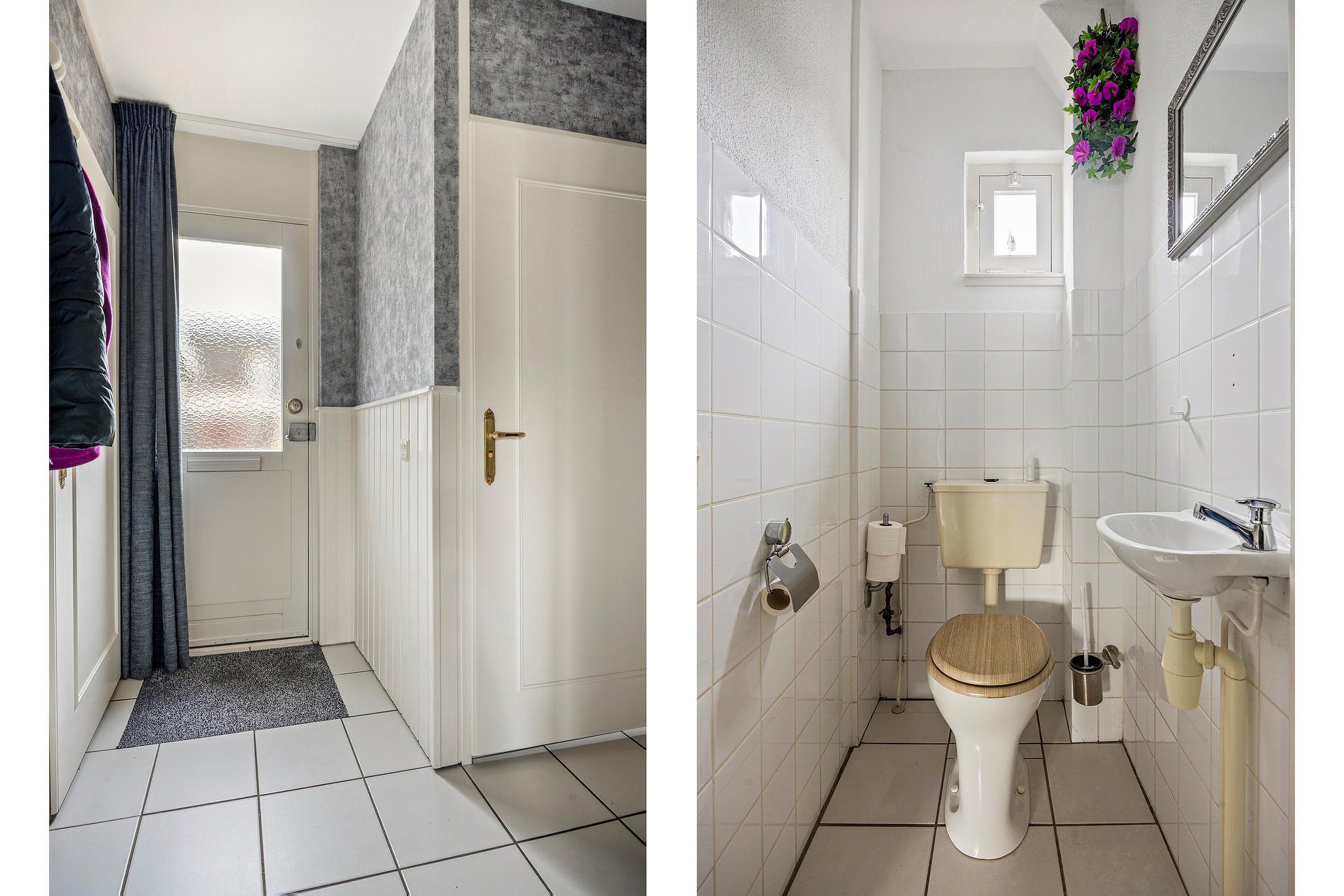 De voordeur komt uit in een hal met een tegelvloer. Het toilet ligt links, voorzien van een raampje en een wastafeltje. De meterkast zit naast de voordeur. De trap naar boven is met vloerbedekking afgewerkt. Via een deur is de woonkamer te bereiken.