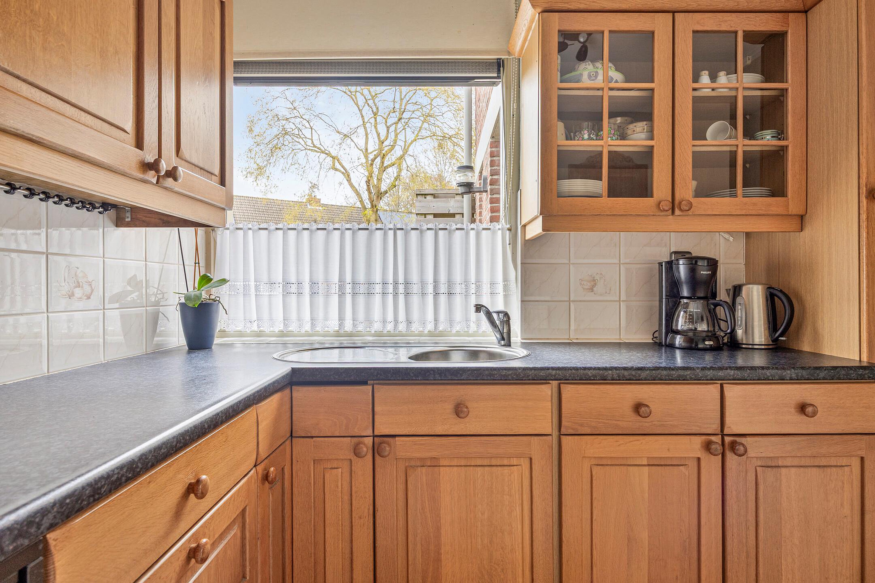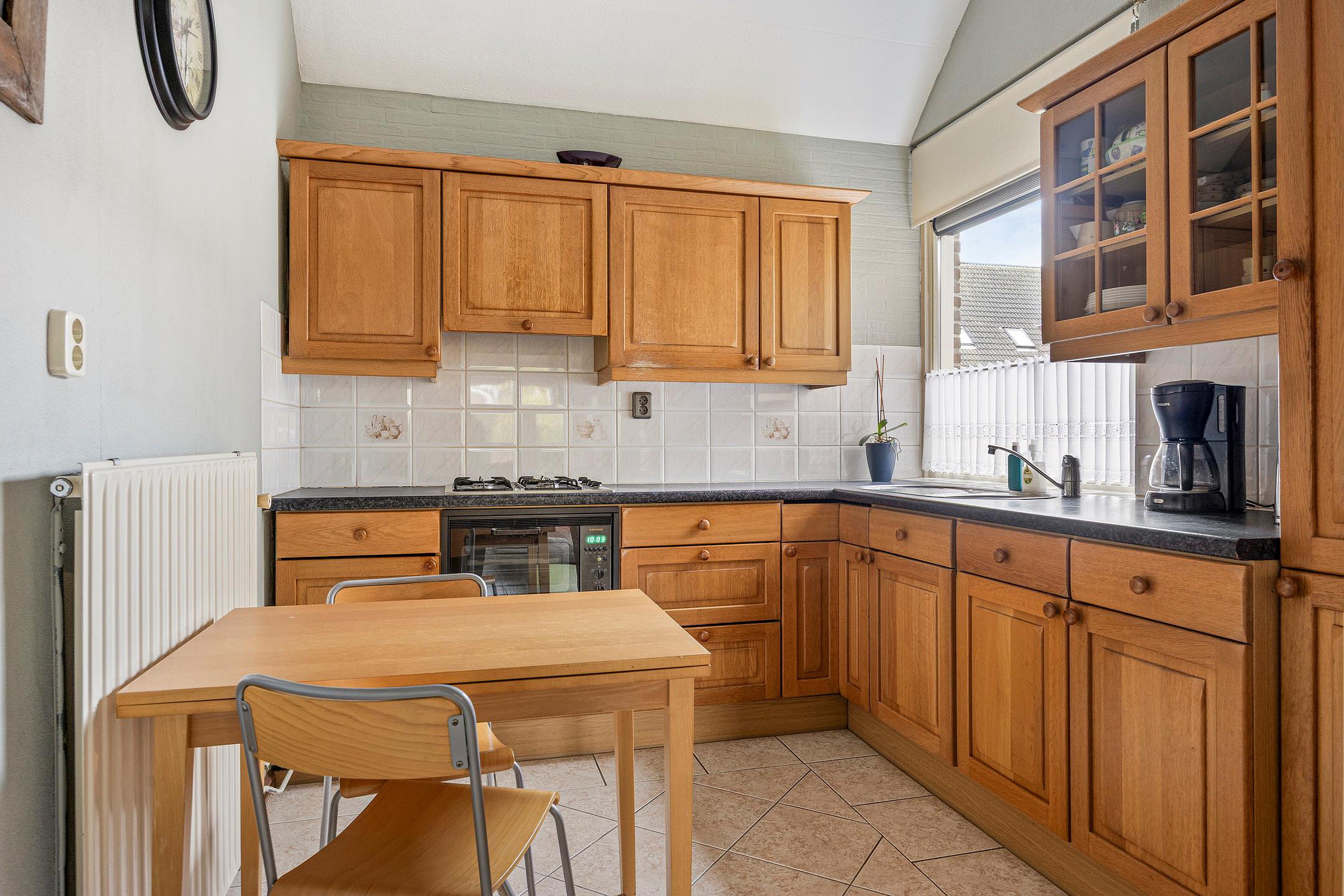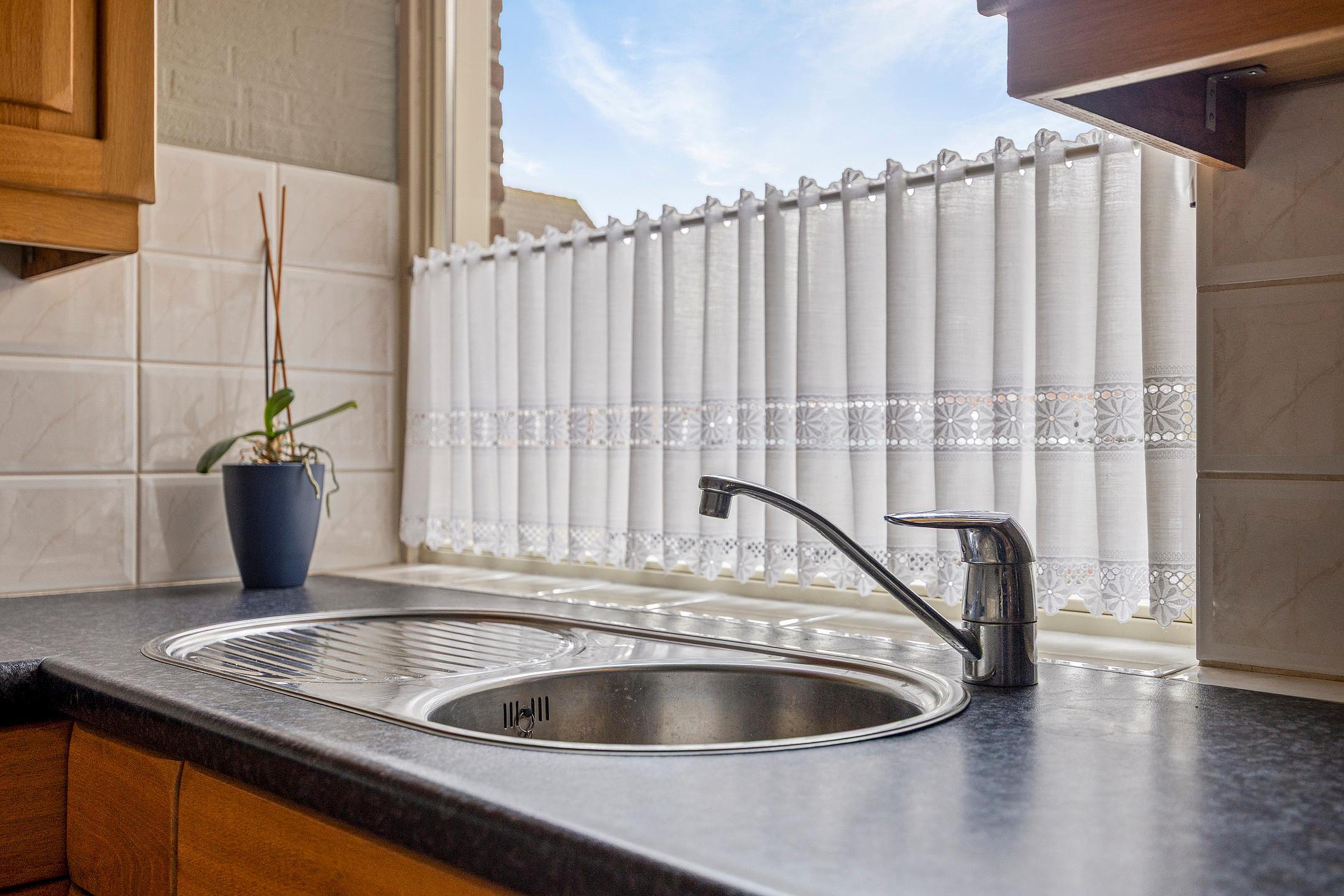 De keuken heeft een hoek opstelling en heeft een rvs spoelbak met mengkraan, 4 pits gastoestel met afzuigkap, een oven, koelkast en meerdere onder- en bovenkastjes. Er is plaats voor een klein tafeltje. Koken en eten kunnen hier goed samen.