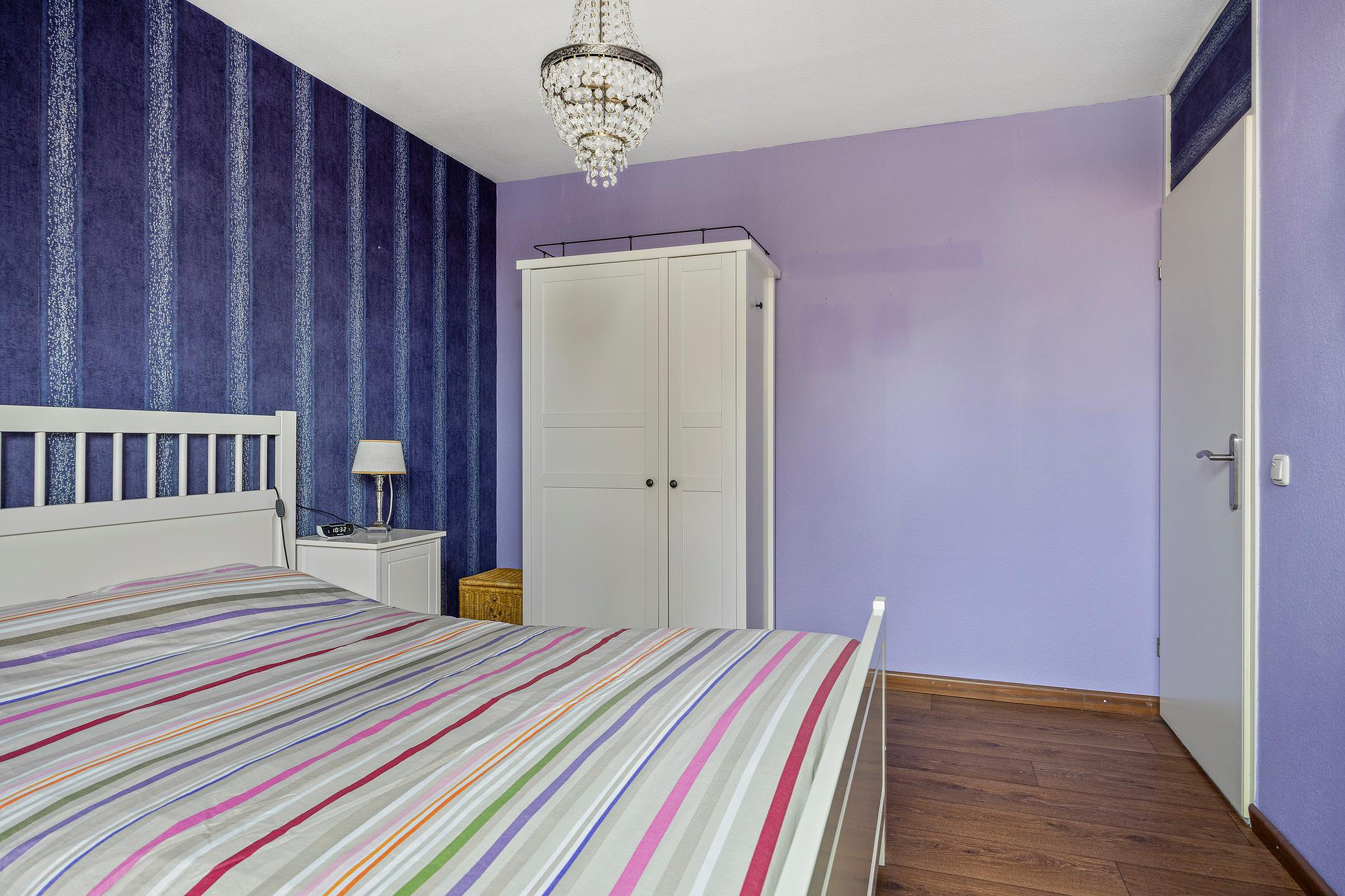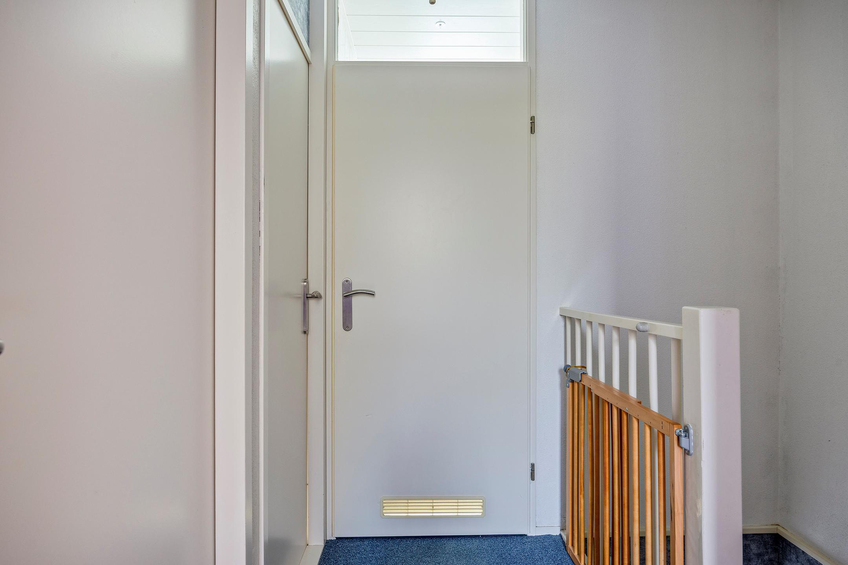 Grote slaapkamer Aan de achterkant ligt een ruime slaapkamer met een dakkapel. De vloer is voorzien van zeil.