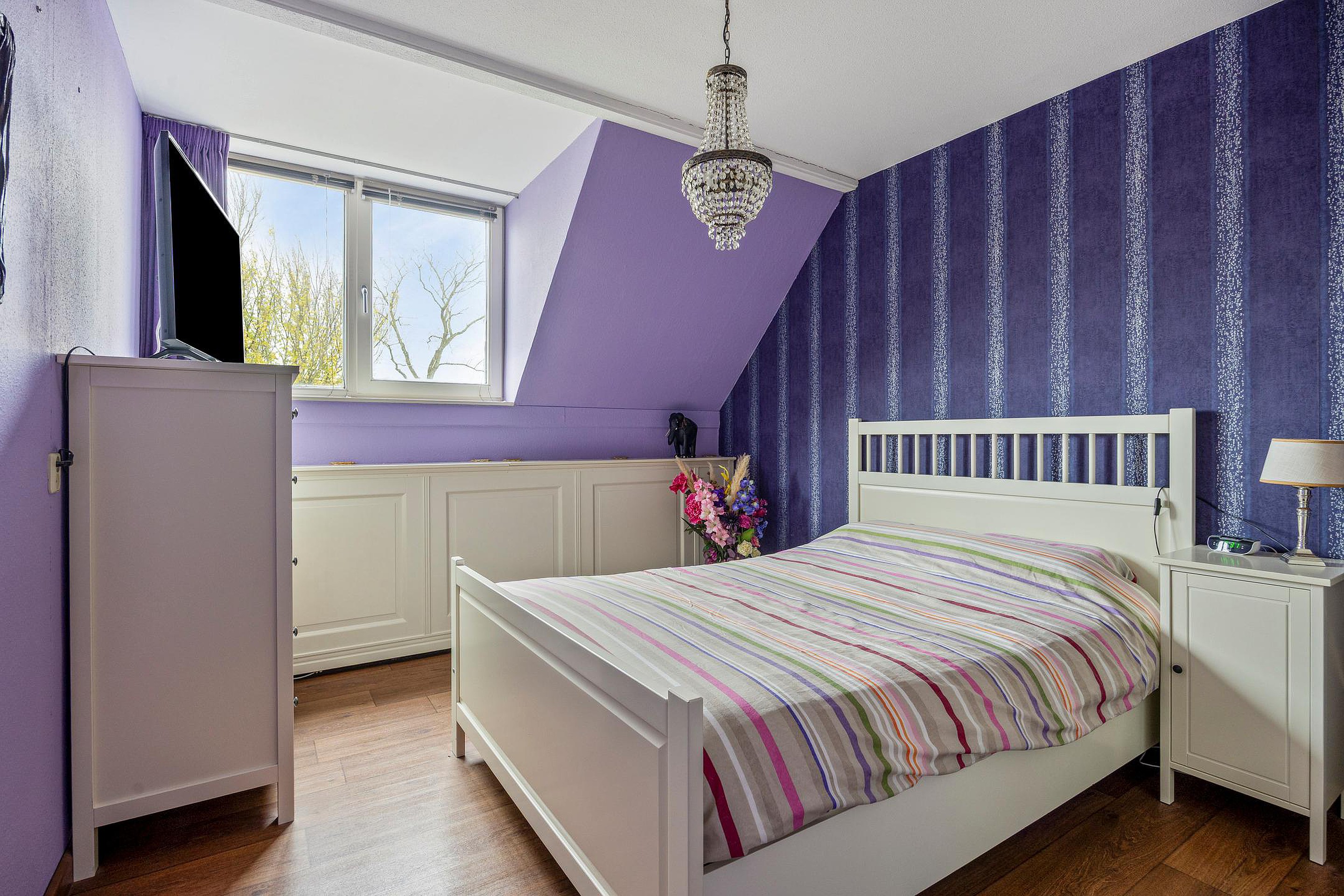 Aan de voorkant ligt een ruime slaapkamer met twee Velux dakramen. De vloer is afgewerkt met laminaat. De kamer voelt open en rustig.