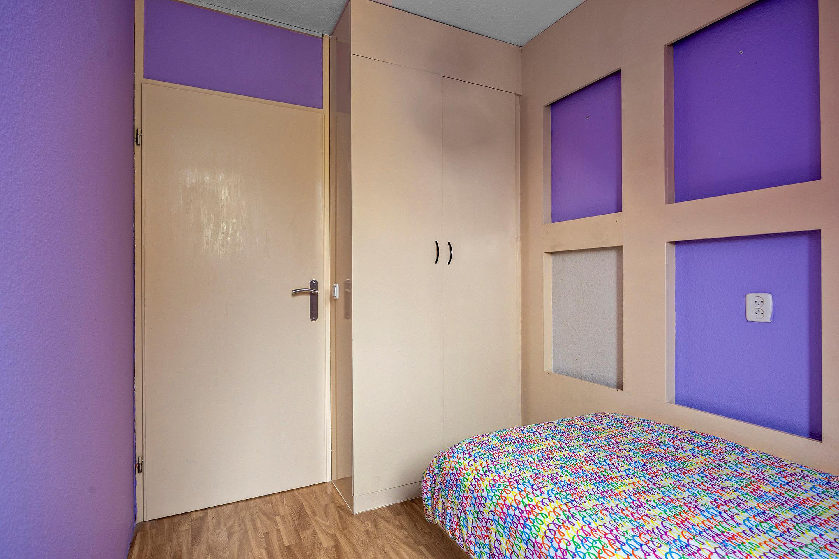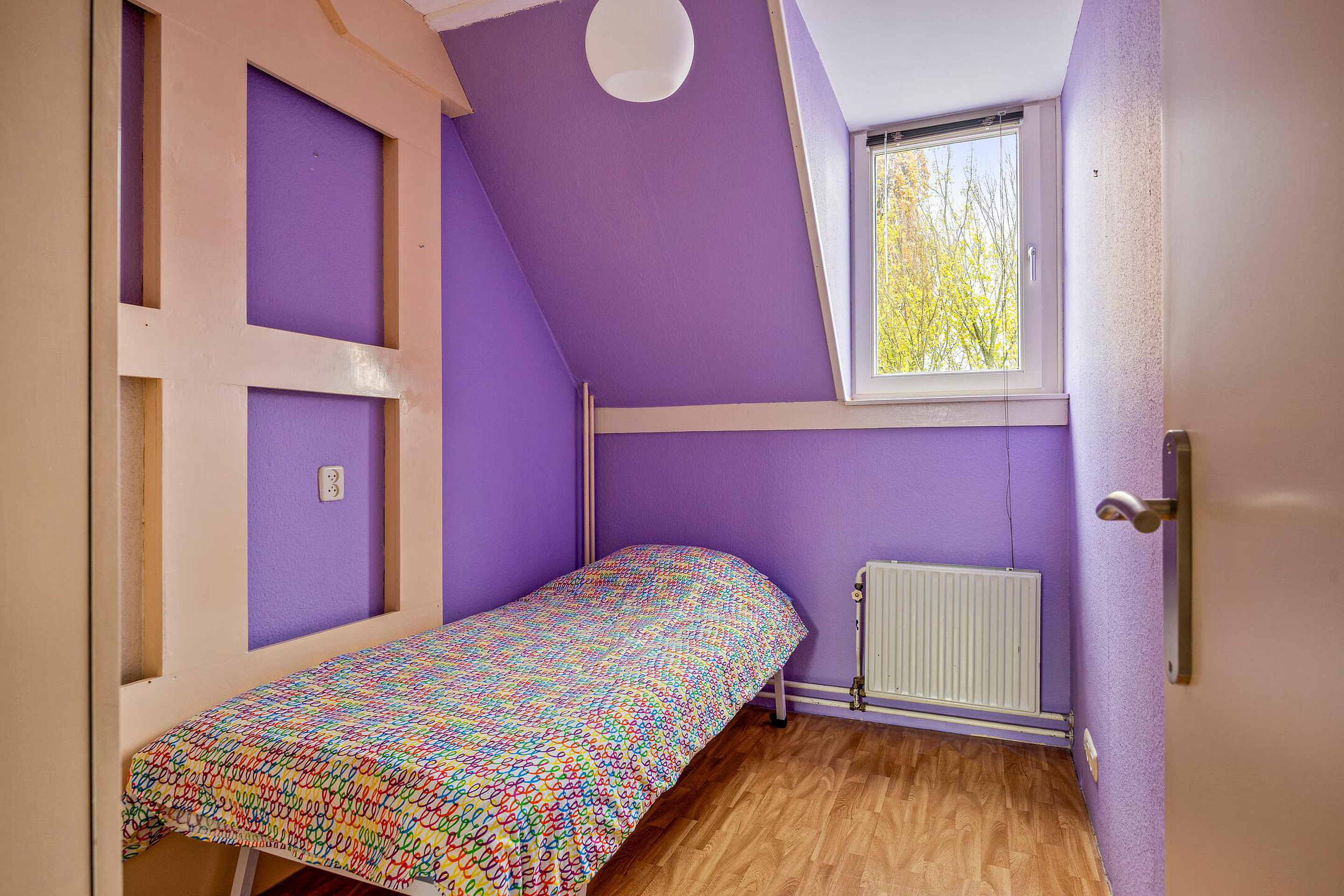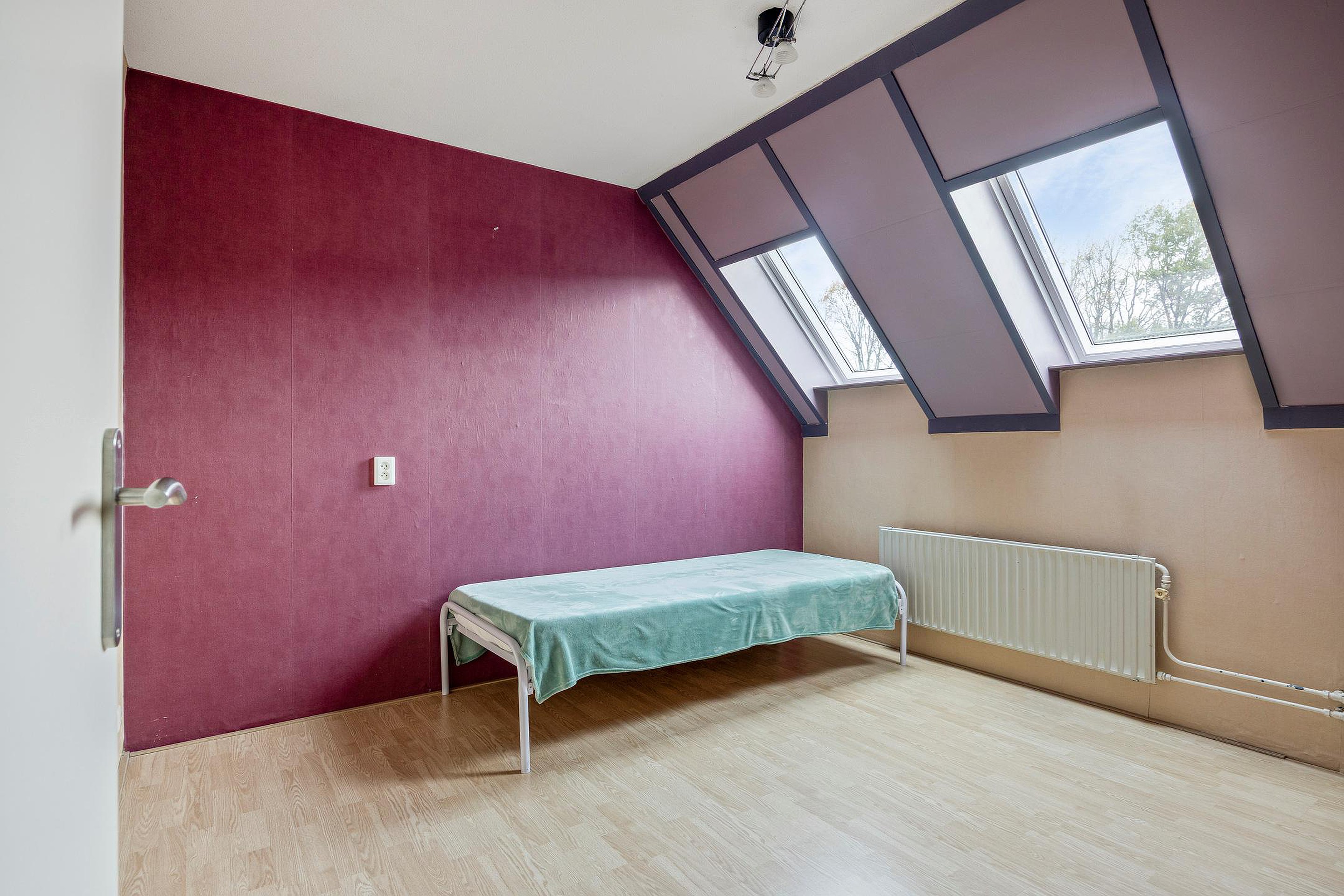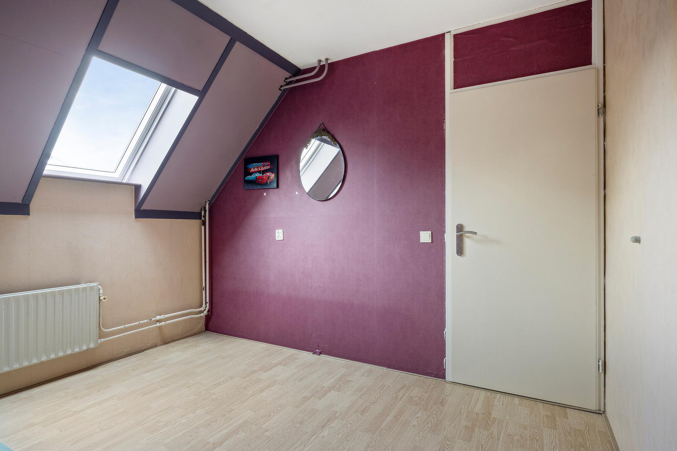 De derde slaapkamer ligt naast de grote achterkamer. Ook deze kamer heeft een dakkapel en ook hier is de vloer afgewerkt met zeil.