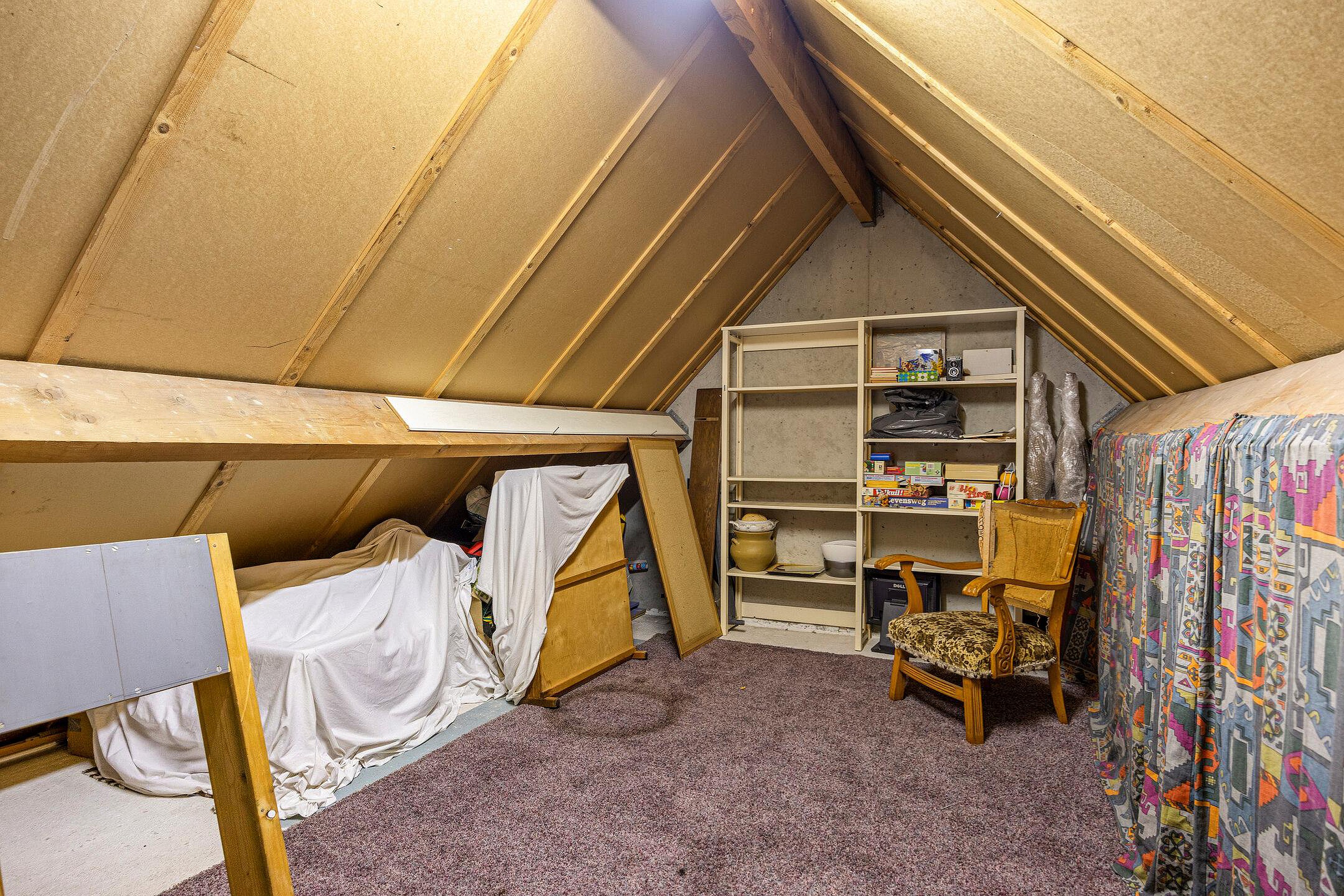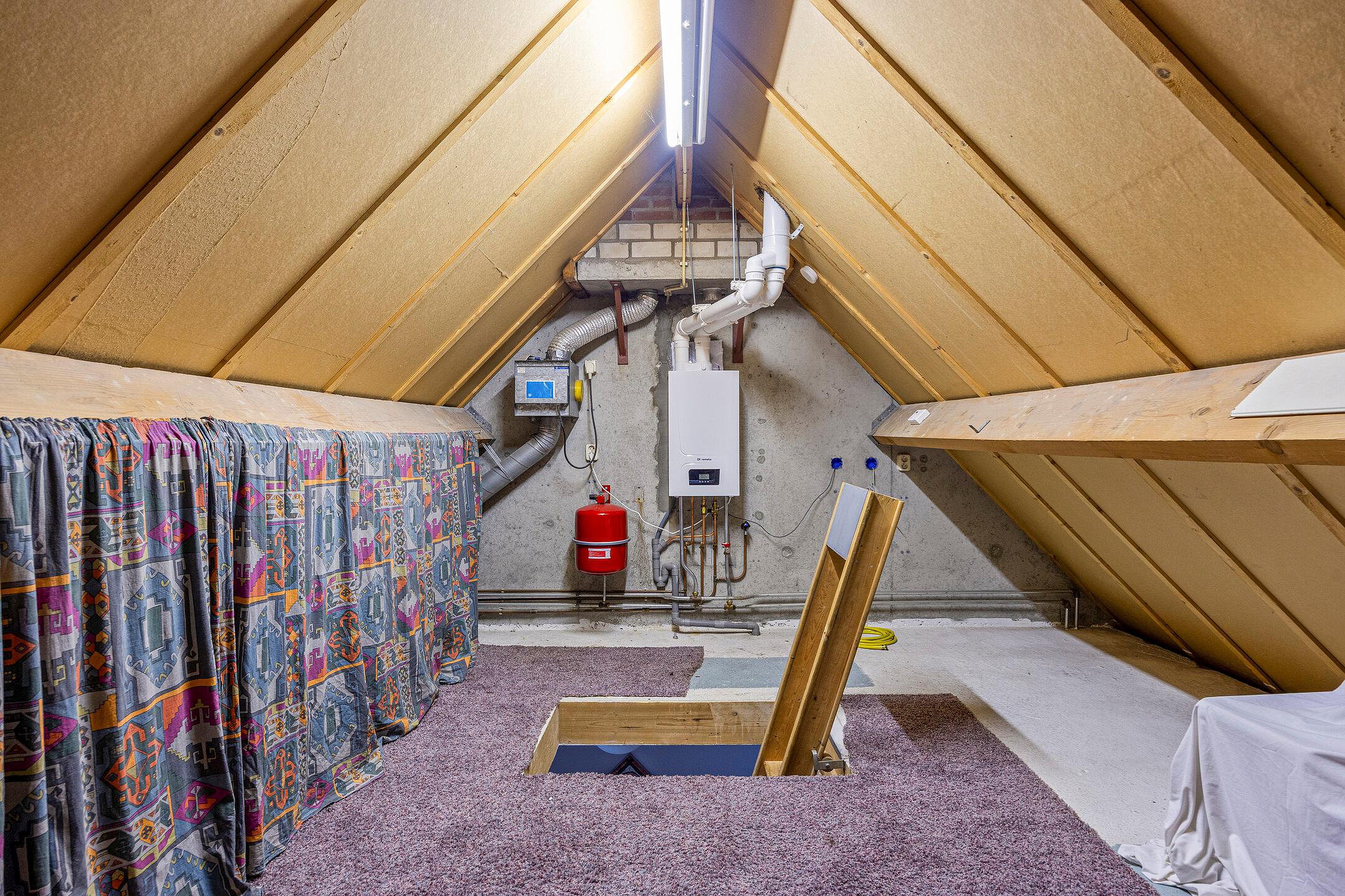 Tweede verdieping Via de vlizotrap bereik je de zolder. De ruimte heeft stahoogte en biedt praktische mogelijkheden. De Remeha HR-ketel uit 2024 staat hier opgesteld. Met het plaatsen van een vaste trap is hier eenvoudig een extra slaapkamer te realiseren.