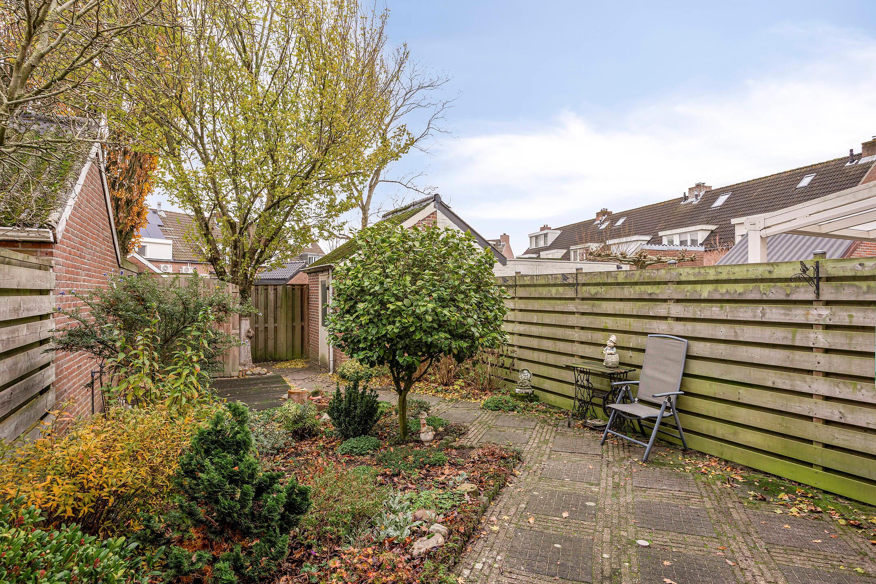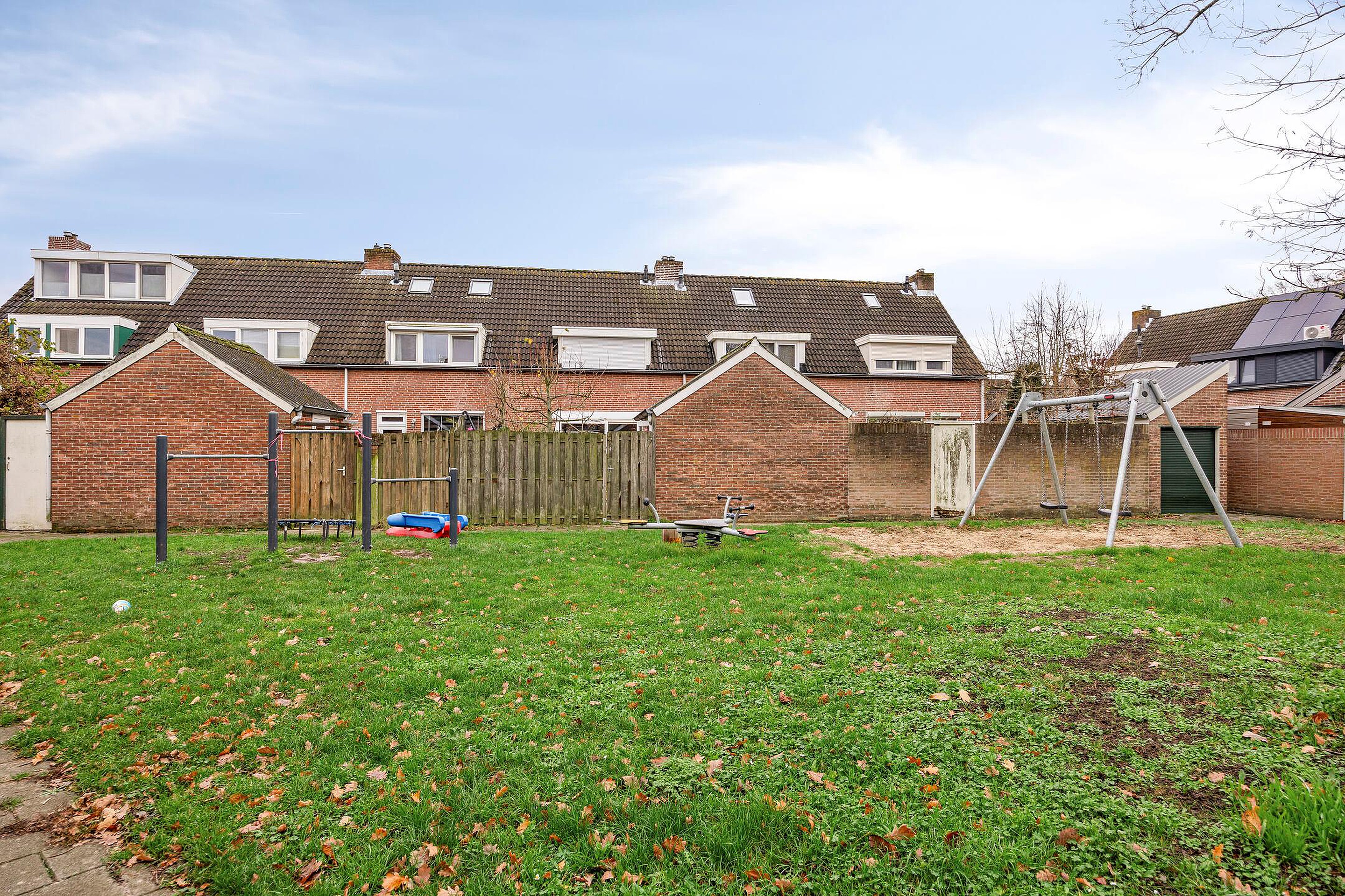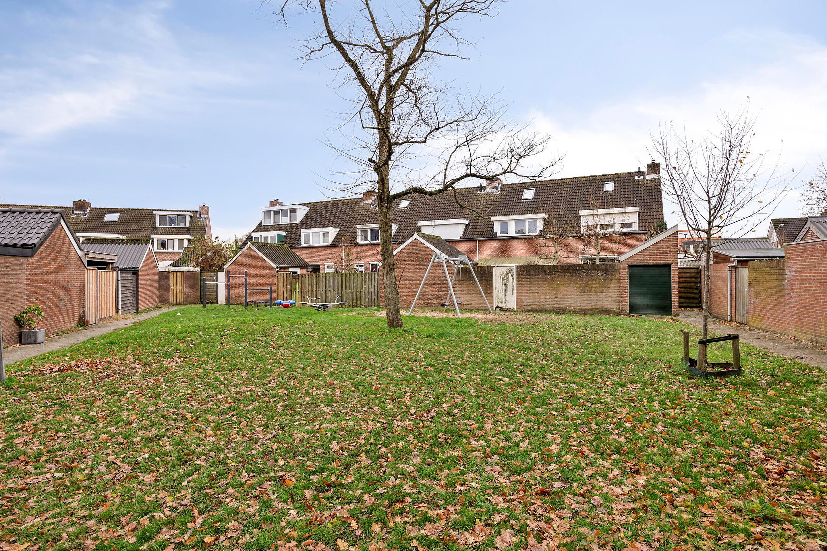 Tuin De achtertuin is ongeveer 14,50 meter diep en 6 meter breed. Achterin staat een stenen berging, handig voor het opbergen van fietsen, tuinmeubilair en andere spullen. Via de achterpoort kom je uit op een speelveld met een speeltuin, een fijne plek waar buurtkinderen en ouders elkaar ontmoeten.