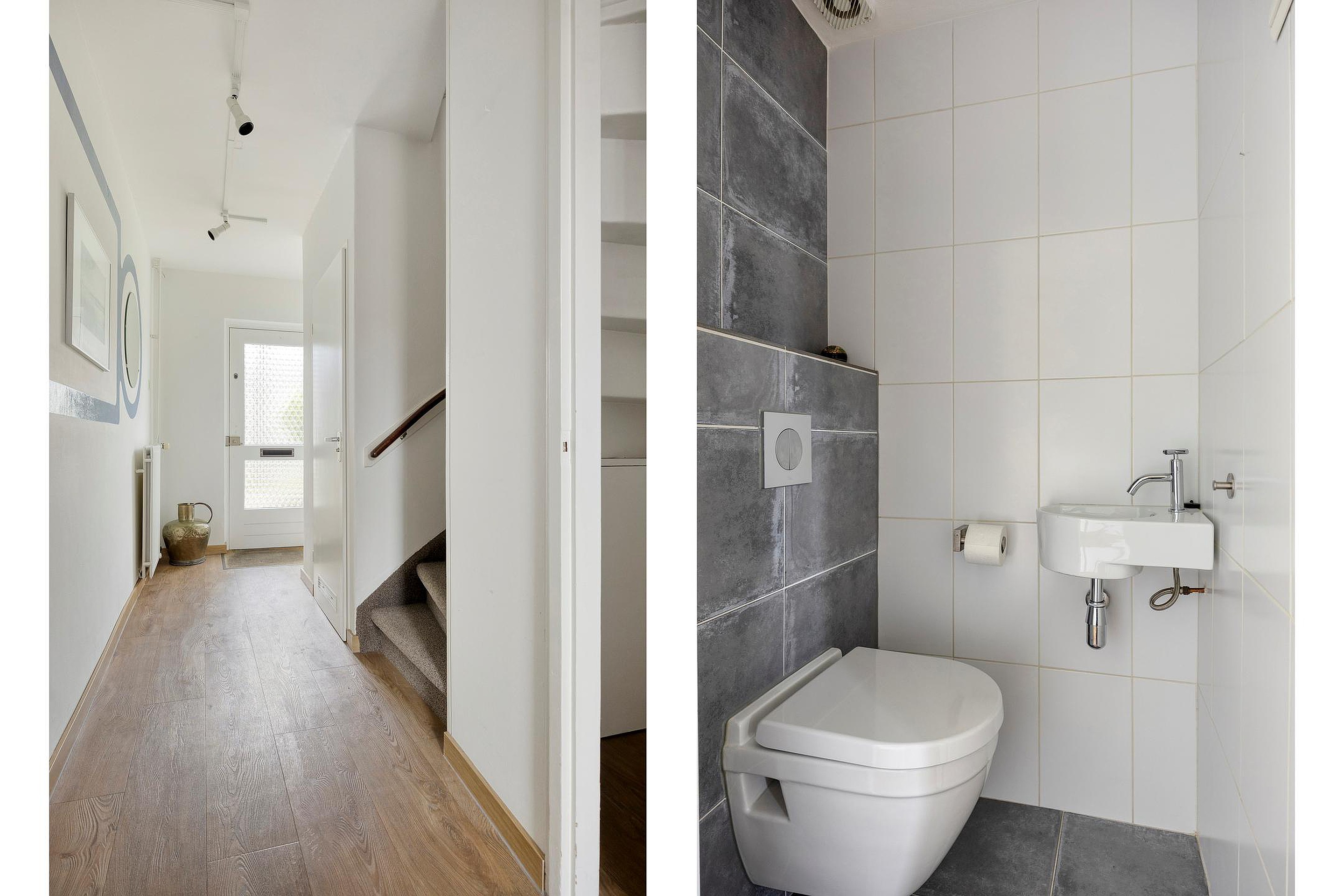 De hal is voorzien van een PVC vloer, een meterkast met opstelling van waterontharder, garderobegelegenheid, trapopgang naar de eerste verdieping. De hal biedt verder toegang tot de toiletruimte, woonkamer en keuken.