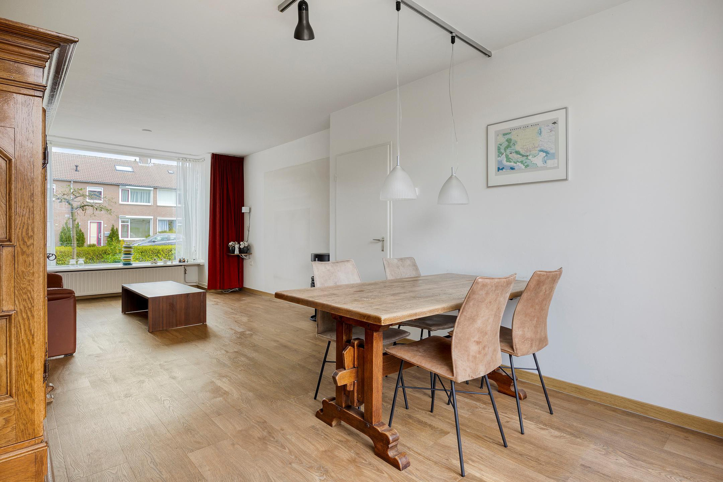 Doorzon woonkamer, afgewerkt met een PVC vloer, stucwerkwanden en -plafond, een erker aan de voorzijde en aan de achterzijde een loopdeur naar de tuin.