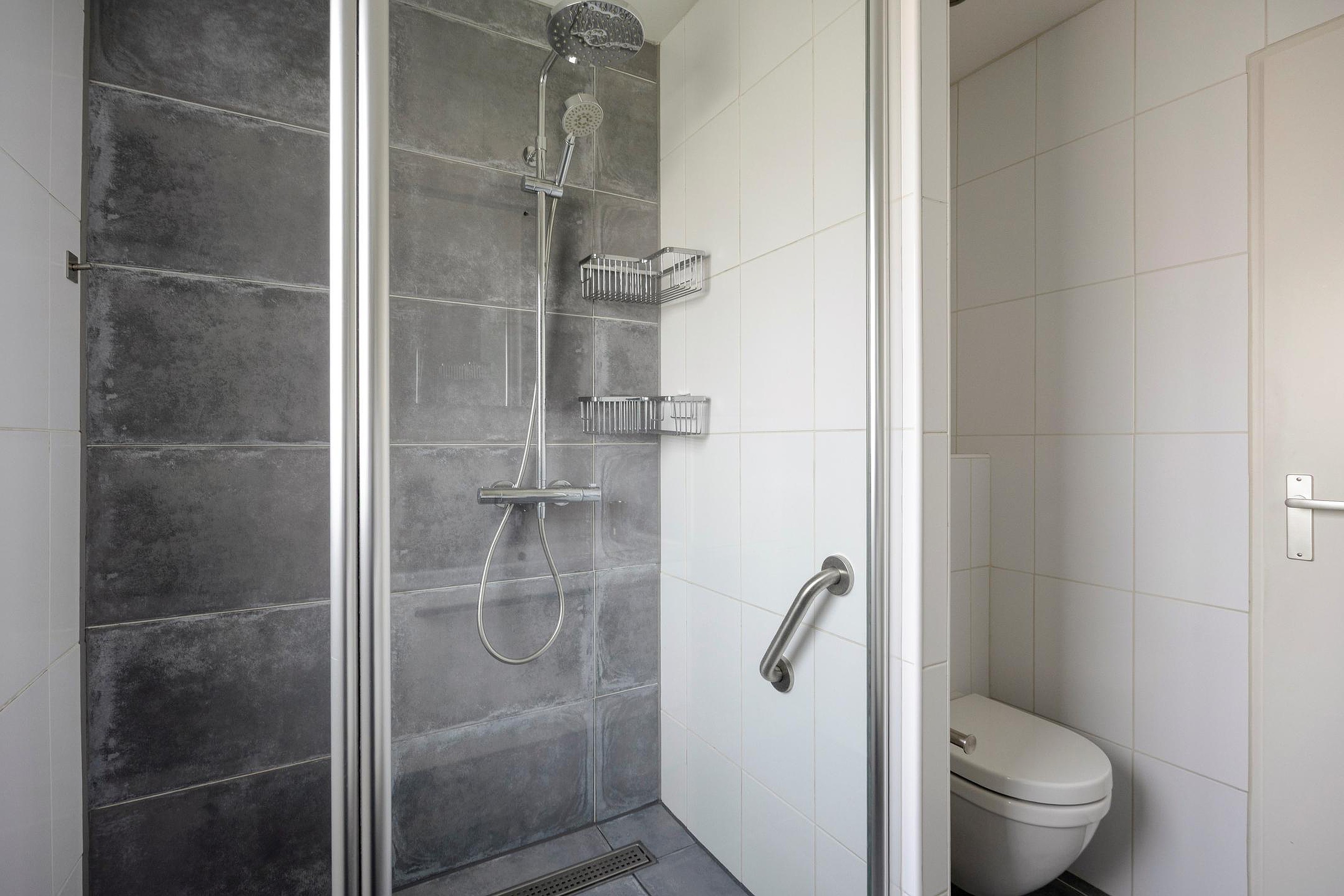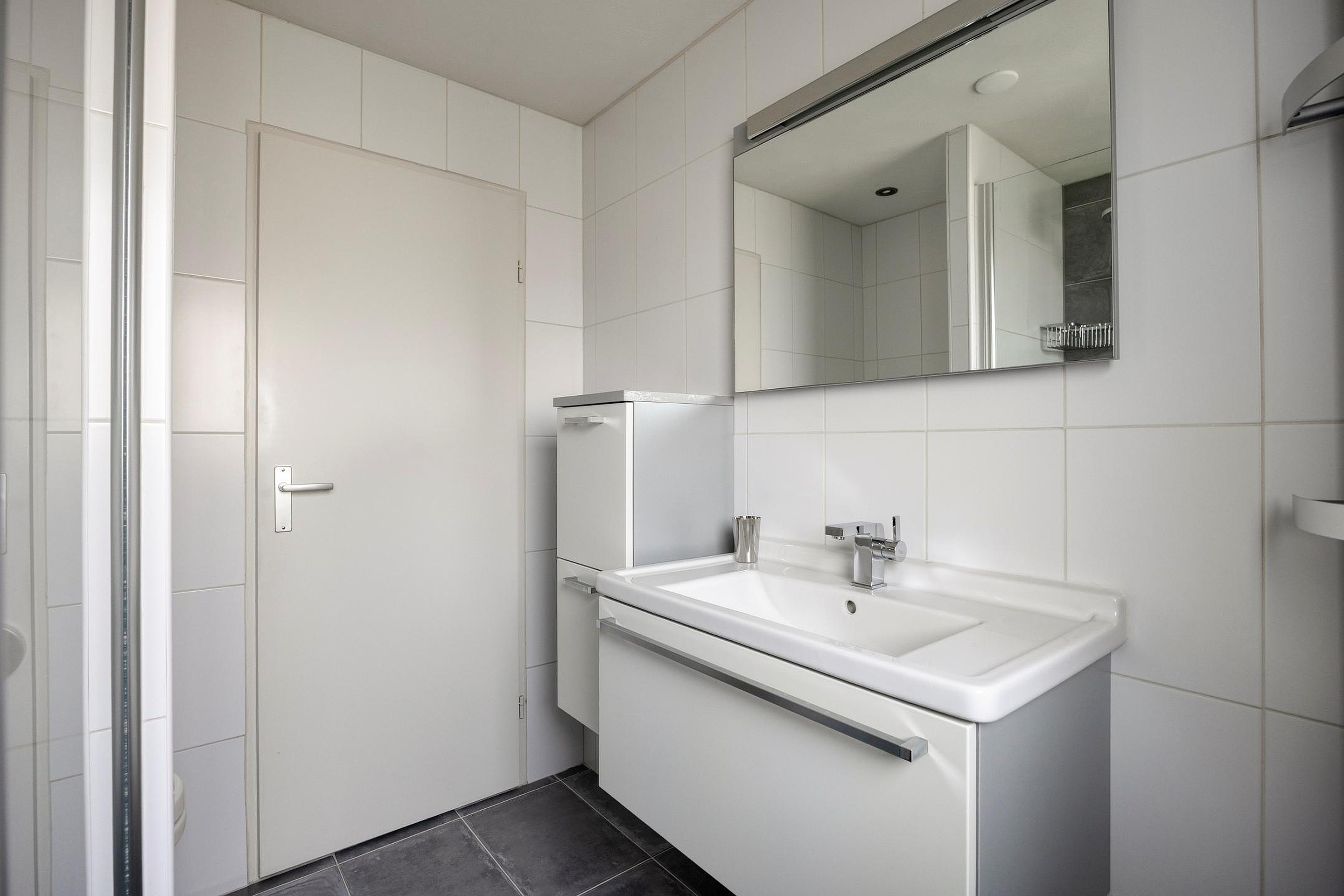 Geheel betegelde, moderne badkamer met badkamerkast, wastafelmeubel, design handdoekradiator, inloopdouche, wandcloset, mechanische ventilatie en een raam voor natuurlijke ventilatie en daglichttoetreding.