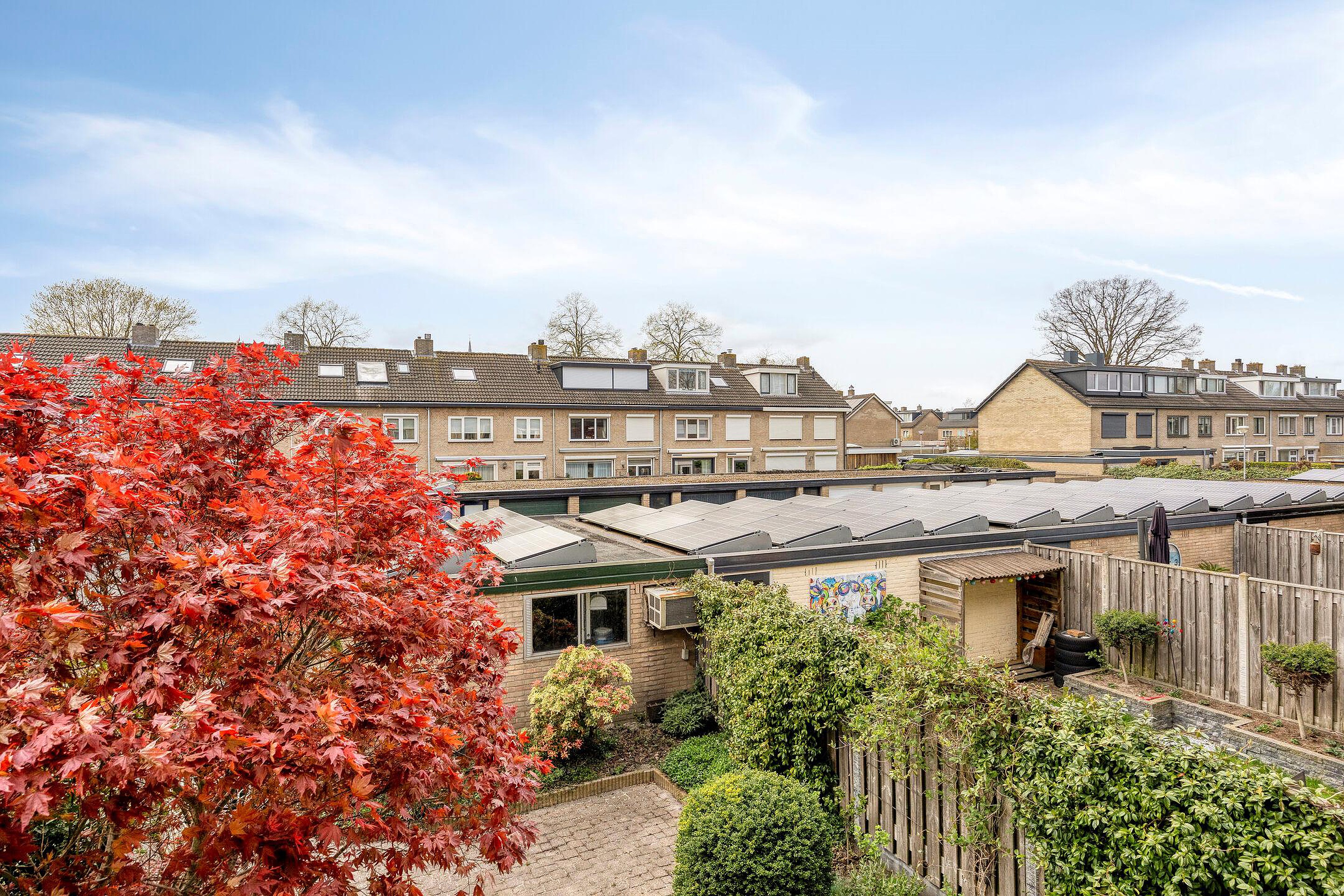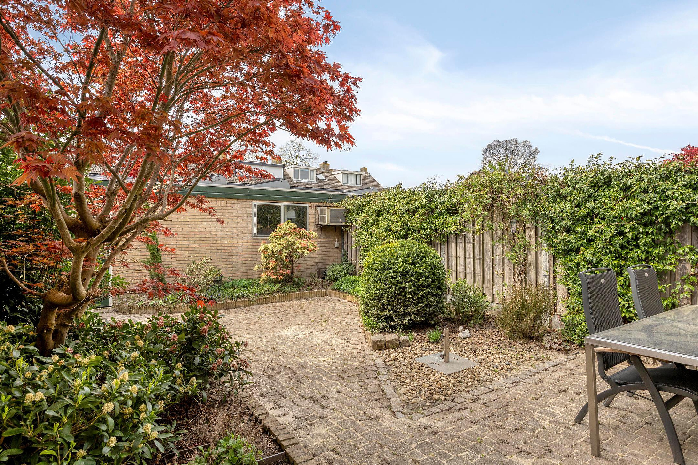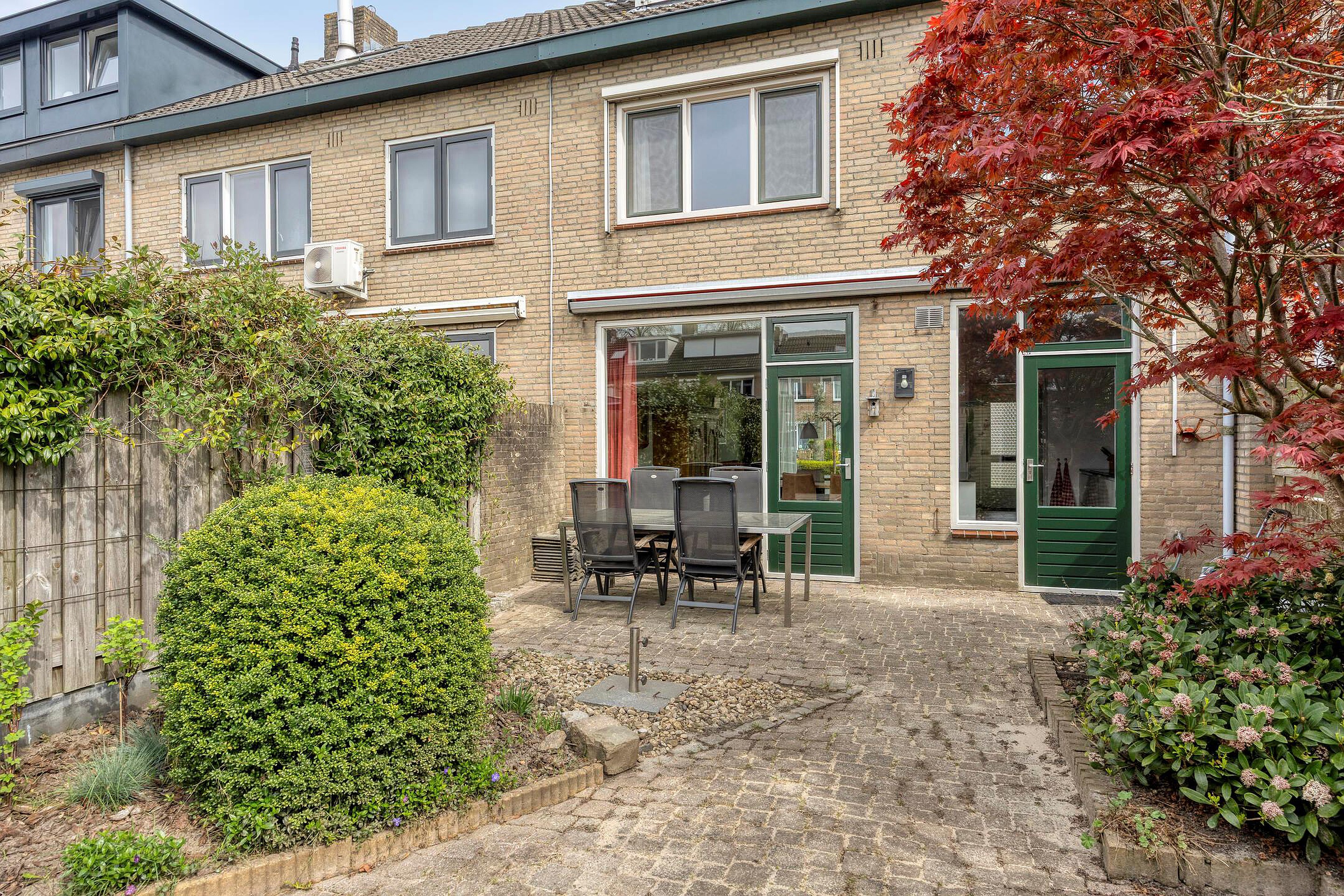 De privacy biedende achtertuin (circa 8,5 x 6 m.) is georiënteerd op het westen, grotendeels bestraat en voorzien van diverse borders met meerjarige beplanting, een buitenkraan en verlichting. Aan de achtergevel van de woning bevindt zich over de gehele breedte een zonnescherm.