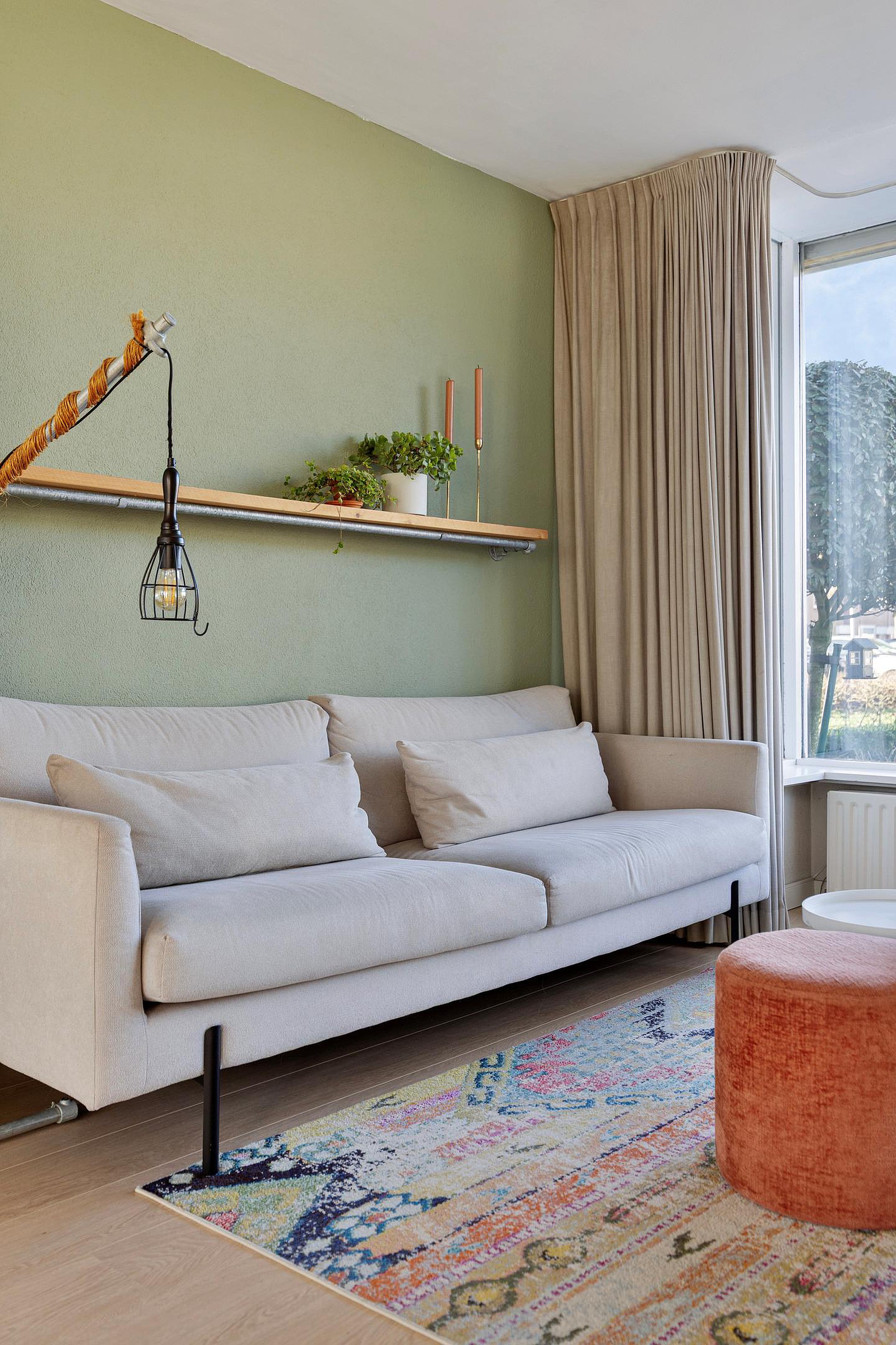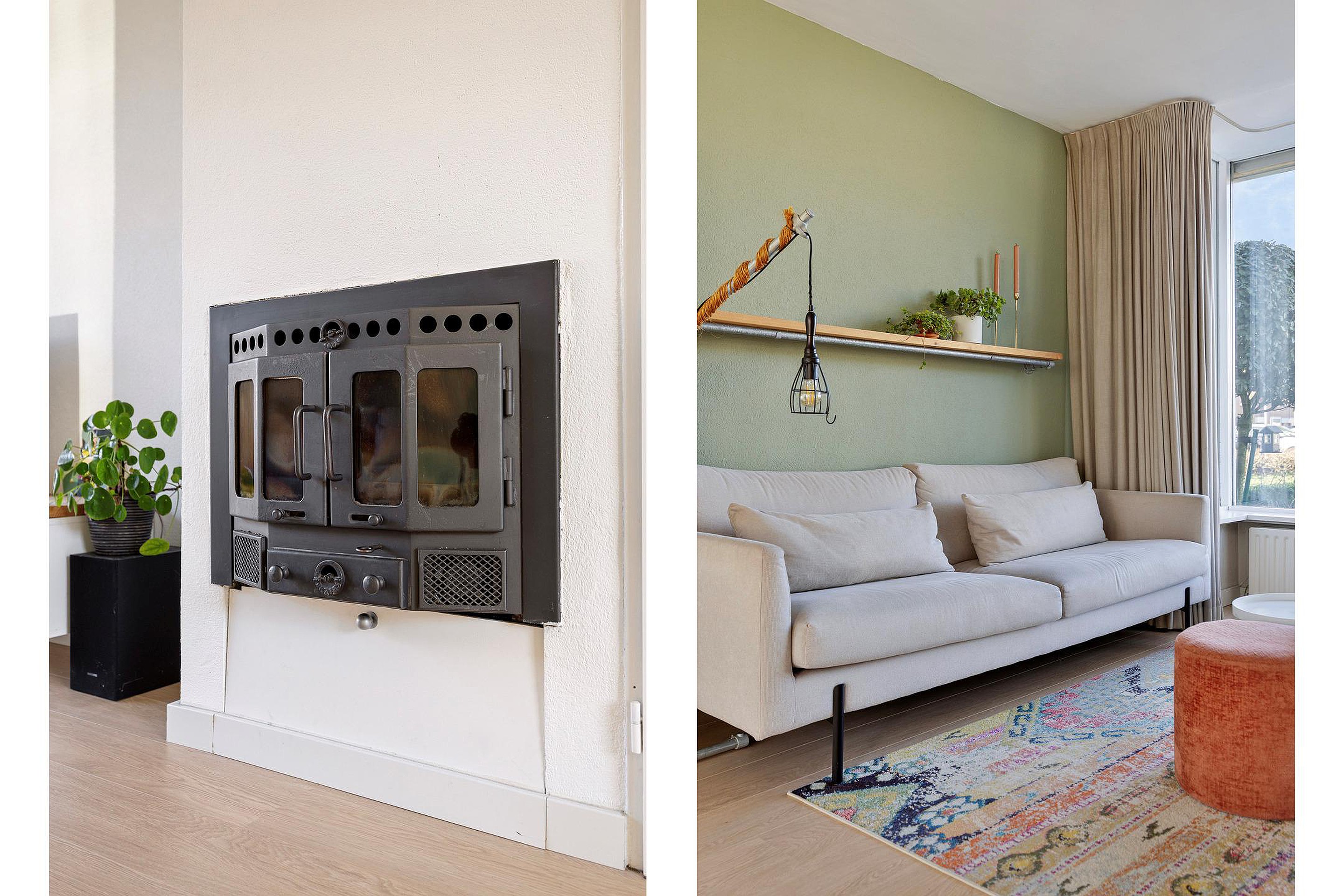 De doorzonwoonkamer is licht en afgewerkt met een laminaatvloer en spachtelputz wanden. Aan de voorzijde ligt de zithoek met uitzicht op het speeltuintje. Aan de achterzijde is ruimte voor de eethoek, in open verbinding met de keuken. In de woonkamer staat een allesbrander die jaarlijks wordt onderhouden