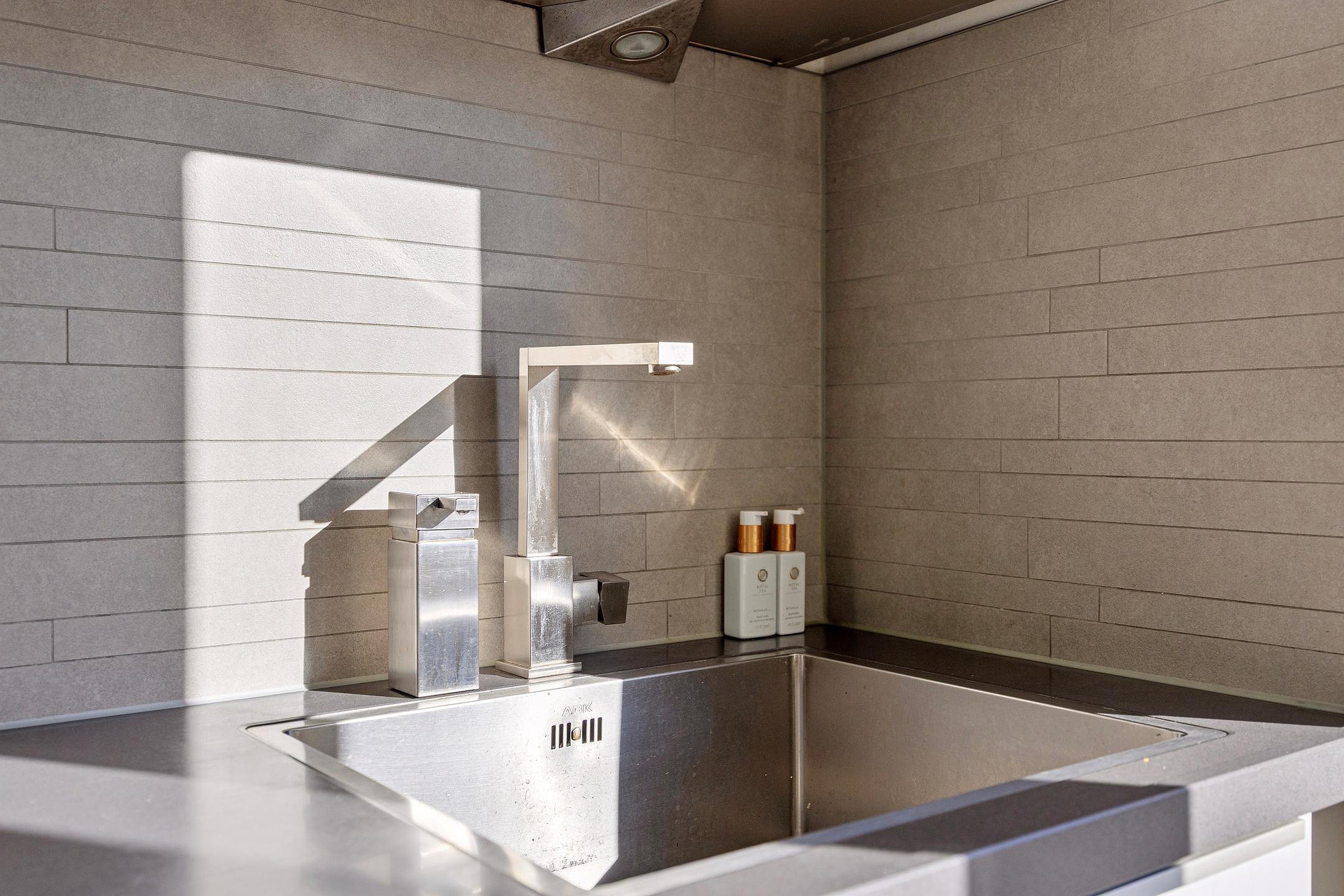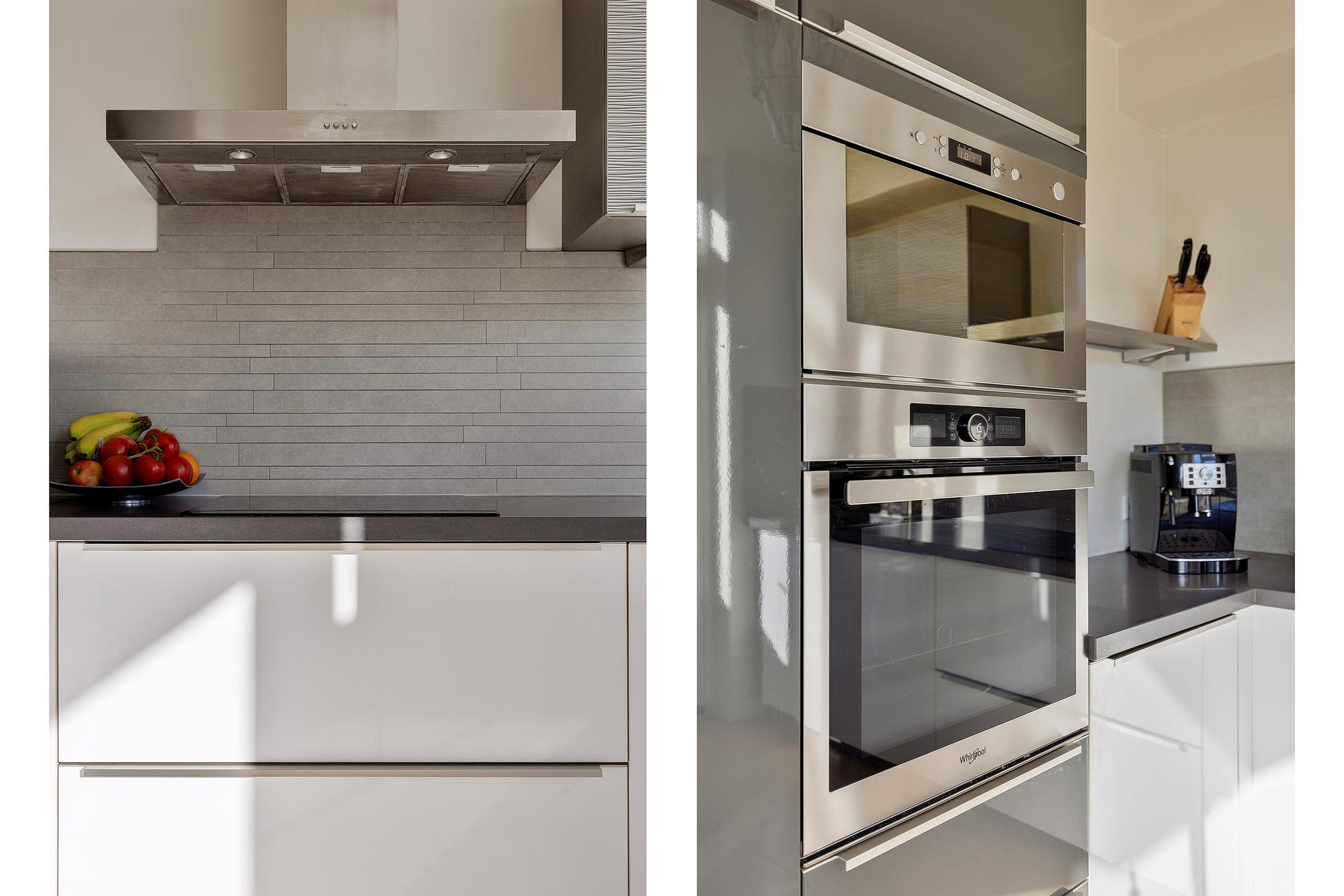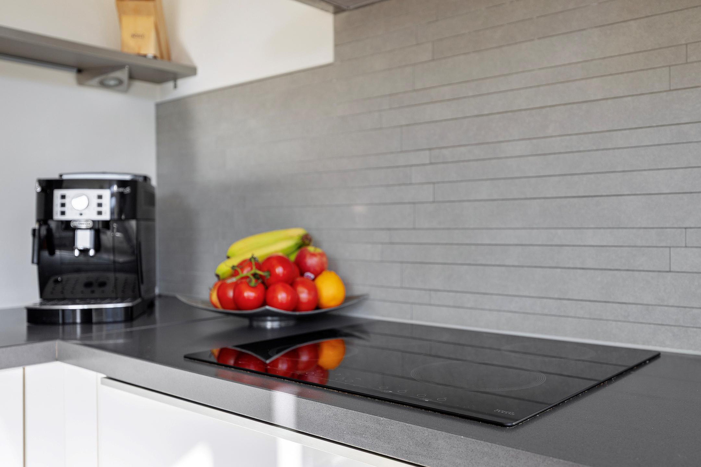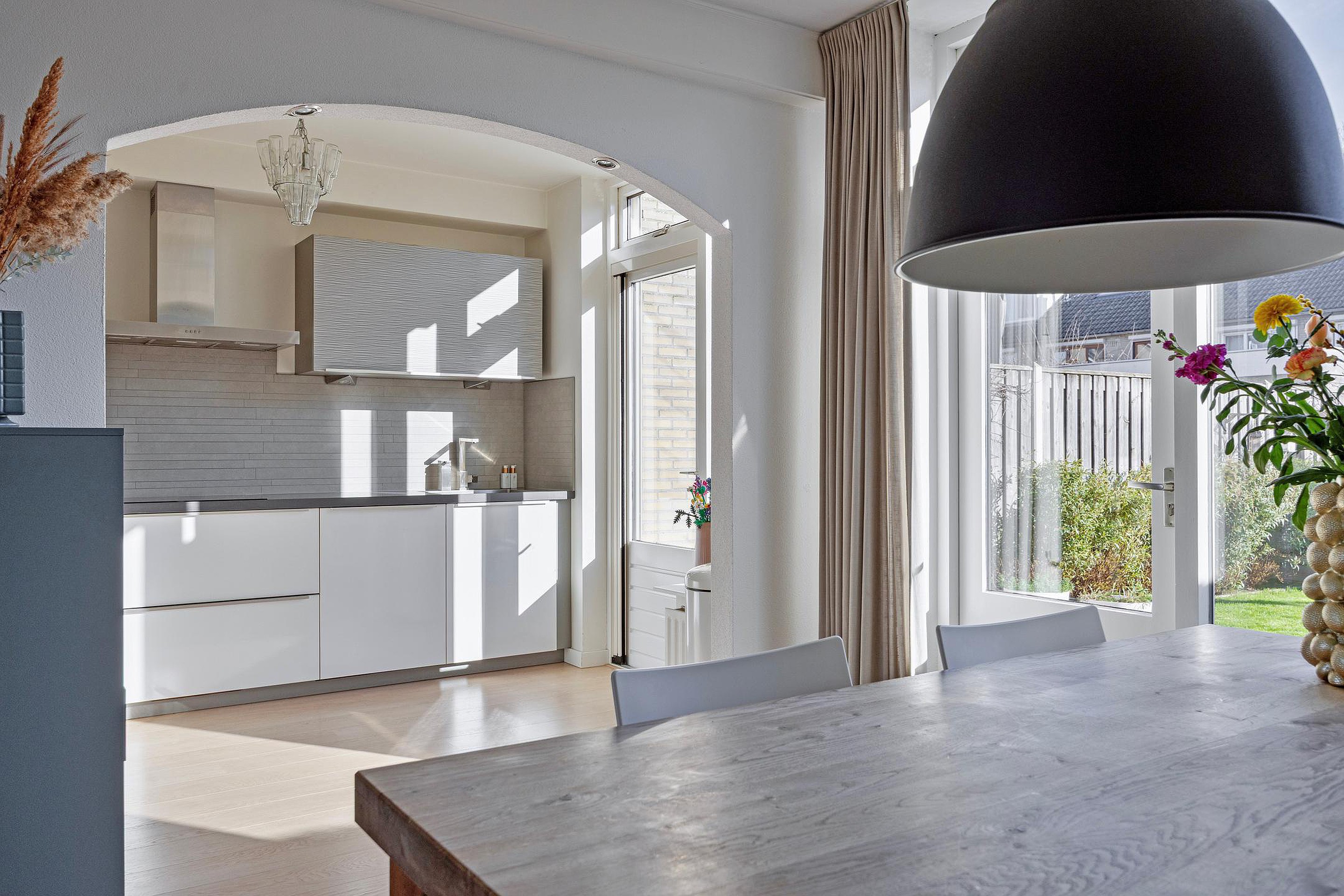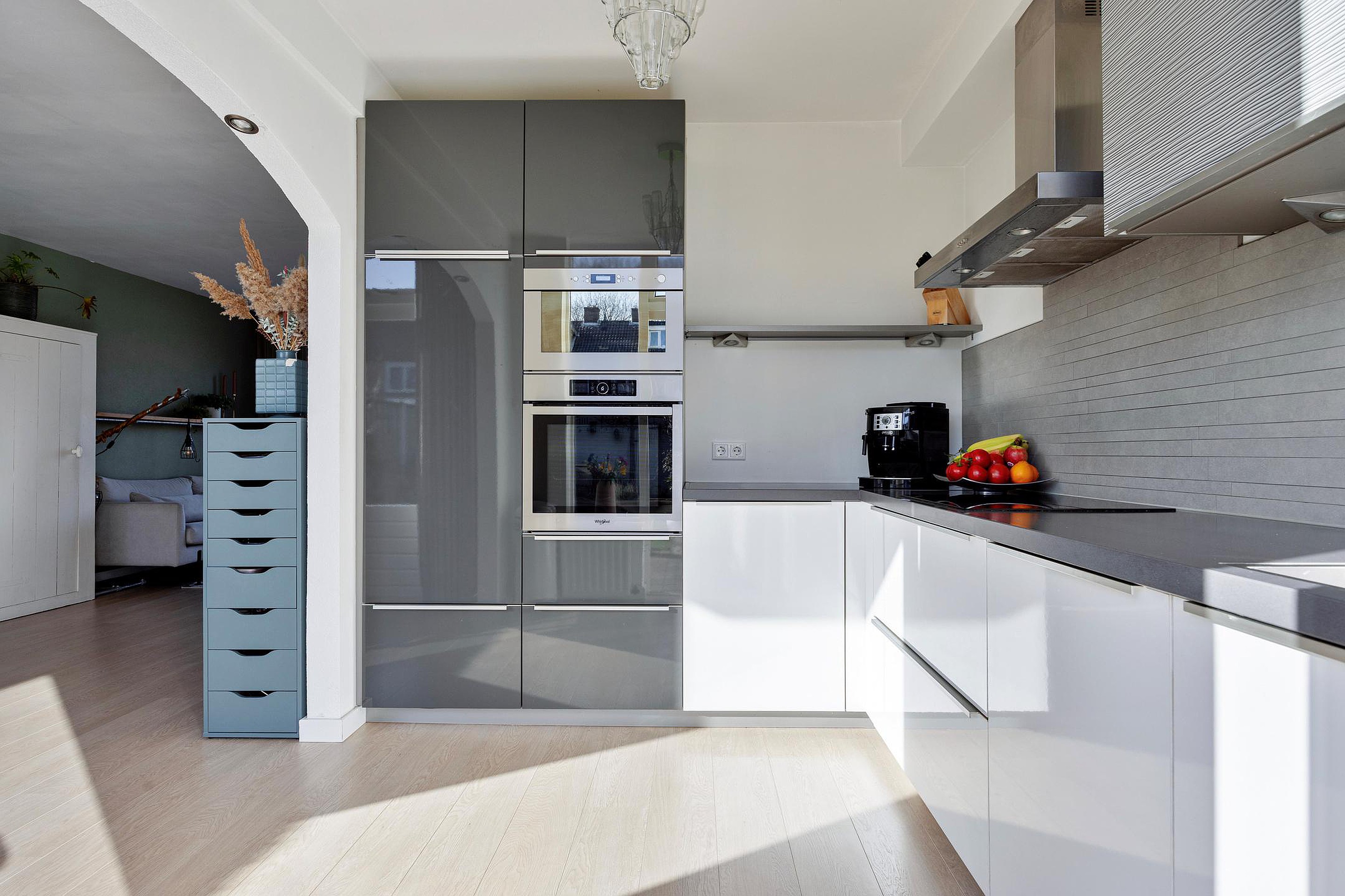 De open keuken is opgesteld in een hoek en voorzien van onder- en bovenkasten. De keuken is uitgerust met een koelkast, oven, combimagnetron, inductiekookplaat, afzuigkap, spoelbak en vaatwasser. Vanuit de keuken is er een loopdeur naar de achtertuin.