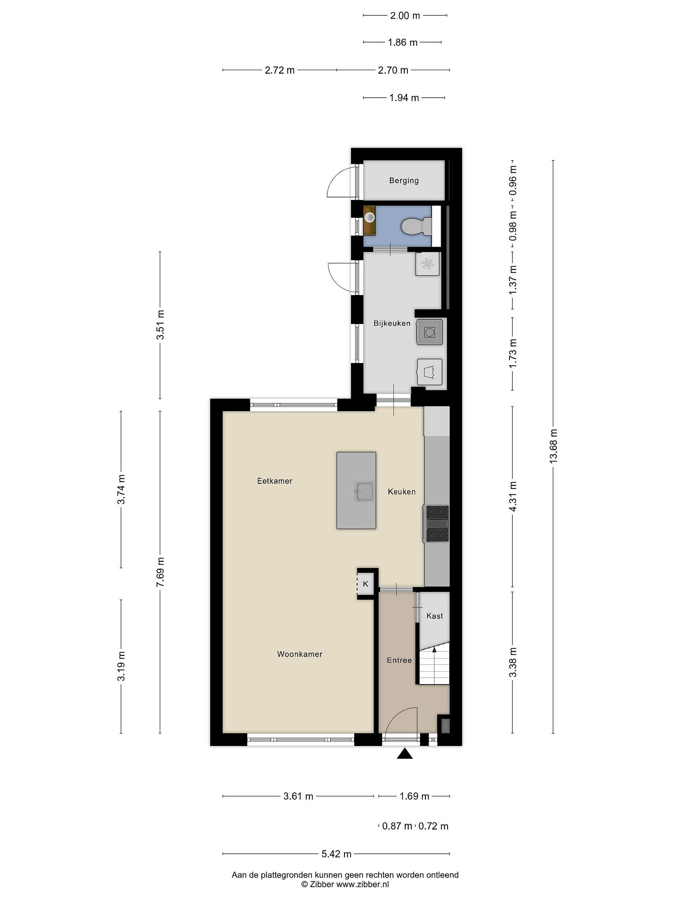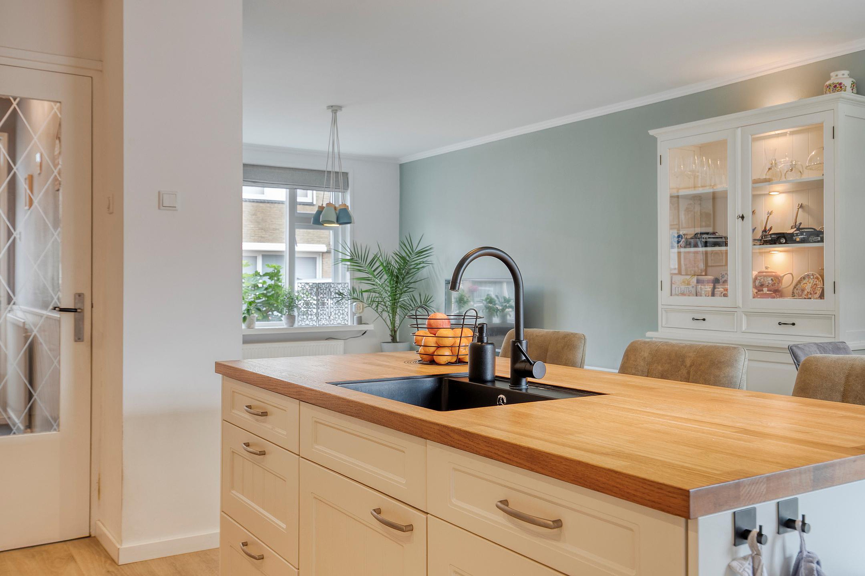 Via de hal met meterkast stap je de lichte woonkamer binnen. Dankzij de ramen aan zowel de voor- als achterzijde geniet je van veel daglicht. De open keuken is voorzien van een spoeleiland – praktisch en gezellig voor wie van koken en samenzijn houdt. Achter de keuken ligt de bijkeuken met Nefit CV-ketel (2009), aansluitingen voor witgoed en toegang tot het toilet met fonteintje.
