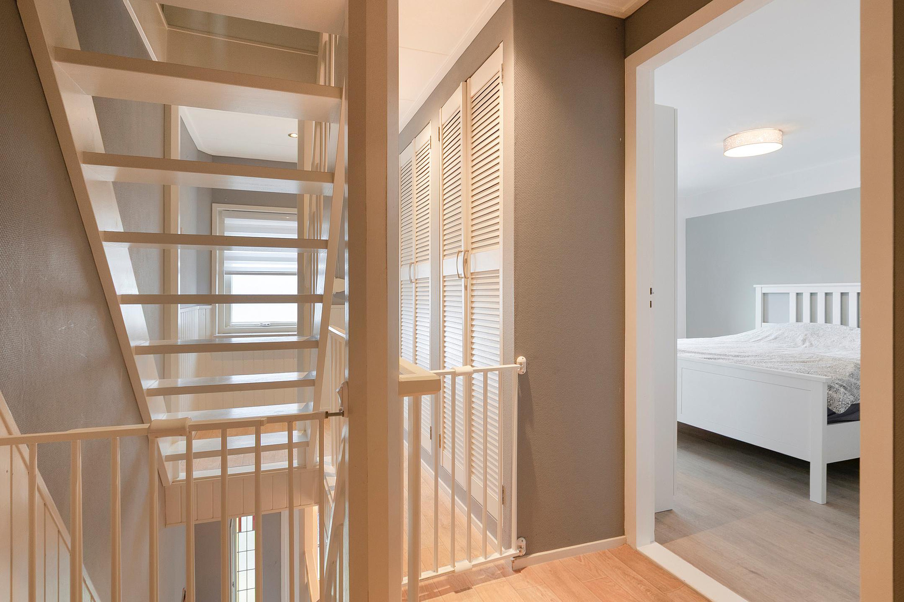 Een vaste trap leidt naar de tweede verdieping. Links vind je een ruime bergruimte, ideaal voor opslag. Daarnaast is hier de derde slaapkamer met dakkapel, die zorgt voor veel lichtinval en uitzicht over de achtertuin. De zolder is al zo ver afgewerkt dat de wanden behangklaar zijn – klaar om er je eigen invulling aan te geven.