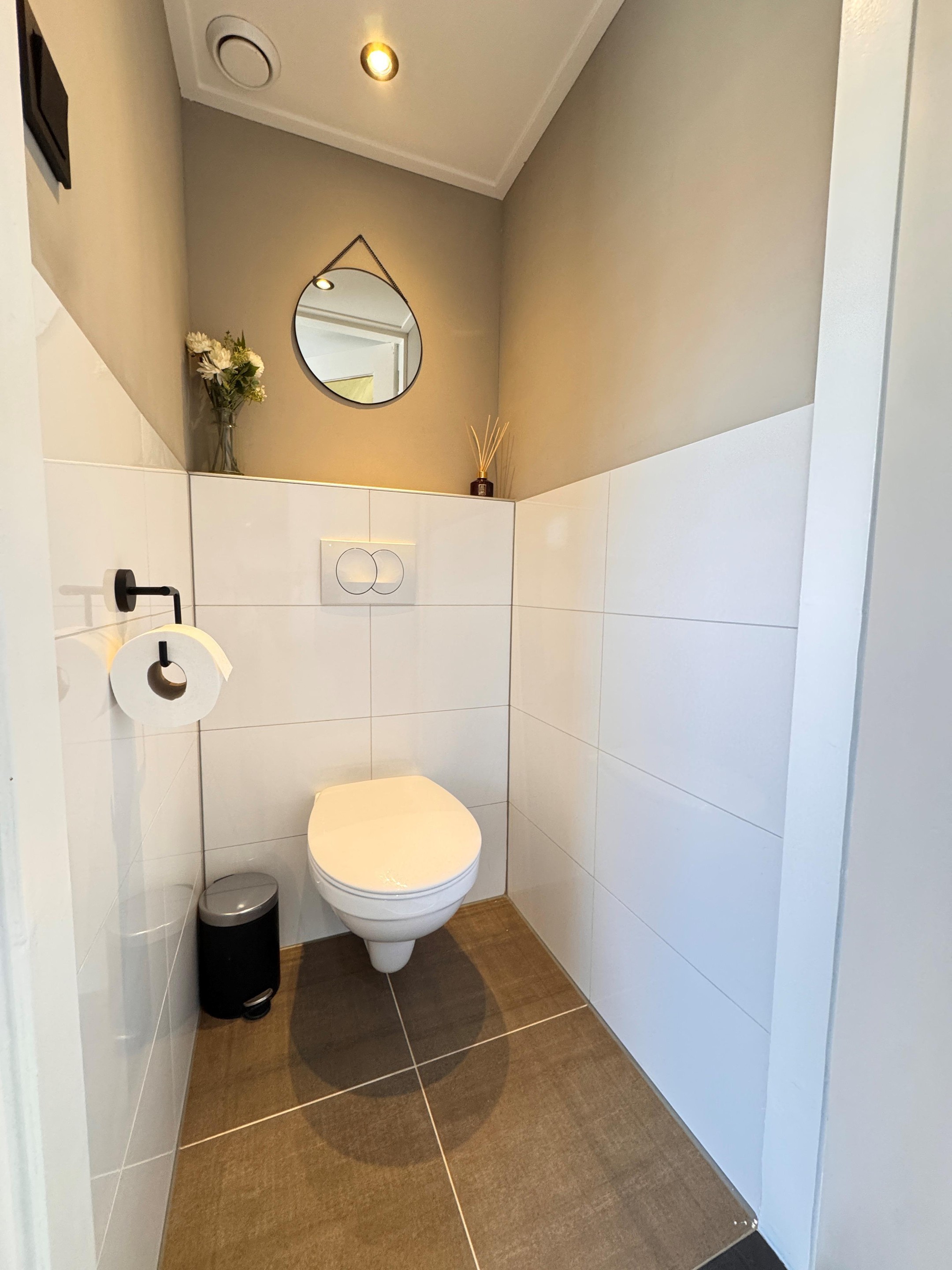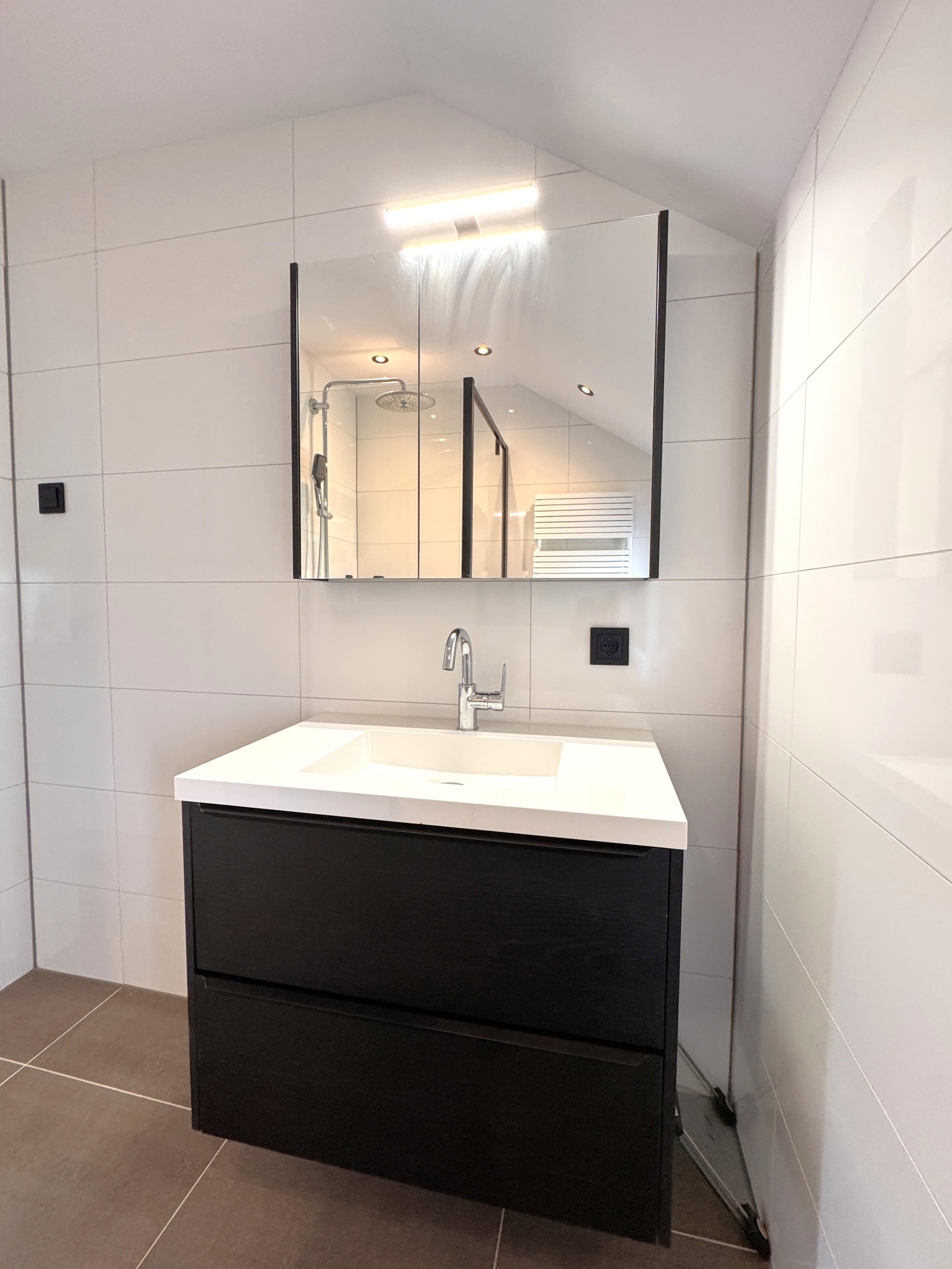De woning beschikt over drie slaapkamers, perfect voor een gezin of om een thuiswerkplek te creëren. De badkamer is modern uitgevoerd met een stijlvol wastafelmeubel en een inloopdouche met glazen wand.